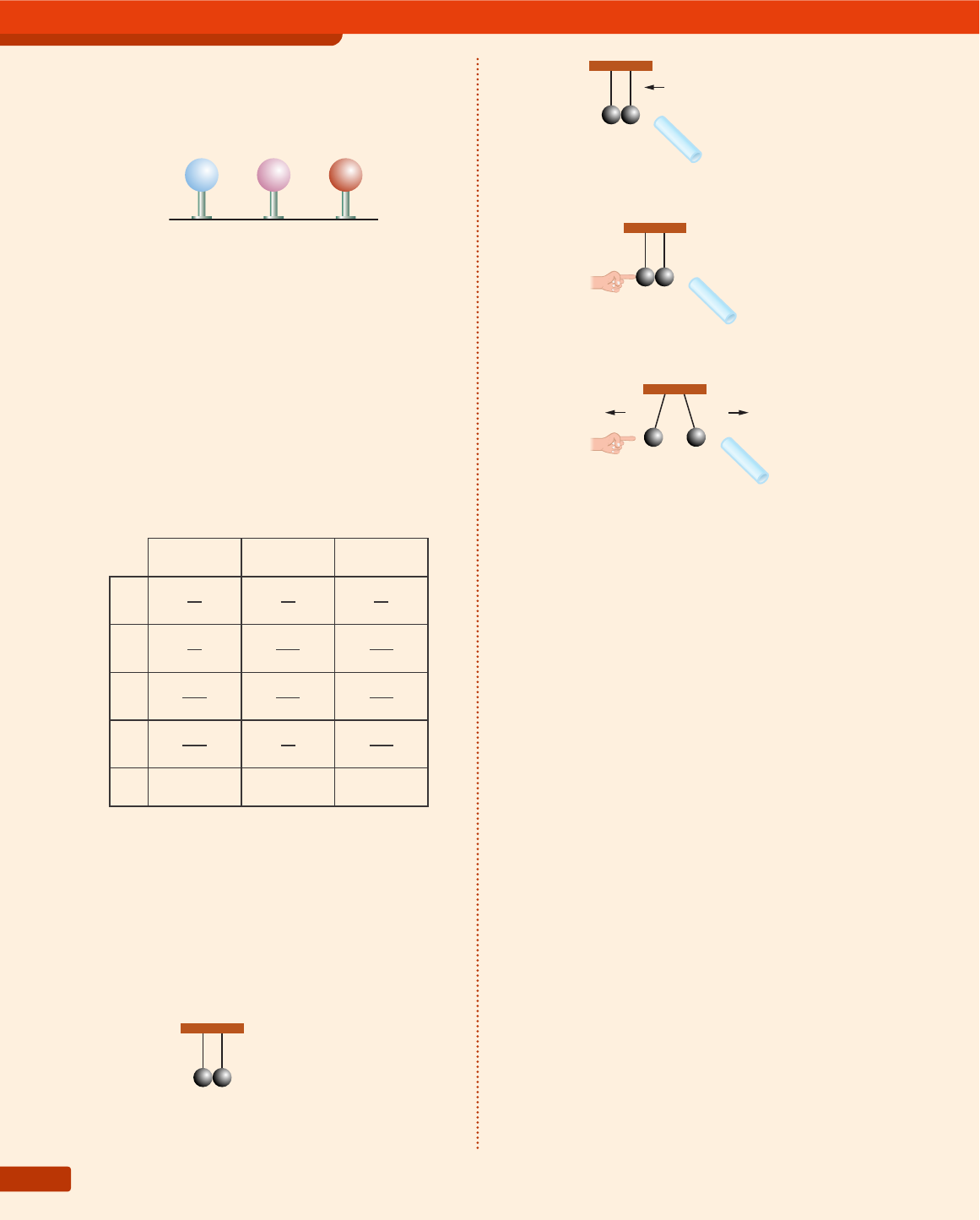 Capítulo 9176 Exercícios de Aprofundamento 31. (Fuvest-SP) Três esferas metálicas M 1 , M 2 e M 3 , de mesmo diâmetro e montadas em suportes iso- lantes, estão bem afastadas entre si e longe de outros objetos. Q M 1 M 2 Q M 3 Inicialmente, M 1 e M 3 têm cargas iguais, com valor Q, e M 2 está descarregada. São realizadas duas operações, na sequência indicada: I. A esfera M 1 é aproximada de M 2 até que ambas fiquem em contato elétrico. A seguir, M 1 é afastada até retornar à sua posição inicial. II. A esfera M 3 é aproximada de M 2 até que ambas fiquem em contato elétrico. A seguir, M 3 é afastada até retornar à sua posição inicial. Após essas duas operações, as cargas nas esferas serão cerca de: M 1 M 2 M 3 a) Q 2 Q 4 Q 4 b) Q 2 3Q 4 3Q 4 c) 2Q 3 2Q 3 2Q 3 d) 3Q 4 Q 2 3Q 4 e) Q zero Q 32. Duas esferas metálicas, A e B, inicialmente neu- tras, encontram-se suspensas por fios isolantes, presas a um suporte horizontal (fig. 1). Aproxima- se das esferas, sem tocá-las, um bastão eletrizado positivamente (fig. 2) e, mantendo o bastão pró- ximo, toca-se rapidamente uma das esferas com uma das mãos (fig. 3). A mão é, então, afastada, e, logo depois, afasta-se o bastão (fig. 4). BA Figura 1. BA + + + ++ + + + Figura 2. BA + + + ++ + + + Figura 3. B + + + ++ + + + A Figura 4. Ao final desse processo, as esferas estarão: a) A e B negativas. b) A e B positivas. c) A negativa e B positiva. d) A neutra e B negativa. e) A negativa e B neutra. 33. Até o século XIX a eletricidade conhecida era apenas a estática, a qual era obtida por atrito entre duas substâncias diferentes. Vamos repro- duzir um experimento de Eletrostática: • Atrita-se uma resina plástica em um pedaço de vidro, estando ambos inicialmente neutros, e se observa que o vidro adquiriu uma quantida- de de eletricidade positiva Q 1 e a resina, uma quantidade de carga negativa Q 2 . • Um pedaço de ebonite contém uma quantida- de de carga elétrica positiva Q 3 . • As três peças eletrizadas são colocadas simul- taneamente em contato entre si e verifica-se que as quantidades de eletricidade se modifi- caram, tendo o vidro ficado com Q V , o plástico com Q P e o ebonite com Q E . Analise as afirmativas que se seguem e identifi- que as corretas: Capítulo 9176 Il u st r A ç õ es : ZA pt Eletrização 177 35. (UnB-DF) Nas figuras abaixo, representando situações independentes entre si, as pequenas esferas metálicas pendentes de fios leves e fle- xíveis podem ou não ser carregadas. Considere, portanto, a possibilidade de haver indução. I II III Todas as afirmações abaixo estão absolutamente corretas, exceto uma. a) A situação I só ocorre quando ambas as esfe- ras estão carregadas com cargas de mesmo sinal. b) A situação II só ocorre quando ambas as esferas estão carregadas com cargas de sinal oposto. c) A situação III só ocorre quando ambas as esferas estão descarregadas. d) Em qualquer das esferas que estejam carre- gadas, sua carga estará localizada sobre uma superfície. 36. Realizou-se um experimento envolvendo quatro esferas idênticas A, B, C e D. No início, apenas a esfera B possuía uma carga elétrica Q. Fez-se então contatos sucessivos de: A com B; B com C e C com D. Resultou na esfera D uma carga elétrica negativa –3e. Determine: a) as cargas finais de A, B e C; b) a carga Q inicial da esfera B. I. Q V + Q P + Q E = Q 1 + Q 2 + Q 3 II. Q V + Q P + Q E = Q 3 III. Q V + Q P + Q E = Q 1 – Q 2 – Q 3 IV. Q V + Q P + Q E < 0 São corretas as alternativas: a) I, II e IV apenas. d) I e II apenas. b) II e III apenas. e) I, II, III e IV. c) I e IV apenas. 34. Para mostrar aos seus alunos a utilidade do uso do fio terra, um professor montou um experi- mento usando um gerador de cargas elétricas G; duas esferas, A e B, em suportes isolantes; fios condutores e um interruptor K. G gerador interruptor ++ + + + + ++ A B K fio terra Ligando-se as esferas A e B como indica o esque- ma, ele acionou o gerador de cargas positivas, mantendo a chave K desligada. Após algum tempo, os fios que conectam A e B ao gerador foram desligados e a chave K foi ligada. O que restou no final? As esferas A e B permane- ceram carregadas? Eletriza•‹o 177 Il u st r A ç õ es : ZA pt CAPÍTULO 10Força elétrica – Lei de Coulomb Capítulo 10178 1. O experimento de Coulomb 2. A Lei de Coulomb 3. Análise gráfi ca da Lei de Coulomb 4. Força entre três ou mais partículas eletrizadas 5. A permissividade elétrica de um meio No capítulo 1 deste volume aprendemos que duas cargas elétricas podem se atrair ou se repelir, mas não chegamos a medir ou calcular a intensidade dessa força elétrica. Neste capítulo vamos apresentar os estudos e experimentos de Coulomb para duas cargas elétricas puntiformes. 1. O experimento de Coulomb usando uma balança de torção (fi g. 1) Charles Augustin de Coulomb, em 1785, na França, conseguiu medir a intensidade da força elétrica entre duas partículas eletrizadas. Inicialmente Coulomb providenciou que as partículas fossem geometricamente idênticas, garantindo que, uma vez colocadas em contato, adquiririam a mesma carga elétrica. Eletrizando as esferinhas da balança, elas se repeliram. A medida do ângulo de torção e a intensidade da força elétrica entre as duas cargas eram proporcionais. Assim, a força elétrica pôde ser avaliada. repetidos experimentos com outros pares de cargas elétricas levaram Coulomb a enunciar a sua Lei, a qual reproduzimos a seguir. Figura 1. A balança de torção. Lu IZ A u G u S t O r IB E Ir O Recordemos: As cargas elétricas puntiformes têm dimensões desprezíveis quando comparadas com as distâncias que as separam. fibra cabeçote de suspensão 10