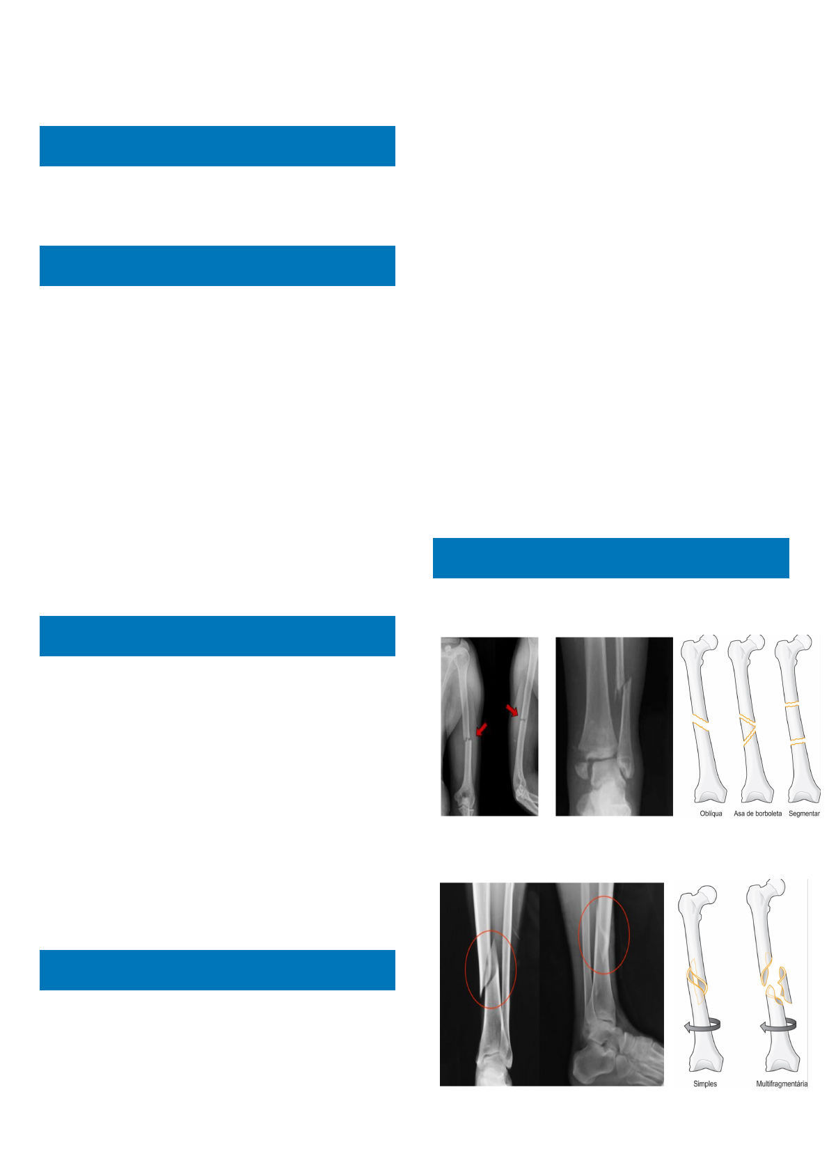 Universidade Nove de Julho Maria Lívia Tipos de Fraturas Fratura: • Qualquer ruptura, ou perda, na continuidade de um osso. Cuidados no Atendimento: • Imobilização cuidadosa; • Lesões secundárias; • Pontos a serem observados: ‣ Dor intensa no local; ‣ Dor que aumenta ao menor movimento; ‣ Edema local; ‣ Som parecido com amassar papel ao se movimentar; ‣ Rompimento de vasos/nervos; ‣ Paralisias. Classificação de Fraturas: • As fraturas são descritas em termos com várias características: ‣ Etiologia: a causa da fratura; ‣ Morfologia: o padrão da fratura; ‣ Gravidade: o grau de cominuição ou de uma articulação ou envolvimento de partes moles; ‣ Localização: que parte do osso ou segmento é afetada; ‣ Desvio: como os fragmentos ósseos desviaram- se um em relação ao outro. Etiologia: • Traumática: ‣ As lesões são causadas por trauma direto ou indireto; ‣ São o efeito de uma força anormal aplicada a um osso normal. • Patológica: ‣ Ocorrem dentro de um osso anormal ou doente e, com frequência, são causadas por trauma de baixa energia; ‣ São o efeito de uma força normal sobre um osso anormal; ‣ A patologia pode ser localizada isoladamente (depósito tumoral) ou generalizada (OP). • Fratura por Insuficiência: ‣ Osteoporose; ‣ Osteomalácia. • Fratura por Fadiga/Stress: ‣ Essas fraturas são o resultado da aplicação clínica de forças normais ao osso normal, com frequência excessiva. Morfologia: • Fraturas Transversas e Oblíquas: • Fraturas em Espiral: Universidade Nove de Julho Maria Lívia • Fratura por Avulsão: • Fratura Impactada: • Fratura Pediátrica: Gravidade: • Fraturas Expostas: ‣ Estas lesões justificam uma consideração especial por causa do alto risco de infecção pela contaminação. Muitas vezes, as fraturas expostas são descritas como compostas; ‣ Uma fratura é descrita como complexa se houver danos associados à uma estrutura adjacente; ‣ O comprometimento neurovascular é particularmente importante e várias vezes requer tratamento de emergência. • Fratura Intra-Articular: ‣ Uma fratura que rompe uma superfície articular é de particular importância, já que a incongruência articular após a consolidação vai predispor à artrose pós-traumática; ‣ O deslocamento evidente é uma indicação para a redução cirúrgica e a fixação. • Cominuição: ‣ Múltiplos fragmentos são indicativos de uma lesão de alta energia; ‣ Há maior risco de complicações e de lesão associada, como a pseudoartrose. Localização: • Algumas fraturas tem títulos epônimos em virtude dos usos e costumes de longa data. • Exemplos: ‣ Fratura de Colles: dos 2,5 cm distais do rádio que resulta em uma deformidade típica do “dorso do garfo” com translação e inclinação dorsal; ‣ Fratura-luxação do tornozelo de Maisonneuve; ‣ Luxação de Lisfrane da articulacao tarso metatársica. ‣ Esses termos são bastante imprecisos, para não mencionar injustos. Fratura-Luxação Uma fratura completa mas não deslocada é denominada sem desvio ou diz-se que está em posição anatômica. Da mesma maneira, a redução de uma fratura desviada para uma posição perfeita chama-se redução anatômica. Uma fratura (ou redução imperfeita) quase anatômica é considerada minimamente deslocada. O deslocamento da fratura é descrito em termos de: - Extensão: distração/encurtamento; - Angulação: varo/valho no plano coronal e flexão/ extensão no plano sagital; - Rotação: rotação interna e externa; - Translação: movimento anterior, posterior, medial ou lateralmente. Universidade Nove de Julho Maria Lívia Desvio (Deslocamento): • Deslocamento em Extensão: • Deslocamento por Angulação: este é descrito por referência ao ápice da fratura. • Deslocamento por Rotação: uma fratura pode estar girada internamente ou externamente. Melhor avaliado pelo exame físico que pela radiografia, a radiografia deve demonstrar ambas as articulações da região afetada. • Deslocamento por Translação: ocorre quando as superfícies da fratura se deslocarem lateralmente uma em relação à outra. O deslocamento é descrito em termos da posição do fragmento distal. Classificação de Fraturas: • Diafisárias: • Epifisárias: Diagnóstico: • Anamnese; • Exame físico; • Exame de imagem: ‣ Radiografia; ‣ Ultrassonografia; ‣ Tomografia (TC); ‣ Ressonância Magnética (RM). ABC’S da Fratura: • A: alinhamento e estabilidade; • B: qualidade óssea (Bone) e configuração da fratura; • C: cartilagem (envolvimento da articulação); • S: partes moles (Soft tissues). Universidade Nove de Julho Maria Lívia Prática: • Radiografia AP e P do punho esquerdo; o filme é de qualidade adequada; • Fratura transversa simples da extremidade distal do rádio esquerdo; • Há uma inclinacao dorsal de 20°, bem como encurtamento com perda de altura radial; • A fratura é extra-articular e existe um edema mínimo das partes moles (ou: há uma fratura de Colles do rádio distal esquerdo). Consolidação Óssea: • Primária: • Secundária: Tratamento: • O tratamento de qualquer fratura compreende 3 considerações principais: 1. A posição da fratura é aceitável ou precisa ser refuzida? 2. A fratura está estável ou precisa ser estabilizada? 3. Quando o paciente pode começar a utilizar e movimentar o membro? • Isso pode ser resolvido com o paradigma simples Reduzir - estabilizar - movimentar