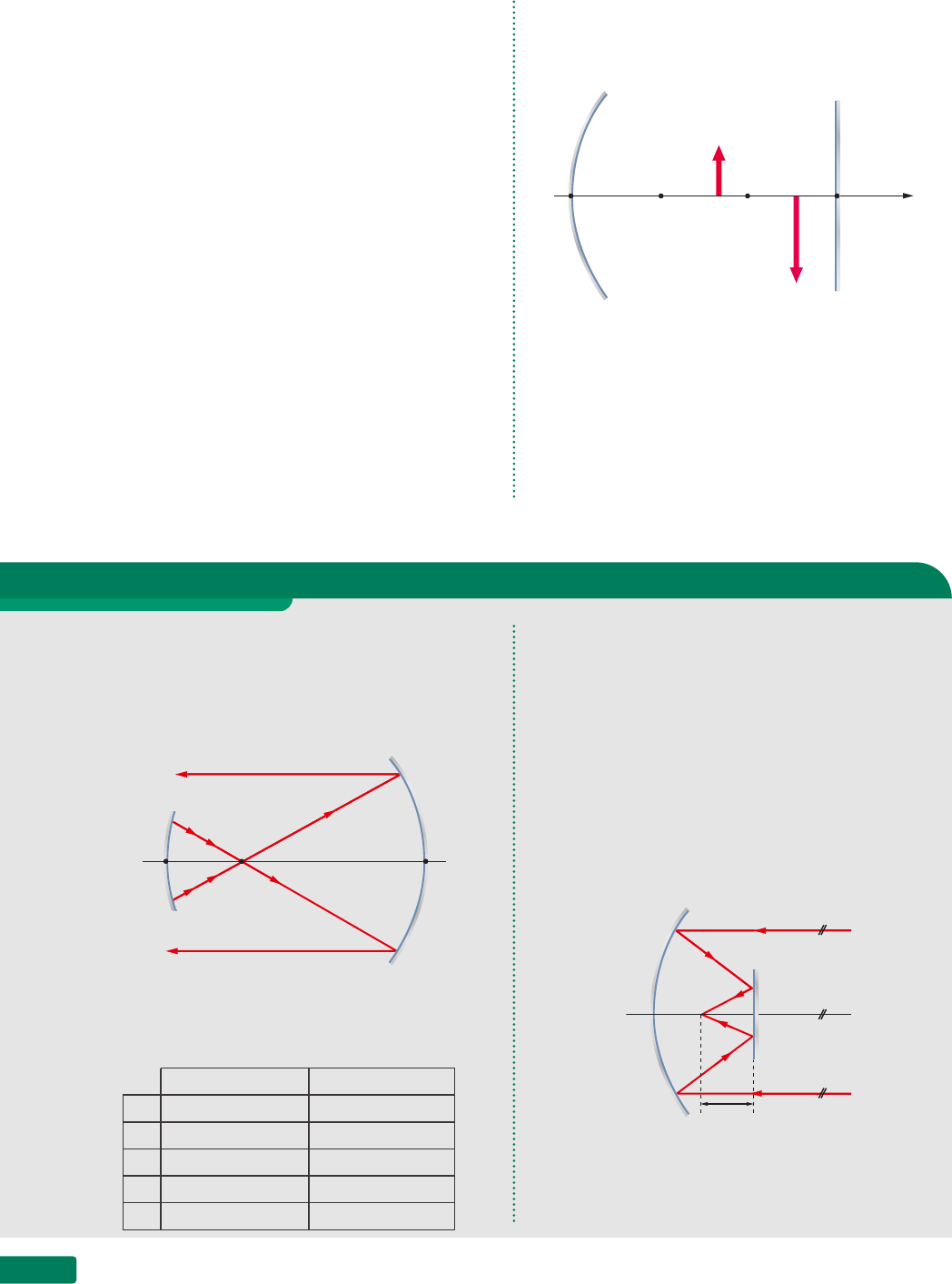 Capítulo 10260 44. Dois espelhos esféricos côncavos idênticos, E 1 e E 2 , são montados, coaxialmente, num banco óptico. Seus centros de curvatura são coinci- dentes. Um objeto extenso O 1 , de 3,0 cm de altura, é colocado sobre o centro de curvatura comum, perpendicularmente ao eixo princi- pal. Determine as características da imagem I 2 conjugada por E 2 , sabendo que os raios de luz emanam do objeto, incidem em E 1 , refletem-se em E 2 e formam I 2 . 45. Na figura mostram-se dois espelhos associados: E 1 é um espelho côncavo cujo raio de curvatura é 120 cm e E 2 é um espelho plano, disposto perpendicularmente ao eixo principal de E 1 . Um objeto luminoso A, com 40 cm de altura, foi interposto entre os espelhos, ficando a 100 cm do côncavo e a 80 cm do plano. O eixo de abscissas (x) coincide com o eixo principal do espelho esférico e sua origem é o vértice V. Os valores numéricos indicados referem-se às abs- cissas de cada elemento. Raios de luz emanam de A e incidem primeiramente em E 1 formando uma primeira imagem I 1 do objeto luminoso. Em seguida, refletindo-se em E 2 , formam uma segunda imagem I 2 . V E 1 E 2 F A C 600 120100 180 x (cm) I 1 ≡ o 2 a) Obtenha, graficamente, as imagens I 1 e I 2 . Para o espelho E 2 , use a simetria entre o obje- to e a imagem. b) Determine a abscissa de I 1 . c) Determine a abscissa de I 2 . d) Determine a distância, medida sobre o eixo x, entre as imagens I 1 e I 2 . exercícios de Reforço 46. (Cesgranrio-RJ) Em um farol de automóvel, dois espelhos esféricos côncavos são utilizados para se obter um feixe de luz paralelo a partir de uma fonte aproximadamente pontual. O espelho prin- cipal, E 1 , tem 16,0 cm de raio. O espelho auxiliar, E 2 , tem 2,0 cm de raio. M E 1 N E 2 S Para que o feixe produzido seja efetivamente paralelo, as distâncias da fonte S aos vértices M e N dos espelhos devem ser iguais, respectiva- mente, a: Distância SM Distância SN a) 8,0 cm 1,0 cm b) 16,0 cm 2,0 cm c) 16,0 cm 1,0 cm d) 8,0 cm 2,0 cm e) 8,0 cm 4,0 cm 47. (UF-RJ) Um espelho esférico côncavo de 50 cm de raio e um pequeno espelho plano estão frente a frente. O espelho plano está disposto per- pendicularmente ao eixo principal do côncavo. Raios luminosos paralelos ao eixo principal são refletidos pelo espelho côncavo; em seguida, refletem-se também no espelho plano e tornam- se convergentes num ponto do eixo principal distante 8 cm do espelho plano, como mostra a figura. Calcule a distância do espelho plano ao vértice V do espelho côncavo. 8 cm V Il U st r A ç õ es : ZA Pt Capítulo 10260 Espelhos esféricos 261 exercícios de aprofundamento 48. Sobre o eixo principal de um espelho esférico côncavo deitou-se uma seta luminosa de F a C, como mostra a figura. Esboce a sua imagem. F CV 49. Considere o espelho esférico côncavo de Gauss da figura no qual está incidindo um raio de luz r. Um objeto luminoso AB está sobre o raio r. F C B A r V a) Desenhe o trajeto do raio refletido r', usando o conceito de foco secundário. b) Determine, graficamente, a imagem A'B' do objeto AB utilizando necessariamente o raio refletido r '. 50. (Fuvest-SP) A imagem de um objeto forma-se a 40 cm de um espelho côncavo com distância focal de 30 cm. A imagem formada situa-se sobre o eixo principal do espelho, é real, invertida e tem 3,0 cm de altura. a) Determine a posição do objeto. b) Construa o esquema referente à questão, representando o objeto, a imagem, o espelho e os raios utilizados e indicando as distâncias envolvidas. 51. (Fuvest-SP) As faces de uma calota esférica de 30 cm de raio funcionam como espelhos. Um obje- to luminoso de 5,0 cm de comprimento é colocado defronte à face côncava da calota, sobre seu eixo principal e a 30 cm dela. Em seguida, o objeto é colocado do outro lado da calota, a 30 cm da face convexa, sobre seu eixo principal. Pede-se: a) a distância entre as imagens formadas nas duas situações; b) a relação entre os tamanhos das imagens for- madas na primeira e na segunda situação. 52. (Unicamp-SP) Para espelhos esféricos nas condi- ções de Gauss, a distância do objeto ao espelho, p, a distância da imagem ao espelho, p', e o raio de curvatura do espelho, R, estão relacionados através da equação 1 p + 1 p' = 2 R . O aumento linear transversal do espelho esférico é dado por A = – p' p , onde o sinal de A representa a orientação da imagem, direita quando positivo e invertida quando negativo. Em particular, espe- lhos convexos são úteis por permitir o aumento do campo de visão e por essa razão são frequen- temente empregados em saídas de garagens e em corredores de supermercados. A figura a seguir mostra um espelho esférico convexo de raio de curvatura R. Quando uma pessoa está a uma distância de 4,0 m da superfície do espelho, sua imagem virtual se forma a 20 cm deste, conforme mostra a figura. Usando as expressões fornecidas acima, calcule o que se pede. 4,0 m 20 cm R C H h a) O raio de curvatura do espelho. b) O tamanho h da imagem, se a pessoa tiver H = 1,60 m de altura. 53. (U. F. Juiz de Fora-MG) A luz de um feixe paralelo de um objeto distante atinge um grande espelho, de raio de curvatura R = 5,0 m, de um poderoso telescópio, como mostra a figura a seguir. Após atingir o grande espelho, a luz é refletida por um pequeno espelho, também esférico e não plano como parece, que está a 2 m do grande. F 2 m pequeno espelho grande espelho C Il U st r A ç õ es : ZA Pt Espelhos esféricos 261 Capítulo 10262 Sabendo que a luz é focalizada no vértice do grande espelho esférico, faça o que se pede nos itens seguintes. a) O objeto no ponto F, para o pequeno espelho, é real ou virtual? Justifique sua resposta. b) Calcule o raio de curvatura R do pequeno espelho. c) O pequeno espelho é côncavo ou convexo? Justifique sua resposta. 54. (OBF-Brasil) Dois espelhos metálicos parabóli- cos e côncavos são dispostos frente a frente de modo que seus eixos principais coincida