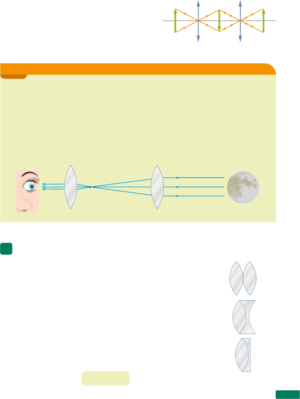 Lentes esféricas 329 12. Lentes justapostas Quando duas ou mais lentes coaxiais estiverem encostadas umas às outras, como na figura 45, elas serão denominadas lentes justapostas. se duas faces convexas estiverem encostadas (fig. 45a), elas terão apenas um ponto em comum. no caso particular de estarem encostadas uma face côncava e outra con- vexa, de mesmo raio de curvatura, haverá acoplamento (figs. 45b e 45c). A justaposição de lentes é muito usada em aparelhos ópticos, com a finalidade de atenuar aberrações cromáticas. uma lente esférica de grande curvatura apresenta aberrações cromáticas, ao passo que as de pequena curvatura apresentam pouca ou nenhuma aberração. A justaposição de diversas lentes de pequena curvatura atenua, então, o fenômeno. um conjunto de duas ou mais lentes justapostas funciona como se fosse uma única lente, a qual denominaremos lente equivalente. sejam V 1 , V 2 , V 3 as respectivas vergências das lentes delgadas justapostas L 1 , L 2 , L 3 e seja ainda V eq a vergência equivalente desse sistema, a equação que nos dá a vergência equivalente é: V eq = V 1 + V 2 + V 3 Figura 45. Lentes justapostas. (a) (b) (c) Leitura Aplicação de lentes A associação de lentes é utilizada na construção de microscópios, lunetas e telescópios, como veremos no capítulo 14. Nos três aparelhos, de um modo geral, usam-se duas lentes convergentes: a primeira captura a imagem do objeto e a segunda funciona como se fosse uma lupa, em que o observador coloca seu olho quase encostado nela. Respectivamente, elas são chamadas de objetiva e ocular. Por exemplo, em uma luneta comum o foco das lentes objetiva e ocular são coincidentes. No exemplo, a luz proveniente da Lua chega em raios paralelos, da direita para a esquerda, incidindo na lente objetiva L 1 . Uma vez atravessada essa lente, a luz converge para o foco comum e, continuando a sua trajetória, incide na lente ocular L 2 . Sofre refração e os raios emergentes paralelos vão incidir no olho do observador. iL u st r A ç õ es : zA Pt Lu iz A u G u st O r ib ei r O Q e. p. P L 1 L 2 P 2 Q 2 Q 1 P 1 A luz proveniente do objeto sofre uma primeira refração em L 1 e uma segunda em L 2 . em cada uma delas haverá for- mação de imagem. A lente L 1 conjugará, do objeto QP, uma primeira imagem Q 1 P 1 . esta, por sua vez, será um objeto para a lente L 2 e dele conjugará uma imagem Q 2 P 2 . Acompanhe na figura 44. Figura 44. Imagens sucessivas da associação das duas lentes. F 1 = F 2 L 2 L 1 Lua Capítulo 12330 13. Associação de lentes com espelhos Vamos montar num banco óptico um sistema constituído por uma lente (L) e por um espelho (E ). A lente pode ser convergente ou divergente e o espelho pode ser plano ou esférico: côncavo ou convexo. no exemplo 12, vamos usar uma lente convergente (L) e um espelho plano (E). Na figura 45b, temos duas lentes justapostas. Vamos supor que a lente convergente tenha distância focal 0,5 m e que a lente divergente, –2,0 m. Suas vergências valem: V = 1 f A lente convergente terá vergência positiva: V 1 = 1 0,5 ⇒ V 1 = +2,0 di A lente divergente terá vergência negativa: V 2 = 1 –2,0 ⇒ V 2 = –0,5 di A associação dessas lentes justapostas terá vergência equivalente: V eq = V 1 + V 2 V eq = (+2,0) + (–0,5) V eq = +1,5 di Conclusão: o sistema de lentes justapostas é convergente. exemplo 11 A lente convergente tem distância focal f e o espelho plano está situado a uma distância 3f da lente. Colocamos um objeto extenso e luminoso PQ a uma distância 2f da lente, como mostra o esquema da figura 46. O nosso objetivo é apenas deter- minar a imagem dada pelo espelho plano. Observemos que o objeto PQ encontra-se posicionado sobre o ponto antiprincipal A da lente L; então: a imagem P 1 Q 1 estará posicionada sobre o ponto antiprincipal A'. Observemos ainda que a imagem P 1 Q 1 (objeto para o espelho plano) está a uma distância f deste espelho. Logo, sua imagem P 2 Q 2 estará a uma distância f de E, pois ela é simétrica em relação ao objeto. exemplo 12 Figura 46. Representação de um banco óptico com lente convergente e espelho plano. L EP Q A F f O F' A' P 1 P 2 Q 2 Q 1 PQ: objeto para a lente. P 1 Q 1 : imagem conjugada pela lente. P 1 Q 1 : objeto para o espelho plano. P 2 Q 2 : imagem conjugada pelo espelho plano. z A P t Lentes esféricas 331 66. Em um banco óptico montam-se duas lentes con- vergentes coaxialmente. A primeira delas tem dis- tância focal 60 cm, e a segunda, 45 cm. Um feixe de luz cilíndrico, paralelo ao eixo principal, incidiu na primeira lente. Os raios de luz, após as duas refrações sucessivas, emergiram da segunda lente formando novamente um feixe cilíndrico, paralelo ao eixo principal. A distância entre as duas lentes é 105 cm e as lentes têm um foco em comum. Como ficam os raios de luz para a associação? luz incidente 105 cm luz emergente L 1 L 2 F Figura a. Resolução: O feixe de luz paralelo ao eixo principal, ao refratar-se na primeira lente, converge para o seu foco F e incide na segunda lente. Em L 2 , temos raios incidindo, passando pelo foco e, portanto, refratando-se paralelos ao eixo (fig. b). 60 cm 45 cm F 1 = F 2 L 1 L 2 Figura b. 67. Um objeto PQ está situado a 10 cm de uma lente convergente L 1 de distância focal 5,0 cm. Uma segunda lente, L 2 , convergente, de distância focal 4,0 cm, encontra-se a 6,0 cm de distância da ima- gem de PQ conjugada por L 1 , como ilustra a figura. L 1 P Q O 1 P 1 O 2 Q 1 6,0 cm L 2 a) Determine a distância de L 1 a L 2 . b) Determine a distância da imagem final, con- jugada pelo sistema à lente L 2 . Resolução: a) Observemos que o segmento PQ está sobre um ponto antiprincipal da lente L 1 , pois: PO 1 = 10 cm; f 1 = 5,0 cm; PO 1 = 2f 1 Assim, a imagem P 1 Q 1 forma-se sobre o outro ponto antiprincipal da lente L 1 , ou seja, a 10 cm de O 1 . O 1 O 2 = O 1 P 1 + P 1 O 2 O 1 O 2 = 10 + 6,0 O 1 O 2 = 16 cm (Essa é a distância entre as le
