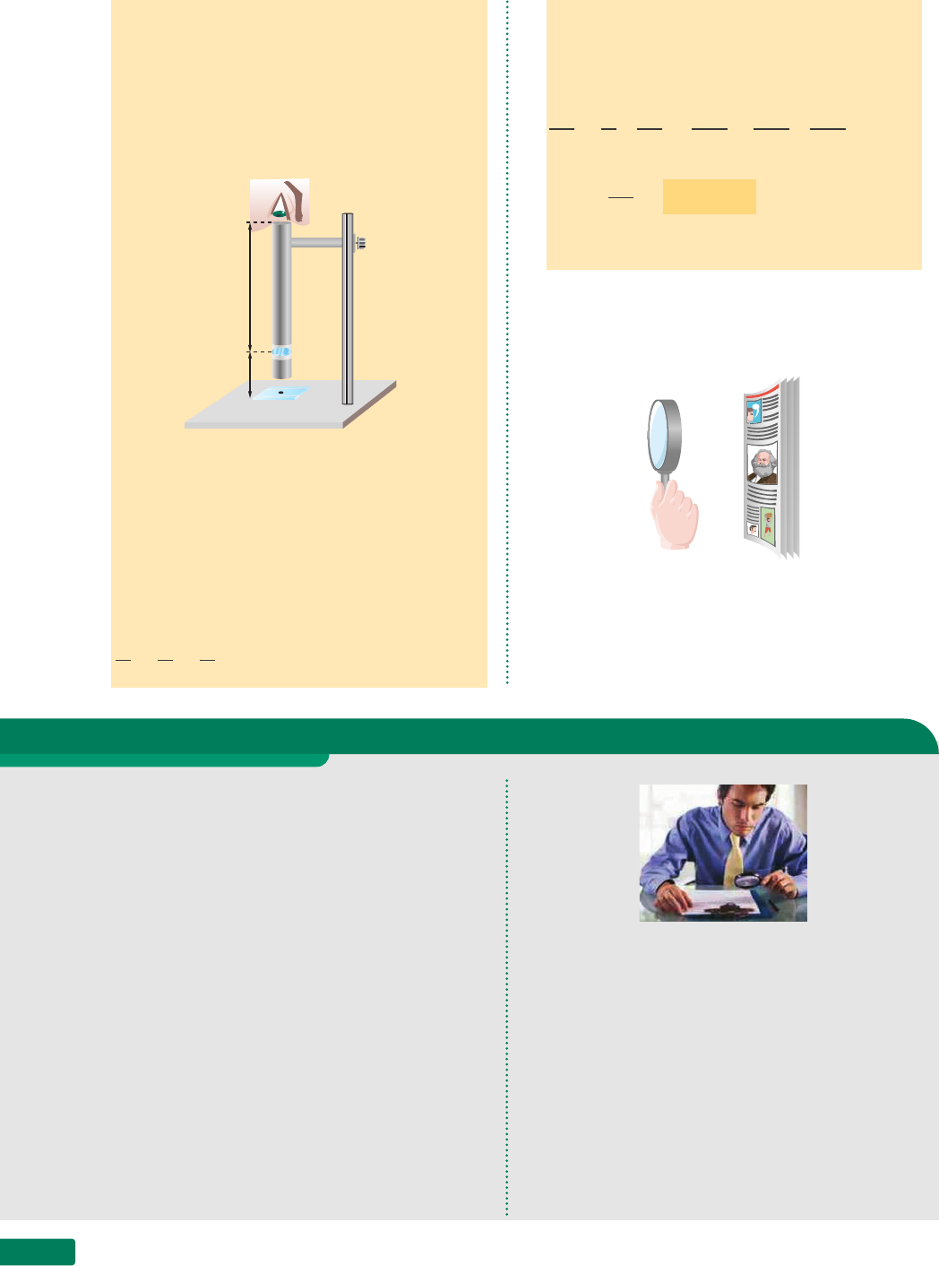 Capítulo 14356 Admite-se que: • o observador não tenha ametropias, isto é, que o PP esteja a 25 cm do olho; • o observador encoste o olho na ocular. Determine a distância x indicada, ou seja, da lente à lâmina a ser observada. lente x 5,0 cm Resoluç‹o: O objeto é a lâmina e temos: p = +x. A imagem será virtual e deve estar situada a 25 cm do olho, portanto, 20 cm abaixo da lente. Temos: p' = –20 cm. Vamos usar a equação das lentes de Gauss: 1 f = 1 p + 1 p' Sendo: f = +5,0 cm (lente convergente) p = +x (objeto real) p' = –20 cm (imagem virtual) 1 5,0 = 1 x – 1 20 ⇒ 4,0x 20x = 20 20x – 1,0x 20x ⇒ ⇒ 4,0x = 20 – 1,0x ⇒ 5,0x = 20 ⇒ ⇒ x = 20 5,0 ⇒ x = 4,0 cm Devemos regular a altura do microscópio até que a lente fique a 4,0 cm da lâmina. Exercícios de Reforço 4. (UF-ES) Uma lupa é construída com uma lente convergente de 3,0 cm de distância focal. Para que um observador veja um objeto ampliado de um fator 3, a distância entre a lupa e o objeto deve ser, em centímetros: a) 1,5 b) 2,0 c) 3,0 d) 6,0 e) 25 5. Um estudante está usando uma lupa para visua- lizar uma figura. Ele tem hipermetropia nos dois olhos, sendo que o seu PP (ponto próximo) está a 50 cm e o PR (ponto remoto) está a 50 m. A lupa tem uma vergência de 10 dioptrias e ele a usará muito próximo do olho, quase colada. Para obter uma boa focalização da figura: a) a que distância deverá se formar a imagem da lente? b) a que distância da lente ele deverá posicionar a figura? 6. (Unesp-SP) Uma lupa utilizada para leitura é confeccionada com uma lente delgada conver- gente, caracterizada por uma distância focal f. Um objeto é colocado a uma distância 0,8f, medida a partir da lente. Se uma letra de um texto tem altura 1,6 mm, determine o tamanho da letra observado pelo leitor. t h iN k s t o C k /g e t t y i m a g e s 3. (UE-RJ) Uma pessoa utiliza uma lente conver- gente para a leitura da página de uma revista, como mostra a figura. A natureza e a posição da imagem formada pela lente são, respectivamente: revista a) virtual / entre a lente e a revista. b) real / entre a lente e a revista. c) virtual / à direita da revista. d) real / à direita da revista. z a p t l u iz a u g u s t o r iB e ir o Instrumentos ópticos 357 Exercícios de Aplicação 4. O microscópio composto o microscópio é um instrumento óptico destinado à visualização de pequenos objetos, tais como células, micróbios, etc. a lupa é um microscópio simples. Qual- quer lente convergente apoiada num suporte são con- siderados microscópios simples. o microscópio composto, por sua vez, é consti- tuído por duas lentes convergentes, como se descreve a seguir (fig. 9): • uma lente convergente ocular (onde se coloca o olho). • uma lente objetiva (que se aproxima do objeto). Na figura 10 a lente objetiva forma uma primeira imagem (I ) ampliada do objeto e a lente ocular usa essa imagem como um objeto e conjuga uma segunda ima- gem (I' ) ampliada. a ocular aproxima a imagem do olho e produz um aumento do ângulo visual, aumentando mais ainda o tamanho aparente do objeto. Desse modo, o objeto teve a sua imagem ampliada duas vezes. lembremos que essa segunda imagem dada pela ocular deve ficar aquém do pp (ponto próximo do olho do observador). o motivo de se usar duas ampliações sucessivas (fig. 10) e não apenas uma com uma lente muito po- tente é a distorção de imagem que acarretaria e as aberrações cromáticas que surgiriam. Na figura 9, temos o esquema de um microscópio composto. a objetiva é uma lente convergente que fica no interior de uma canopla cuja altura é regulável (canopla retrá- til), permitindo assim uma maior ou menor aproximação do objeto. a ocular é outra lente convergente que está no interior de outra canopla regulável, ajudando a focaliza- ção da imagem do objeto. o corpo fixo do microscópio é um tubo escuro, no interior do qual se formam as imagens. De modo geral, a objetiva tem distância focal pequena, da ordem de alguns milí- metros, enquanto a ocular tem maior distância focal, da ordem de alguns centímetros. a objetiva de posição regulável é uma comodidade para os observadores que apre- sentam defeitos de miopia ou hipermetropia, pois com isso se procura uma melhor acomodação da imagem. modernamente os microscópios possuem um conjunto de lentes objetivas comu- táveis, como na figura 11, as quais modificam a ampliação do objeto devido à sua potência (vergência). 1 2 3 4 5 O F 1 F 2 objetiva Para uma imagem virtual distante f ob f ob s f oc ocular F' 1 F' 2 I I' raios paralelos Figura 10. O caminho da luz no interior do microscópio composto. Figura 9. Esquema de um microscópio composto. 1 - lente ocular 2 - lente objetiva 3 - tubo escuro – estrutura do microscópio 4 - lâmina contendo pequeno objeto 5 - suporte de altura regulável Figura 11. Microscópio com- posto de lentes comutáveis. 7. Na figura ao lado tem-se um esquema simpli- ficado de um microscópio composto em que a ocular é a lente L 1 e a objetiva é a L 2 . Ambas são lentes convergentes. Sabe-se que a lente L 2 fornece uma primeira imagem I 1 das células contidas na lâmina. lente objetiva (L 2 ) tubo deslizante lente ocular (L 1 ) cŽlulas il u st r a ç õ es : za pt th iN k st o C k /g et ty im a g es Capítulo 14358 a) O que faz a lente L 1 ? b) Admitindo-se que o observador tenha olho nor- mal, onde deverá formar-se a imagem final I 2 ? Resolução: a) A lente L 1 usa a imagem I 1 como objeto e conju- ga uma imagem virtual I 2 , que é a imagem final. b) A imagem final deverá ser virtual, ou seja, forma-se abaixo da lente L 1 e a 25 cm de dis- tância do observador, pois o olho normal tem o PP igual a 25 cm. 8. Podemos construir um microscópio composto usando dois tubos de PVC, em que um se encaixa no outro e desliza por dentro. Nos extremos colo- camos apenas duas lentes, como indica a figura. lente lente 1 2 Determine a alternativa correta: a) 1 é a o