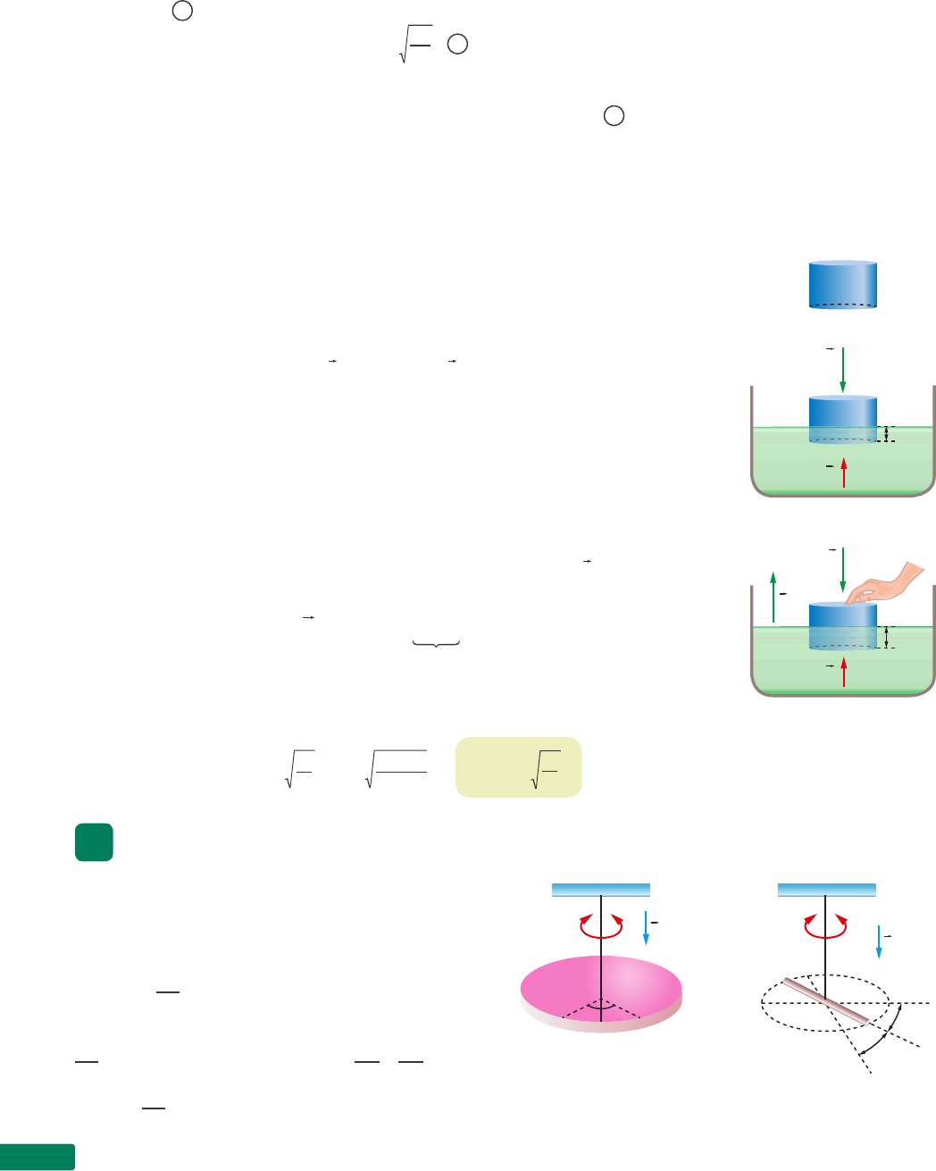 Capítulo 15374 Portanto, nessa situação, a força resultante (tomando-se o eixo da figura) é dada por F = –kx, em que x = 0 corresponde à posição de equilíbrio. Sendo assim, deslocando-se o corpo verticalmente e em seguida abandonando-o, ele executa um MHS, cujo perío- do pode ser calculado pela mesma fórmula do oscilador bloco-mola na horizontal, que é a equação 2 T = 2π m k 2 ou seja, o período não depende da aceleração da gravidade. usando o mesmo raciocínio, podemos mostrar que a equação 2 vale também para o caso em que o sistema bloco-mola esteja oscilando apoiado em um plano inclinado. Corpo flutuante Consideremos um corpo em forma de cilindro ou prisma, cuja área da base é A e cuja massa é m (fig. 11a). Colocando esse corpo em um líquido de densidade d l , vamos supor que ele fique em equilíbrio na posição indicada na figura 11b, em que h é a distância entre o fundo do corpo e a superfície do líquido. Como vimos no capítulo 26 do volume 1, as forças que atuam no corpo são o peso (P) e o empuxo (E), sendo que: P = mg e e = d l Ahg em que g é a aceleração da gravidade. Como o sistema está em equilíbrio, temos: P = e ⇒ mg = d l Ahg ⇒ m = d l Ah Se empurrarmos o corpo levemente para baixo e depois soltarmos (fig. 11c), ele ficará oscilando. em relação à posição da figura 11b, na posição da figura 11c, o corpo afundou uma distância x. Assim, nessa posição, a força resultante F é igual ao acrésci- mo de empuxo, isto é: |F | = d l Axg = (d l Ag) k x = kx Portanto, a força resultante tem módulo dado por kx e tende a levar o corpo à posi- ção de equilíbrio. Assim, concluímos que o movimento é harmônico simples de período T dado por: T = 2π m k = 2π dlAh dlAg ⇒ T = 2π h g 4. Movimento harmônico simples angular Na figura 12a representamos um disco horizontal preso por seu centro a um fio, que por sua vez está preso a um suporte S. Na posição de equilíbrio, a linha de referência OB está fixa. Ao girarmos levemente o disco, soltando-o em seguida, ele passa a executar um movi- mento oscilatório rotacional e a linha de referência OB movimenta-se entre as posições OA e OC, sendo θ 0 o ângulo máximo girado de cada lado da posição inicial da linha OB. A m h d L P E h + x d L F P E' Figura 11. S θ 0 θ 0 CA O B g S C'' B'' B' C' θ 0 θ 0 C B g (a) Disco horizontal oscilando. (b) Barra horizontal oscilando. Figura 12. Exemplos de MHS angular. Il u ST r A ç õ eS : ZA PT (a) (b) (c) Movimento harmônico simples 375 No capítulo 15 do CD mostraremos que, para θ 0 “pequeno”, isto é, para oscilações de “pequena” amplitude angular θ 0 , a aceleração angular (γ ) do disco e seu desloca- mento angular (θ) estão relacionados por: γ = –cθ sendo c uma constante. esta última equação tem a mesma forma da equação 5 : α = –cx Isso nos leva a concluir que o disco executa um MHS angular, cujo período é dado pela equação 6 : T = 2π 1 c 6 Na figura 12b apresentamos um outro exemplo de MHS angular: uma barra hori- zontal BC, presa a um fio, oscila entre as posições B'C' e B''C''. esse caso da barra é semelhante ao dispositivo usado por Cavendish para medir a constante de gravitação universal, de um modo que descrevemos no capítulo 24 do volume 1. Os dois sistemas da figura 12 são também chamados pêndulos de torção e são analisados com mais detalhes no texto do CD referido ao lado. Exercícios de Aplicação 1. Um bloco de massa m = 5,0 kg oscila preso a uma mola ideal de constante elástica k = 20 N/m e apoiado sobre uma superfície horizontal S sem atrito, como ilustra a figura a. –0,20 0,200 x (m) S Figura a. S Figura b. S Figura c. Sabendo que a amplitude do movimento é A = 0,20 m, calcule: a) o período do movimento; b) a frequência do movimento; c) a máxima velocidade adquirida pelo bloco; d) a máxima aceleração adquirida pelo bloco. Resolução: a) T = 2π m k = 2π 5,0 kg 20 N/m ⇒ T = π s ≅ 3,14 s b) f = 1 T ⇒ f = 1 π Hz ⇒ f ≅ 0,32 Hz c) A máxima velocidade ocorre no ponto de abs- cissa nula, no qual a energia potencial é nula, isto é, a energia cinética é igual à energia mecânica: E C = E M ⇒ mv2 2 = kA2 2 ⇒ ⇒ (5,0)v2 = (20)(0,20)2 ⇒ ⇒ v2 = (4,0)(0,20)2 ⇒ v = (2,0)(0,20) ⇒ ⇒ v = 0,40 m/s d) A aceleração tem módulo máximo nos pontos onde a força tem módulo máximo. Como a força é dada por F = –kx, a força máxima F m é dada por: F m = k · A Mas, pela Segunda Lei de Newton, temos: F m = m · a m em que a m é a aceleração máxima. Assim: m · a m = kA ⇒ ⇒ (5,0 kg) · a m = (20 N/m)(0,20 m) ⇒ ⇒ am = 0,80 m/s 2 2. Na figura a temos um bloco de massa m = 4,0 kg preso a uma mola de constante elás- tica k = 1 600 N/m, cujo comprimento natural é L; assim, nessa posição a mola não está defor- mada (x = 0). O bloco é então empurrado, de modo que a mola sofre uma compressão de 0,5 m (fig. b). Abandonando-se o bloco nessa posição e supondo que não haja atrito, ele adquire MHS. Il u ST r A ç õ eS : ZA PT PrOCurE nO CD Veja, no capítulo 15 do CD, o texto Movimento harmônico simples angular, bem como exercícios relativos ao tema. Capítulo 15376 L 0,5 m –0,5 m 0 A x (m) Figura a. Figura b. Determine: a) a amplitude do movimento; b) o período do movimento; c) a frequência do movimento; d) a velocidade máxima do bloco; e) a aceleração máxima do bloco; f) a velocidade e a aceleração do bloco para x = 0,2 m. 3. Para a situação da questão anterior, esboce os gráficos das energias cinética, potencial e mecâ- nica em função da elongação. 4. Um bloco realiza MHS de amplitude A = 20 cm. Determine o valor da elongação quando a energia cinética for o dobro da energia potencial. 5. Um bloco, preso a uma mola de constante elásti- ca 20 N/m, realiza MHS, de modo que sua energia mecânica seja 90 J. Determine a amplitude do movimento. 6. Um bloco, preso a uma mola ideal cuja constante elástica 