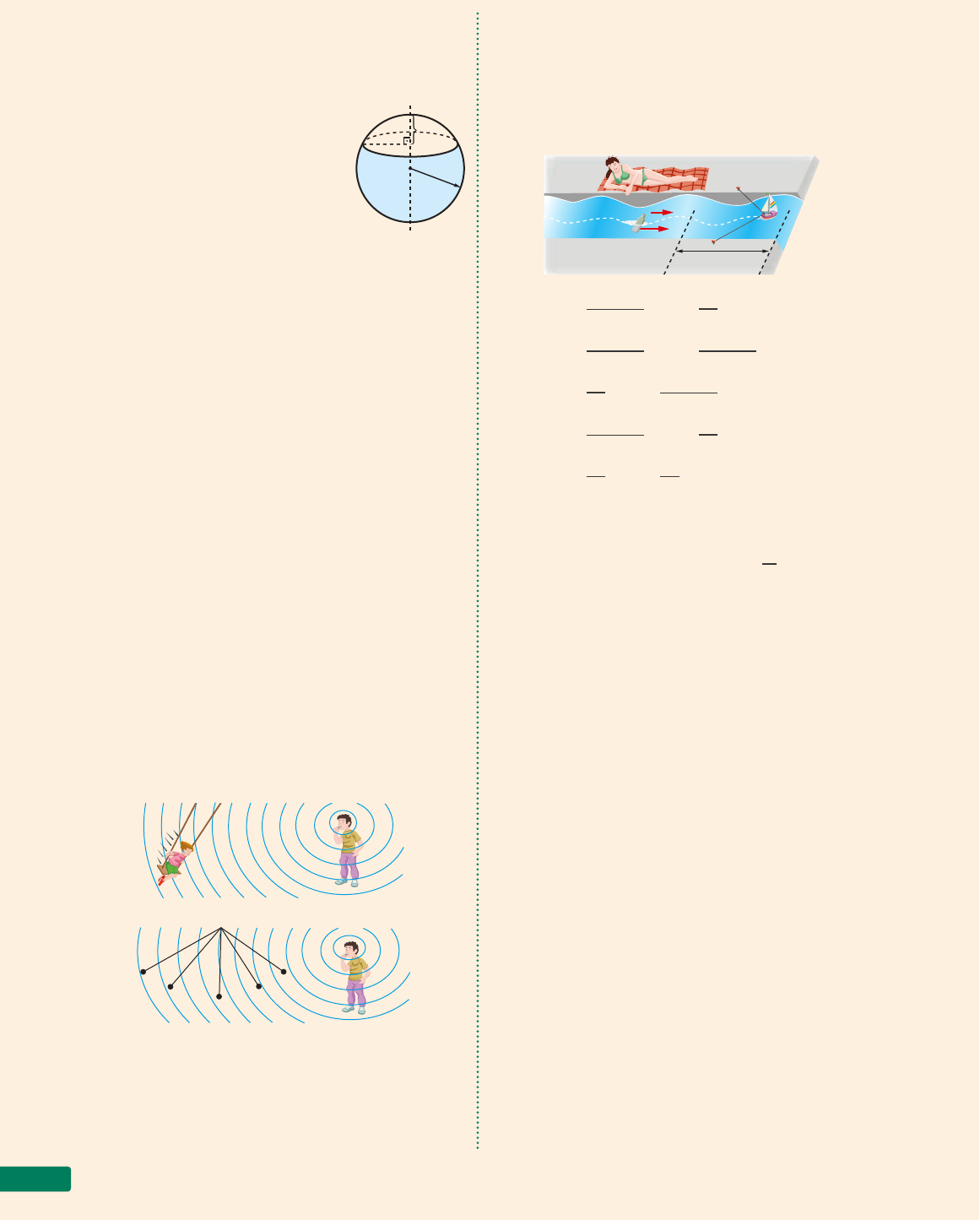 Capítulo 16464 148. Uma casca esférica de raio R = 13 m tem um buraco circular de raio r = 5,0 m. No centro da casca esférica há uma pequena lâmpada acesa, cuja potência é 52 W. Calcule a quantidade de energia da lâmpada que passa pelo buraco em 5,0 minutos. É dada a fórmula da área da calota esférica (ver figura) S = 2πRh, na qual R é o raio da superfície esférica e h é a altura da calota. 149. (Unifesp-SP) O Sol tem diâmetro de 1,4 ∙ 109 m e a sua distância média à Terra é de 1,5 ∙ 1011 m. Um estudante utiliza uma lente convergente delgada de distância focal 0,15 m para proje- tar a imagem nítida do Sol sobre uma folha de papel. Ele nota que, se mantiver a imagem do Sol projetada sobre o papel durante alguns segundos, o papel começa a queimar. a) Qual o diâmetro da imagem do Sol projetada no papel? b) A potência por unidade de área da radiação solar que atinge a superfície da Terra, no Brasil, é da ordem de 1 000 W/m2. Se a lente que o estudante usa tem contorno circular com 0,10 m de diâmetro, qual a potência por unida- de de área da radiação solar que atinge o papel na região onde a imagem do Sol é projetada? (Despreze a radiação absorvida e refletida pela lente). Como você explica a queima do papel utilizando esse resultado? Dado: π = 3,1. 150. Na figura a representamos uma menina se balançando, perto de uma pessoa que assopra um apito, emitindo um som de frequência cons- tante. Em qual das posições assinaladas na figu- ra b a orelha da menina recebe som de maior frequência? Para qual sentido de movimento? Figura a. B A C D E Figura b. 151. (Fuvest-SP) Uma jovem, repousando à margem de um canal, observa uma garrafa levada pela correnteza com velocidade vg e um barquinho B preso às margens por fios fixados nos pontos M e N. No canal se propaga uma onda com velo- cidade v0 tal que v0 > vg, no mesmo sentido da correnteza. Todas as velocidades são medidas em relação à jovem. A distância entre cristas sucessivas é igual a λ. A jovem vê então a gar- rafa e o barquinho oscilando para cima e para baixo com frequências f g e fB que valem: v 0 v g B M N λ a) fg = vO + vg λ e fB = vO λ b) fg = vO + vg λ e fB = vO + vg λ c) fg = vO λ e fB = vO – vg λ d) fg = vO – vg λ e fB = vO λ e) fg = vO λ e fB = vO λ 152. (Faap-SP) Os sons emitidos por duas fontes sonoras situadas em dois pontos, A e B, respec- tivamente, têm um intervalo de 4 3 . Que inter- valo aparente terão, para um observador que se move, com velocidade de 20 m/s sobre a reta AB, quando se dirige para A ou para B? Adote para a velocidade do som: 340 m/s. 153. (ITA-SP) Numa planície, um balão meteorológi- co com um emissor e receptor de som é arrasta- do por um vento forte de 40 m/s contra a base de uma montanha. A frequência do som emitido pelo balão é de 570 Hz e a velocidade de pro- pagação do som no ar é de 340 m/s. Assinale a opção que indica a frequência da onda que após ser refletida pela montanha é registrada no receptor do balão. a) 450 Hz c) 646 Hz e) 1 292 Hz b) 510 Hz d) 722 Hz 154. (ITA-SP) Quando em repouso uma corneta elé- trica emite um som de frequência 512 Hz. Numa experiência acústica, um estudante deixa cair a corneta do alto de um edifício. Qual a distância percorrida pela corneta, durante a queda, até o instante em que o estudante detecta o som na frequência de 485 Hz? (Despreze a resistência do ar e adote: aceleração da gravidade = 9,8 m/s2; velocidade do som no ar = 340 m/s.) a) 13,2 m c) 16,1 m e) 19,3 m b) 15,2 m d) 18,3 m il u sT r A ç õ es : lu iz A u G u sT O r ib ei r O Capítulo 16464 R h cAPÍTuLO 17 Algumas propriedades das ondas Algumas propriedades das ondas 465 1. Refl exão e transmissão de ondas em Óptica Geométrica, estudamos a refl exão e a refração da luz. Agora veremos que esses fenômenos ocorrem também com as ondas mecânicas. Suponhamos que uma onda I, que se propaga inicialmente em um meio A, incida na superfície S (fi g. 1a) que separa o meio A de outro meio, B. Dependendo do caso, pode haver uma onda refl etida R e uma onda transmitida T (fi g. 1b). Como as ondas trans- portam energia, uma parte da energia (ou toda ela) pode ser absorvida pelo meio B. 1. Refl exão e transmissão de ondas 2. Refl exão e refração de ondas em fi os 3. Refl exão de ondas bidimensionais e tridimensionais 4. Refração de ondas bidimensionais e tridimensionais 5. Difração e espalhamento 6. O Princípio de Huygens 7. Polarização 8. Refl etância e transmitância da luz 9. Interferência 10. Ondas estacionárias em fi os 11. Tubos sonoros 12. Interferência em duas dimensões 13. Batimentos 14. Interferência da luz 15. Interferência da luz em películas fi nas (a) (b) Figura 1. No caso das ondas eletromagnéticas, a ocorrência de um ou mais fenômenos (refl exão, transmissão, absorção) vai depender da frequência e da natureza do meio. Por exemplo, o vidro de uma janela deixa passar a luz, o que não acontece com nos- sa mão. Já as ondas de raios X conseguem atravessar músculos da mão (fi g. 2), mas são absorvidas pelos ossos, permitindo que sejam obtidas radiografi as. Figura 2. Para que haja a onda refl etida, é necessário que as velocidades de propagação nos dois meios sejam dife rentes ou que a onda não possa se propagar em B, como, por exemplo, ondas superfi ciais na água incidindo em uma parede. Se as veloci- dades de propagação forem iguais, só haverá onda transmitida, como no caso da continuidade óptica que vimos no capítulo 11. Se houver onda transmitida e as velocidades de propagação forem diferentes nos dois meios, a transmis são é chamada de refração, e a onda transmitida recebe o nome de onda refratada. Quando a onda incidente é periódica, tanto a onda refl etida como a onda trans- mitida têm a mesma frequência da onda incidente. Começaremos o estudo da refl exão e refração de ondas mecânicas com o caso de ondas em fi os estica dos, sob a