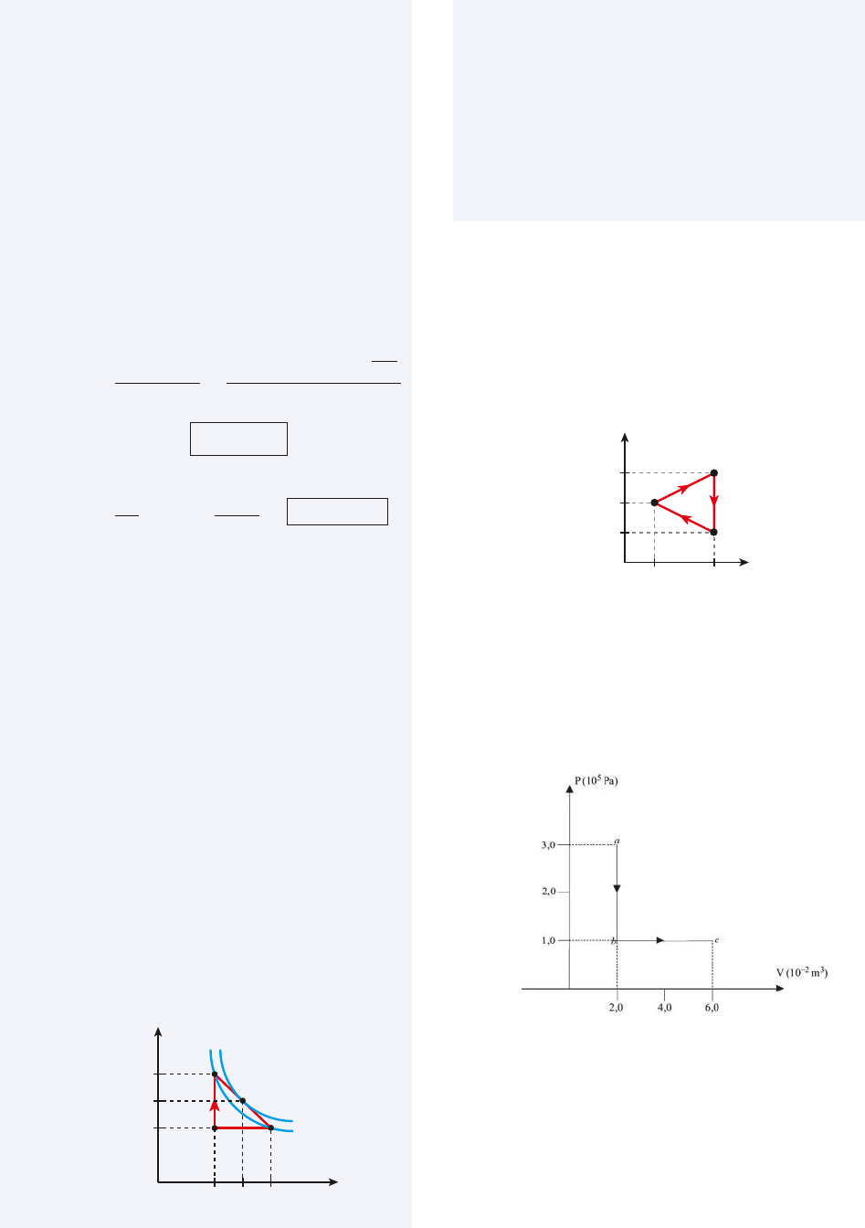 179TÓPICO 5 | TERMODINÂMICA 38. Uma máquina térmica executa o ciclo descrito no diagrama pV abaixo. O ciclo inicia-se no estado A, vai para o B, segundo a parte superior do diagra- ma, e retorna para A, passando por C. Sabendo-se que p0V0 5 13 J, calcule o trabalho realizado por esta máquina térmica ao longo de um ciclo, em joules. V 0 3V 0 A B C 0 p 0 2p 0 3p 0 p V 39. (Unifesp) Em um trocador de calor fechado por paredes diatérmicas, inicialmente o gás monoa- tômico ideal é resfriado por um processo isocó- rico e depois tem seu volume expandido por um processo isobárico, como mostra o diagrama pressão versus volume. a) Indique a variação da pressão e do volume no processo isocórico e no processo isobárico e determine a relação entre a temperatura inicial, no estado termodinâmico a, e final, no estado termodinâmico c, do gás monoa- tômico ideal. b) Calcule a quantidade total de calor trocada em todo o processo termodinâmico abc. Determine: a) o trabalho realizado pelo gás ao percorrer o ciclo uma vez; b) a potência desenvolvida, sabendo que a duração de cada ciclo é de 0,5 s; c) o ponto onde a energia interna do sistema é máxima e onde é mínima. Dados: 1 atm 5 105 N/m2; 1 L 5 1 dm3 5 1023 m3. Resolução: a) Num ciclo, o trabalho do sistema é igual a sua “área” interna: 5 L 1 atm 2 5 10 m 1 10 N m 2ABC 3 3 5 2 τ 5 ? 5 ? ? ? 2 250 JABCτ 5 b) A potência desenvolvida é dada por: Pot t Pot 250 J 0,5 s Pot 500 Wτ ⇒ ⇒5 D 5 5 c) Como a energia interna de um gás ideal é função de sua temperatura, podemos afirmar: I. A energia interna é mínima onde a temperatura também é mínima. Da Equação de Clapeyron, pV 5 nRT, observamos que a temperatura absolu- ta de um gás perfeito é mínima onde o produto pressão 3 volume é mínimo. Assim, do gráfico temos que a energia interna desse gás ideal é mínima no ponto A. II. A energia interna é máxima onde a tem- peratura e o produto p 3 V são máximos. Do gráfico, notamos que o produto p 3 V é o mesmo nos pontos B e C, o que indi- ca temperaturas iguais, sendo que a mesma isoterma passa por ambos. p (atm) V (L) B 2 1 5 0 10 A C 7,5 1,5 B a n c o d e i m a g e n s /A rq u iv o d a e d it o ra R e p ro d u ç ã o / U n if e s p , 2 0 11 Existe, no entanto, outra isoterma mais afastada dos eixos, que toca o ponto médio do segmento BC. É nesse ponto que a energia interna do sistema é máxima. Lembremos que, quanto mais afastada dos eixos se encontra uma isoterma, maior é a temperatura associada a ela. B a n c o d e i m a g e n s / A rq u iv o d a e d it o ra 2CONECTEFis_MERC18Sa_U1_Top5_p160a207.indd 179 7/7/18 2:15 PM 180 UNIDADE 1 | TERMOLOGIA 40. (AFA-RJ) O diagrama abaixo representa um ciclo realizado por um sistema termodinâmico consti- tuído por n mols de um gás ideal. 1,0 0 0,2 B C A D 0,4 0,6 2,0 p (105 N/m2) V (L) Sabendo-se que em cada segundo o sistema realiza 40 ciclos iguais a este, é correto afirmar que a (o) a) potência desse sistema é de 1 600 W. b) trabalho realizado em cada ciclo é 240 J. c) quantidade de calor trocada pelo gás com o ambiente em cada ciclo é nula. d) temperatura do gás é menor no ponto C. 41. (Unip-SP) Para 1 mol de um gás perfeito, subme- tido a uma pressão p e ocupando um volume V, a temperatura absoluta T e a energia interna U são dadas por: T pV R 5 e U 3 2 pV5 Considere uma amostra de 1 mol de gás perfeito, sofrendo as transformações AB, BC e CA indicadas no diagrama pressão 3 volume: pressão volume A a b 4b B 4a 0 C Analise as proposições que se seguem: I. Nos estados A e B, a energia interna do gás é a mesma, o que nos leva a concluir que, na transformação AB, não ocorreu troca de energia entre o gás e o meio externo. II. Em todo o ciclo, a temperatura é mínima no estado C. III. Nos estados A e B, a temperatura é a mesma. IV. Na transformação BC, a energia interna do gás vai diminuindo, o que significa que o gás está cedendo energia para o meio ex- terno. Estão corretas apenas: a) II, III e IV. b) I, II e III. c) I e IV. d) II e III. e) II e IV. 42. (AFA-RJ) Um sistema termodinâmico constituído de n mols de um gás perfeito monoatômico de- senvolve uma transformação cíclica ABCDA re- presentada no diagrama a seguir. De acordo com o apresentado pode-se afirmar que a) o trabalho em cada ciclo é de 800 J e é reali- zado pelo sistema; b) o sistema termodinâmico não pode representar o ciclo de uma máquina frigorífica uma vez que o mesmo está orientado no sentido anti-horário; c) a energia interna do sistema é máxima no ponto D e mínima no ponto B; d) em cada ciclo o sistema libera 800 J de calor para o meio ambiente. 43. (Unip-SP) O gráfico a seguir representa a pressão em função do volume para 1 mol de um gás per- feito. p (N/m2) V (m3) A B C D 3a 2a a 0 a 2a 3a 4a O gás percorre o ciclo ABCDA, que tem a forma de uma circunferência. Indique a opção falsa. a) As temperaturas nos estados A e B são iguais. b) As temperaturas nos estados C e D são iguais. c) O trabalho realizado pelo gás, entre os estados A e C, é 4 a 2 2π . d) O trabalho realizado no ciclo vale (πa2) joules. e) Na transformação de A para B, o gás recebeu uma quantidade de calor de 2 4 a2 π 1 joules. R e p ro d u ç ã o /A rq u iv o d a e d it o ra R e p ro d u ç ã o /A rq u iv o d a e d it o ra R e p ro d u ç ã o /A F A , 2 0 1 6 R e p ro d u ç ã o /A rq u iv o d a e d it o ra 2CONECTEFis_MERC18Sa_U1_Top5_p160a207.indd 180 7/7/18 2:15 PM 181TÓPICO 5 | TERMODINÂMICA 7. Calores específicos dos gases perfeitos A variação de temperatura de certa massa de gás pode ser realizada de três maneiras: a volume constante, a pressão constante e a volume e pressão variáveis. Verifica-se que, em cada um desses processos, cada unidade de massa do gás precisa receber ou ceder quantidades diferentes de calor para que sua tempera- tura sofra a variação de uma unidade. Esse fato leva-nos a estudar dois desses casos, 