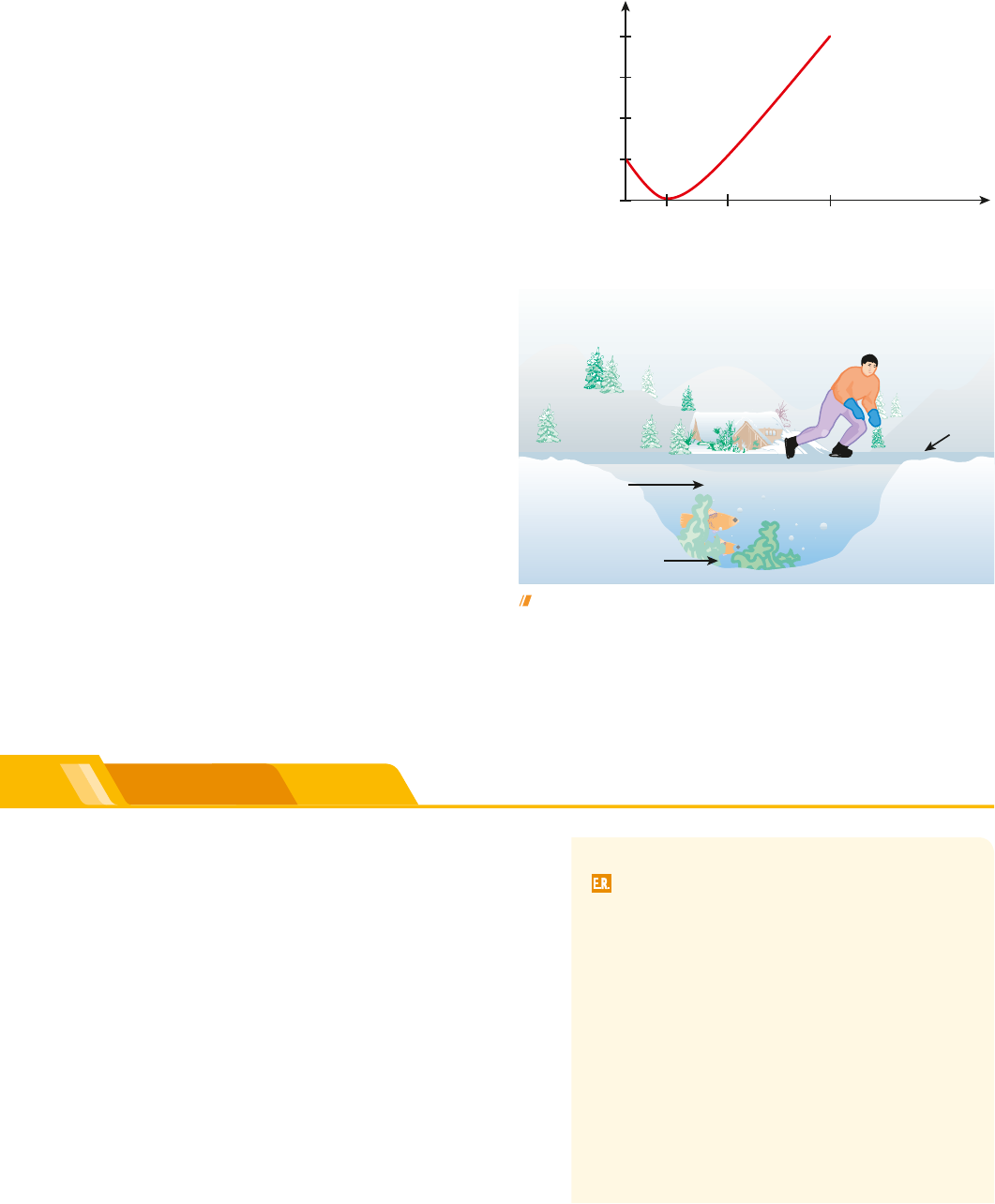 227TÓPICO 6 | DILATAÇÃO TÉRMICA DOS SÓLIDOS E DOS LÍQUIDOS 8. A dilatação anormal da água Em geral, um líquido, quando aquecido, sem- pre dilata, aumentando de volume. No entanto, a água constitui uma exceção a essa regra, pois, ao ser aquecida de 0 8C a 4 8C, tem seu volume di- minuído. Apenas para temperaturas acima de 4 8C a água dilata normalmente ao ser aquecida. Para melhor ilustrar, vejamos o gráfico ao lado, que representa a variação de volume de 1 g de água pura em função da sua temperatura. É importante observar que a 4 8C o volume da água é mínimo e, portanto, sua massa específica é máxima. Esse tipo de dilatação anormal da água ex- plica por que um lago congela apenas na super- fície, como observado na imagem de abertura desse tópico. Durante o resfriamento da água da superfície, até 4 8C a densidade aumenta, e essa água desce, produzindo a subida da água mais quente do fundo (convecção). Isso ocorre até que toda a água do lago atinja 4 8C, pois, a partir daí, quando a temperatura da água da su- perfície diminui, seu volume aumenta, diminuin- do a densidade. Em consequência, essa água mais fria não desce mais e acaba solidificando. Esse gelo formado na superfície isola o restan- te da água, fazendo com que a temperatura no fundo do lago se conserve acima de 0 8C, possi- bilitando que a vida aquática possa continuar existindo. água a 0 °C gelo a 0 °C água a pouco menos de 4 °C A dilatação anormal da água faz com que apenas a superfície de um lago se solidifique. O gelo formado isola o restante da água (o gelo é péssimo condutor de calor), fazendo com que a temperatura no fundo do lago seja superior a 0 8C e, desse modo, preserve a vida animal e vegetal lá existente. B a n c o d e i m a g e n s /A rq u iv o d a e d it o ra B a n c o d e i m a g e n s /A rq u iv o d a e d it o ravolume (cm3) 1,00020 temperatura (°C) 1,00040 1,00060 1,00080 1,00000 4 10 200 Nível 1Exercícios 48. Ao abastecer o carro num posto de gasolina, você compra o combustível por volume e não por mas- sa, isto é, você compra “tantos litros” e não “tan- tos quilogramas” de combustível. Assim, qual o melhor horário do dia para abastecer o carro se você quer fazer economia? 49. Um posto recebeu 5 000 L de gasolina num dia muito frio, em que a temperatura era de 10 8C. No dia seguinte, a temperatura aumentou para 30 8C, situação que durou alguns dias, o suficien- te para que a gasolina fosse totalmente vendida. Se o coeficiente de dilatação volumétrica da ga- solina é igual a 11 ? 1024 8C21, determine o lucro do proprietário do posto, em litros. 50. Um frasco de vidro, graduado em cm3 a 0 8C, contém mercúrio até a marca de 100,0 cm3, quando ainda a 0 8C. Ao se aquecer o conjunto a 120 8C, o nível de mercúrio atinge a marca de 101,8 cm3. Determine o coeficiente de dila- tação linear do vidro. Dado: coeficiente de dilatação do mercú- rio: gHg 5 18 ? 10 25 8C21 Resolução: A diferença de leitura corresponde à dilatação aparente do líquido, pois não podemos nos esquecer de que o frasco também dilatou: E.R. 2CONECTEFis_MERC18Sa_U1_Top6_p208a235.indd 227 7/7/18 2:16 PM 228 UNIDADE 1 | TERMOLOGIA Exercícios Nível 2 DVaparente 5 101,8 2 100,0 DVaparente 5 1,8 cm 3 Usamos a expressão da dilatação aparente dos líquidos: DVaparente 5 V0Agaparente Du Temos: 1,8 5 100,0 ? ga ? 120 ga 5 15 ? 10 25 8C21 porém: ga 5 gr 2 gf e gf 5 3af Portanto: 15 ? 1025 5 18 ? 1025 2 3af 3af 5 3 ? 10 25 af 5 avidro 5 1 ? 10 25 oC21 51. Um recipiente de volume V está cheio de um lí- quido a 20 8C. Aquecendo-se o conjunto a 70 8C, transbordam 5,0 cm3 de líquido. Esses 5,0 cm3 correspondem: a) à dilatação real do líquido. b) à dilatação aparente do líquido. c) à soma da dilatação real com a dilatação apa- rente do líquido. d) à diferença entre a dilatação real e a dilatação aparente do líquido. e) a três vezes a dilatação real do líquido. 52. Num recipiente de porcelana, graduado correta- mente em centímetros cúbicos a 30 8C, é colocado petróleo a 30 8C até a marca 500 cm3. Em seguida, eleva-se a temperatura do conjunto a 70 8C. Dados: coeficiente de dilatação cúbica do petró- leo 5 9,1 ? 1024 8C21; coeficiente de dilatação linear da porcelana 5 3,3 ? 1026 8C21. Determine: a) o coeficiente de dilatação aparente do petróleo, quando medido no frasco de porcelana; b) a marca atingida pelo petróleo no frasco, após o aquecimento; c) a dilatação real sofrida pelo petróleo. 53. (AFA-SP) Um recipiente tem capacidade de 3 000 cm3 a 20 8C e está completamente cheio de um deter- minado líquido. Ao aquecer o conjunto até 120 8C, transbordam 27 cm3. O coeficiente de dilatação apa- rente desse líquido, em relação ao material de que é feito o recipiente é, em 8C21, igual a: a) 3,0 ? 1025 b) 9,0 ? 1025 c) 2,7 ? 1024 d) 8,1 ? 1024 54. (OPF) Um recipiente de vidro, cujo coeficiente de di- latação térmica é 5 ? 1026 8C21, tem volume igual a 100 dm3 e está completamente cheio de um líquido à temperatura ambiente (20 8C). Ao ser aquecido até 60 8C nota-se que foram derramados 0,20 dm3 do líquido aquecido. Calcule a dilatação real do líquido. a) 0,30 dm3 b) 0,15 dm3 c) 0,11 dm3 d) 0,22 dm3 e) 0,32 dm3 55. (AFA-SP) Em um laboratório de Física é propos- ta uma experiência onde os alunos deverão construir um termômetro, o qual deverá ser constituído de um bulbo, um tubo muito fino e uniforme, ambos de vidro, além de álcool colo- rido, conforme a figura abaixo. O bulbo tem capacidade de 2,0 cm³, o tubo tem área de secção transversal de 1,0 ? 1022 cm² e compri- mento de 25 cm. No momento da experiên- cia, a temperatura no labo- ratório é 30 8C, e o bulbo é totalmente preenchido com álcool até a base do tubo. Sabendo-se que o coefi- ciente de dilatação do álcool é 11 ? 1024 8C21 e que o coeficiente de dilatação do vidro utilizado é des- prezível comparado ao do á