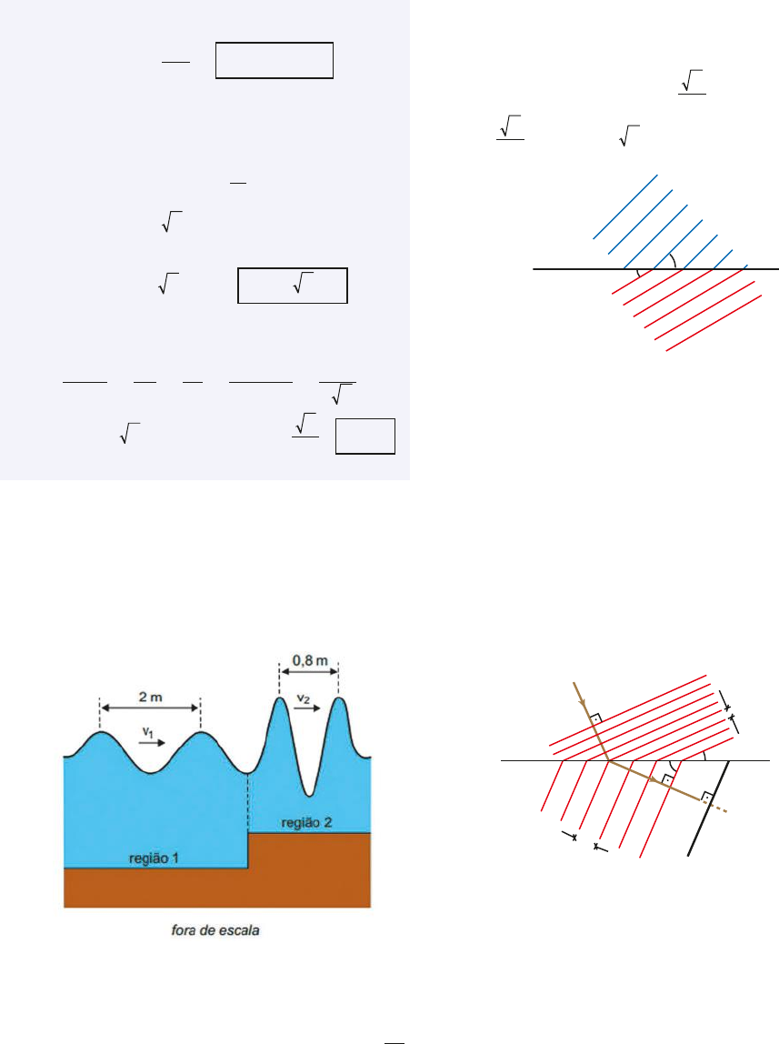 313TÓPICO 2 | ONDAS Sendo l 1 5 2 cm e T 5 0,4 s, temos: v 2 0,41 5 [ v1 5 5 cm/s b) Para o cálculo do comprimento de onda (l2), na região funda, usamos a mesma relação do item anterior: v 5 lf ⇒ v T 5 l ⇒ l 5 v t Sendo v 5 22 5 e T 5 0,4 s, já que o período não muda na refração, temos: 5 2 0,42l 5 ? [ l 5 2 2 cm2 c) Pela Lei de Snell, podemos calcular o ân- gulo de refração (r): 5 l l 5 5⇒ sen i senr v v sen 30° senr 2 2 2 1 2 1 2 5 ?senr 2 sen 30° ⇒ 5senr 2 2 [ r 5 45o 76. (Famema-SP) Com o objetivo de simular as ondas no mar, foram geradas, em uma cuba de ondas de um laboratório, as ondas bidimensionais re- presentadas na figura, que se propagam de uma região mais funda (região 1) para uma região mais rasa (região 2). Sabendo que quando as ondas passam de uma região para a outra sua frequência de oscilação não se altera e considerando as medidas indica- das na figura, é correto afirmar que a razão v v 1 2 entre as velocidades de propagação das ondas nas regiões 1 e 2 é igual a a) 1,6 b) 0,4 c) 2,8 d) 2,5 e) 1,2 77. (Cesgranrio) Um vibrador produz ondas planas na superfície de um líquido com frequência f 5 10 Hz e comprimento de onda l 5 28 cm. Ao passarem do meio I para o meio II, como mostra a figura, foi verificada uma mudança na direção de pro- pagação das ondas. (Dados: sen 308 5 cos 608 5 5 0,5; sen 608 5 cos 308 5 3 2 ; sen 458 5 cos 458 5 5 2 2 . Considere 2 5 1,4.) meio I meio II 45° 30° No meio II, os valores da frequência e do compri- mento de onda serão, respectivamente, iguais a: a) 10 Hz; 14 cm. b) 10 Hz; 20 cm. c) 10 Hz; 25 cm. d) 15 Hz; 14 cm. e) 15 Hz; 25 cm. 78. O esquema a seguir representa a refração de uma onda sonora plana que passa de um meio 1 (ar) para um meio 2 (gás em alta temperatura e alta pressão). Estão indicados o raio incidente AB, o raio refratado BC e algumas frentes de onda. Uma barreira EF está posicionada no meio 2, perpendicularmente ao raio BC, com o objetivo de refletir o som. A B 53° 37° E C F l 1 5 6,6 cm l 2 meio 1 meio 2 A distância entre os pontos B e F é igual a 55 cm e adota-se para a intensidade da velocidade do som no meio 1 o valor 330 m/s. Dados: sen 378 5 cos 538 5 0,60; sen 538 5 cos 378 5 0,80. Determine: a) as frequências f1 e f2 da onda sonora, respec- tivamente, nos meios 1 e 2; b) o comprimento de onda l2 da onda sonora no meio 2; c) o intervalo de tempo Dt transcorrido entre a passagem da onda pelo ponto B e seu retorno a esse mesmo ponto depois de sofrer reflexão na barreira. B a n c o d e i m a g e n s /A rq u iv o d a e d it o ra R e p ro d u ç ã o /A rq u iv o d a e d it o ra R e p ro d u ç ã o /F a m e m a , 2 0 1 6 2CONECTEFIS_MERC18Sa_U2_Top2_p275a351.indd 313 7/7/18 2:26 PM 314 UNIDADE 2 | ONDULATÓRIA Bloco 4 A 1 A 2 A A 1 A 2 x 1 x 2 x pulso resultante A 5 A1 1 A2 x 5 x1 1 x2 A 1 A 2 13. Superposição de pulsos em cordas A superposição de duas ou mais ondas de mesma natureza provoca no local da superposição uma perturbação resultante igual à “soma algébrica” das per- turbações individuais de cada onda. Em uma corda tensa fica mais fácil visualizar esse fenômeno. Assim, conside- re uma corda esticada, disposta horizontalmente. Nas suas extremidades vamos produzir dois pulsos de mesma largura e amplitudes diferentes: A1 e A2. O resul- tado da superposição depende da forma como esses pulsos foram originados. Devemos, então, considerar duas situações: 1 a situação: pulsos em fase No instante da superposição dos pulsos em fase, observamos que cada ponto da corda na região de superposição apresenta uma elongação x igual à soma das elongações x1 e x2 que cada pulso produziria nesse ponto se lá chegasse sozinho. É evidente que a crista resultante tem uma amplitude igual à soma das amplitudes individuais dos pulsos. A esse tipo de superposição de pulsos (em fase) dá-se o nome de interferência construtiva. É importante observar que após a superposição os pulsos continuam suas propagações normalmente, como se nada tivesse acontecido. Esse fato justifica-se pelo Princípio da Independência da Propagação Ondulatória. Assim, após a superposição, a configuração da corda passa a ser: B a n c o d e i m a g e n s /A rq u iv o d a e d it o ra B a n c o d e i m a g e n s / A rq u iv o d a e d it o ra B a n c o d e i m a g e n s / A rq u iv o d a e d it o ra 2CONECTEFIS_MERC18Sa_U2_Top2_p275a351.indd 314 7/7/18 2:26 PM 315TÓPICO 2 | ONDAS B a n c o d e i m a g e n s /A rq u iv o d a e d it o ra Observe a sequência a seguir: 2a situação: pulsos em oposição de fase A 1 A 2 B a n c o d e i m a g e n s /A rq u iv o d a e d it o ra A A 1 A 2 x 1 x 2 x pulso resultante No instante da superposição dos pulsos em oposição de fase, observamos que cada ponto da corda na região de superposição apresenta uma elongação x, igual à diferença das elongações x1 e x2 que cada pulso produziria nesse ponto se lá chegasse sozinho. É evidente que a crista resul- tante tem uma amplitude igual à diferença das amplitudes individuais desses pulsos. A 5 A1 2 A2 x 5 x1 2 x2 B a n c o d e i m a g e n s /A rq u iv o d a e d it o ra 2CONECTEFIS_MERC18Sa_U2_Top2_p275a351.indd 315 7/7/18 2:26 PM