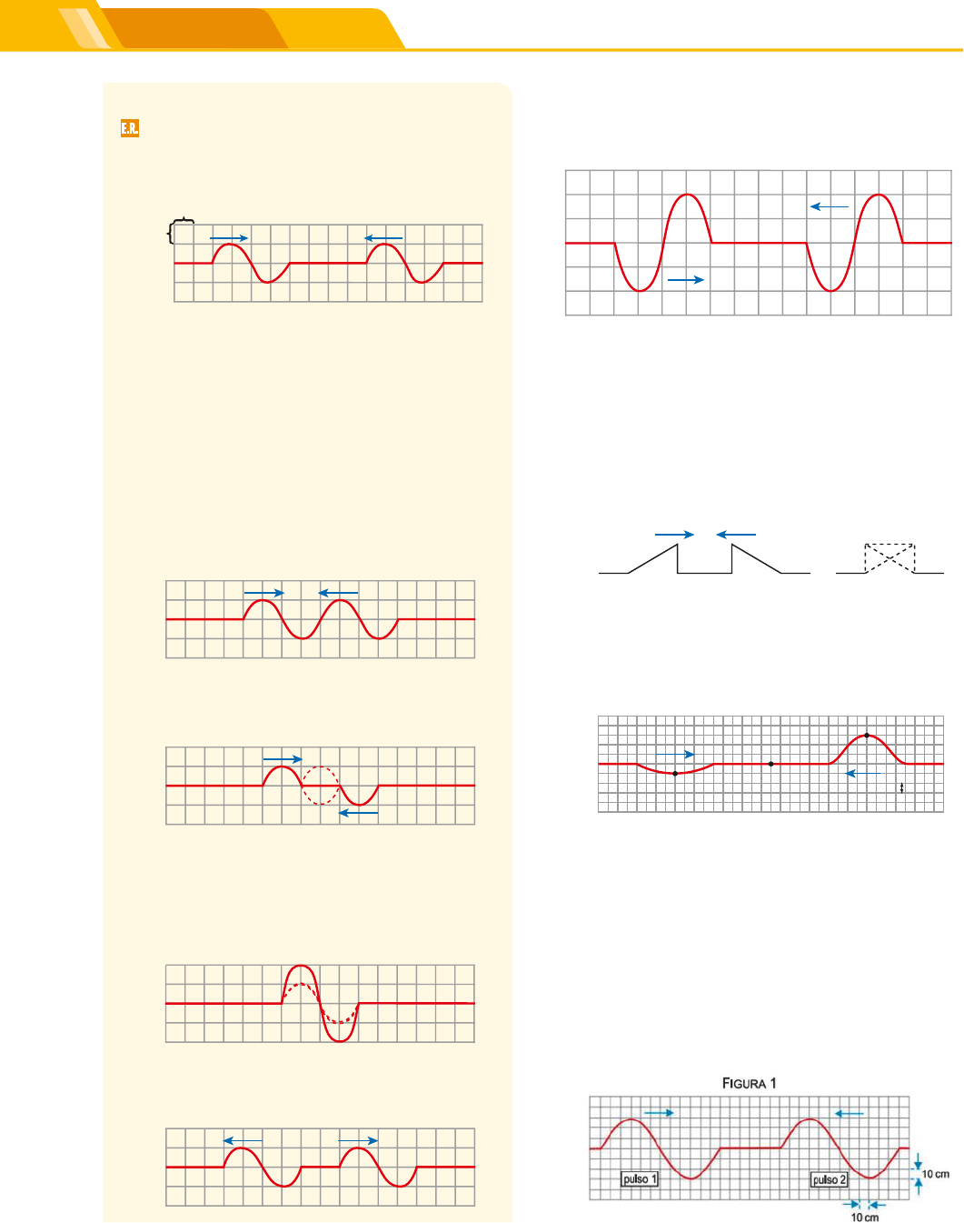 325TÓPICO 2 | ONDAS 79. No esquema a seguir, observamos duas ondas de mesmo comprimento de onda e mesma amplitude, que se propagam numa mesma corda homogênea em sentidos opostos: 1 cm 1 cm Sabendo que a situação indicada ocorreu no instante t 5 0 e que a velocidade das ondas é igual a 1 cm/s, determine o perfil da corda nos instantes: a) t1 5 2 s; b) t2 5 3 s; c) t3 5 4 s; d) t4 5 7 s. Resolução: a) Até o instante t1 5 2 s, as ondas deslocam- -se 2 cm cada uma, no sentido de suas propagações: b) Do instante t1 5 2 s até o t2 5 3 s, as ondas avançam mais 1 cm cada uma. Então, te- mos a seguinte configuração: Note que na parte central da corda houve uma interferência destrutiva. c) No instante t3 5 4 s, as ondas se super- põem em concordância de fase, ocorrendo uma interferência construtiva: d) De t3 5 4 s até t4 5 7 s, as ondas percorrem mais 3 cm. Temos, então, o seguinte perfil na corda: E.R. 80. A figura abaixo mostra, em um certo instante, duas ondas que se propagam numa corda longa, com o mesmo período T 5 4 s: Qual será a forma da onda resultante três segun- dos após o instante mostrado acima? 81. Em uma mesma corda são produzidos dois pulsos, que se propagam em sentidos opostos (figura A). No instante em que esses pulsos estiverem total- mente superpostos (figura B), qual será a forma da corda? figura A figura B 82. Dois pulsos, X e Y, propagam-se ao longo de um fio homogêneo, como indicado na figura a seguir: X Y P 1 cm Quando os pulsos estiverem exatamente super- postos, qual será a amplitude do pulso resultante no ponto P? 83. (Famerp-SP) Dois pulsos transversais, 1 e 2, pro- pagam-se por uma mesma corda elástica, em sentidos opostos, com velocidades escalares constantes e iguais, de módulo 60 cm/s. No ins- tante t 5 0, a corda apresenta-se com a configu- ração representada na figura 1. Nível 1Exercícios B a n c o d e i m a g e n s / A rq u iv o d a e d it o ra B a n c o d e i m a g e n s / A rq u iv o d a e d it o ra B a n c o d e i m a g e n s / A rq u iv o d a e d it o ra B a n c o d e i m a g e n s / A rq u iv o d a e d it o ra B a n c o d e i m a g e n s / A rq u iv o d a e d it o ra B a n c o d e i m a g e n s /A rq u iv o d a e d it o ra B a n c o d e i m a g e n s / A rq u iv o d a e d it o ra B a n c o d e i m a g e n s / A rq u iv o d a e d it o ra R e p ro d u ç ã o /F a m e rp , 2 0 1 7 2CONECTEFIS_MERC18Sa_U2_Top2_p275a351.indd 325 7/7/18 2:27 PM 326 UNIDADE 2 | ONDULATÓRIA Após a superposição desses dois pulsos, a corda se apresentará com a configuração representada na figura 2. Considerando a superposição apenas desses dois pulsos, a configuração da corda será a represen- tada na figura 2, pela primeira vez, no instante a) 1,0 s. b) 1,5 s. c) 2,0 s. d) 2,5 s. e) 3,0 s. 84. Um afinador de pianos, ao realizar seu trabalho, vale-se de diapasões que emitem sons de frequên- cias-padrão. Para afinar certa nota, após acioná-la, ele percute o diapasão correspondente e ouve os dois sons. A afinação da nota será considerada finda quando o afinador não observar entre os sons do piano e do diapasão: a) interferência. b) polarização. c) batimentos. d) ressonância. e) reflexão. 85. Em uma corda vibrante, é possível observar ondas estacionárias. Elas se formam devido aos fenô- menos de: a) reflexão e refração. b) dispersão e reflexão. c) refração e polarização. d) reflexão e interferência. e) interferência e polarização. 86. Uma onda estacionária é estabelecida numa cor- da, de modo a formar três ventres e quatro nós, como está esquematizado na figura: Sabendo que a distância entre os nós extremos é de 1,5 m e a velocidade da onda é de 10 m/s, de- termine a frequência dessa onda. 87. Uma corda de comprimento < 5 2,4 m vibra com frequência de 300 Hz no estado estacionário re- presentado na figura. Qual a velocidade de pro- pagação da onda na corda? , 5 2,4 m 88. O esquema seguinte representa a configuração estacionária formada numa corda elástica, que tem uma extremidade fixa e outra vibrante: 6,0 cm 3,0 cm A respeito da onda estacionária formada na corda, aponte a alternativa verdadeira: a) Embora sua velocidade de propagação seja nula, ela transporta energia. b) Sua amplitude vale 6,0 cm. c) Seu comprimento de onda vale 3,0 cm. d) A distância entre dois de seus nós pode ser de 6,0 cm. e) A distância entre dois de seus ventres é de 4,0 cm. 89. (Aman-RJ) Em um forno de micro-ondas, o pro- cesso de aquecimento é feito por ondas eletro- magnéticas que atingem o alimento ali colocado, incidindo assim nas moléculas de água nele pre- sentes. Tais ondas, de frequência 2,45 GHz, atingem aquelas moléculas, que, por possuí- rem esta mesma frequência natural, passam a vibrar cada vez mais intensamente. Desse modo, podemos afirmar que o aquecimento descrito é decorrente do seguinte fenômeno ondulatório: a) batimento. b) refração. c) interferência. d) ressonância. e) difração. B a n c o d e i m a g e n s / A rq u iv o d a e d it o ra B a n c o d e i m a g e n s / A rq u iv o d a e d it o ra B a n c o d e i m a g e n s / A rq u iv o d a e d it o ra R e p ro d u ç ã o /F a m e rp , 2 0 1 7 2CONECTEFIS_MERC18Sa_U2_Top2_p275a351.indd 326 7/7/18 2:27 PM 327TÓPICO 2 | ONDAS Exercícios Nível 2 90. (SBF) Dois pulsos de onda propagam-se sem dis- persão ao longo de uma linha reta, aproximando-se um do outro. O módulo da velocidade de propaga- ção dos pulsos é v. No instante t0 = 0 a forma da onda é mostrada na figura abaixo. Nesse instante ainda não há superposição entre os dois pulsos e a distância entre os mínimos que os lideram é D. t 5 0 v D v No instante 5 ? t D 2 v a forma da onda é dada por a) b) c) d) 91. Durante uma aula de ondulatória, o professor de Física levou a classe para o pátio da escola. Uti- lizando uma corda e uma mola, mostrou aos alu- nos ondas que se propagavam ao longo desses dispositivos. Em um dos experimentos, o mestre fixou uma d