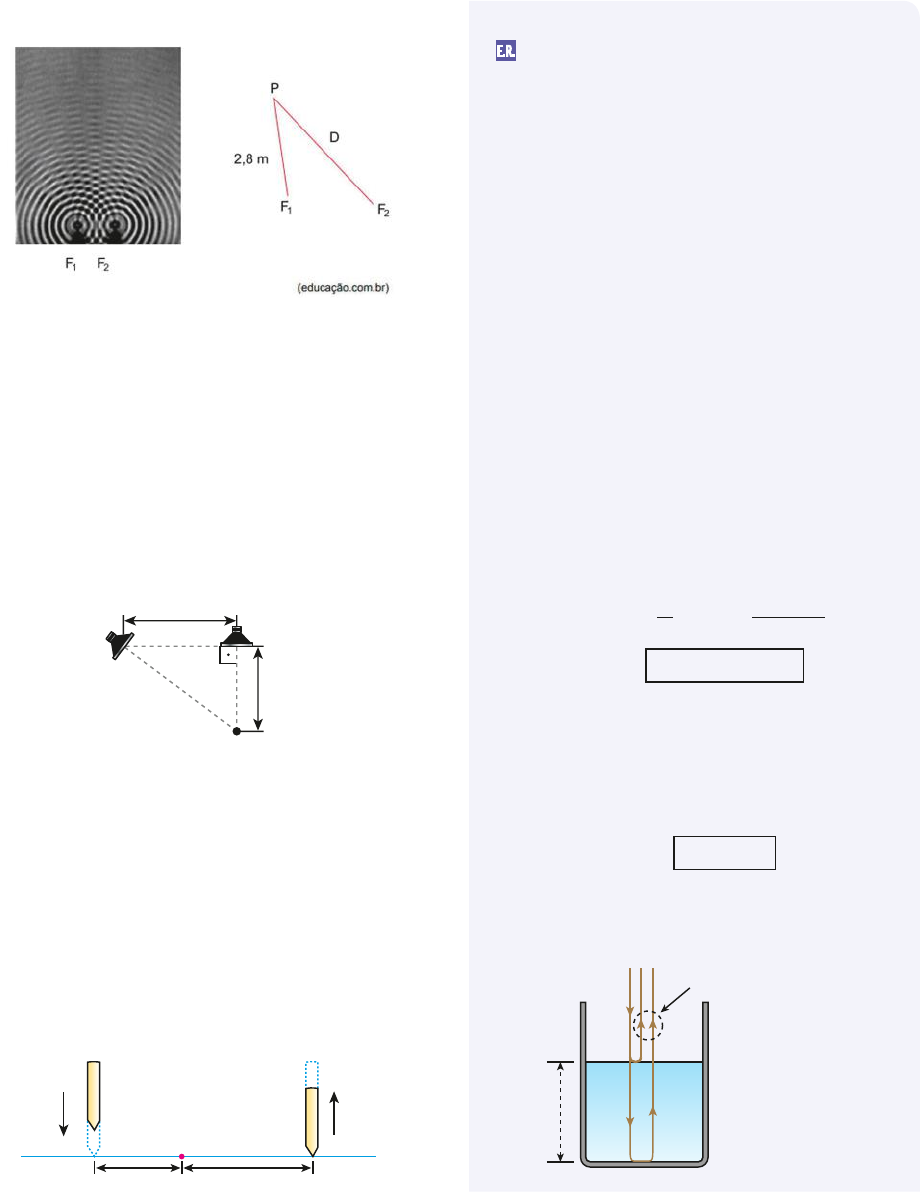 340 UNIDADE 2 | ONDULATÓRIA 107. (FGV-SP) As figuras a seguir representam uma foto e um esquema em que F 1 e F 2 são fontes de frentes de ondas mecânicas planas, coerentes e em fase, oscilando com a frequência de 4,0 Hz. As ondas produzidas propagam-se a uma velo- cidade de 2,0 m/s. Sabe-se que D . 2,8 m e que P é um ponto vibrante de máxima amplitude. Nessas condições, o menor valor de D deve ser a) 2,9 m. b) 3,0 m. c) 3,1 m. d) 3,2 m. e) 3,3 m. 108. (UFV-MG) Duas fontes de ondas sonoras, situadas nos pontos F 1 e F 2 , emitem ondas de mesma fre- quência e em fase. Uma pessoa situada no ponto P recebe as duas ondas com a mesma intensida- de não nula, vindas diretamente das fontes. A figura abaixo mostra a disposição das fontes e da pessoa. F 1 P 3 m 4 m F 2 O maior comprimento de onda, em metros, que deve ser emitido pelas fontes para que a pessoa não escute o som produzido por elas é: a) 0,5 b) 1 c) 2 d) 4 109. Dois estiletes E 1 e E 2 vibram verticalmente, exe- cutando movimentos harmônicos simples, de frequências iguais. Suas extremidades colidem com a superfície da água de um lago, provocando ondas de amplitudes iguais que se propagam sem amortecimento, com velocidade de 10 m/s. E 1 E 2 2,0 m 3,0 m P Sabendo que os estiletes vibram em oposição de fase, calcule a menor frequência de suas oscila- ções para que no ponto P indicado se observe: a) o máximo reforço das ondas que se superpõem; b) o anulamento das ondas que se superpõem. 110. Um tanque de fundo plano contém benzeno transparente de índice de refração absoluto igual a 1,5. Uma onda de telecomunicações com frequência igual a 100 MHz, emitida de um satélite, incide verticalmente sobre a superfície tranquila do benzeno, sendo em parte refletida na superfície líquida e em parte refletida no fundo do tanque. Saben- do-se que a intensidade da velocidade da luz no vácuo é igual a 3,0 ? 108 m/s, determine: a) a intensidade da velocidade da onda no interior do benzeno, bem como seu res- pectivo comprimento de onda; b) as três menores alturas do benzeno den- tro do tanque para que a parcela da onda refletida na superfície líquida seja cance- lada pela parcela da onda refletida no fundo do tanque. Resolução: a) A intensidade da velocidade da onda no interior do benzeno é calculada por: ⇒5 5 ?n c v 1,5 3,0 10 v 8 v 5 2,0 ? 108 m/s Aplicando-se a Equação Fundamental da Ondulatória, determinamos o comprimen- to de onda da onda do satélite no interior do benzeno. v 5 lf ⇒ 2,0 ? 108 5 l ? 100 ? 106 l 5 2,0 m É importante notar que mesmo sofrendo sucessivas refrações a onda mantém inal- terada sua frequência de 100 MHz. b) interferência destrutiva (ID) h E.R. B a n c o d e i m a g e n s /A rq u iv o d a e d it o ra R e p ro d u ç ã o /A rq u iv o d a e d it o ra B a n c o d e i m a g e n s / A rq u iv o d a e d it o ra R e p ro d u ç ã o /F G V , 2 0 1 7 2CONECTEFIS_MERC18Sa_U2_Top2_p275a351.indd 340 7/7/18 2:28 PM 341TÓPICO 2 | ONDAS Condição de ID: D 5 ly 2 Mas, Dy 5 2h, logo: 2h k 2 h k 2,0 4 (m)5 l 5 ?⇒ Donde: h 5 k ? 0,50 (m) (k 5 1, 3, 5, ...) Os três menores valores de h correspon- dem aos três menores valores de k (k 5 1, k 5 3 e k 5 5). Assim: Para k 5 1; h 5 1 ? 0,50 m ⇒ h 5 0,50 m Para k 5 3; h 5 3 ? 0,50 m ⇒ h 5 1,50 m Para k 5 5; h 5 5 ? 0,50 m ⇒ h 5 2,50 m 111. (Uece) Um método muito usado para inibir a reflexão da luz em vidros é recobri-los com um filme fino e transparente. A espessura mínima, em nm, que um filme fino com índice de re- fração 1,25 deve ter para que uma luz de com- primento de onda igual a 620 nm, no vácuo, não seja refletida, quando incide praticamen- te normal a um vidro de índice de refração 1,50, é: a) 155. b) 124. c) 112. d) 103. 112. (ITA-SP) Uma fina película de fluoreto de mag- nésio recobre o espelho retrovisor de um carro a fim de reduzir a reflexão luminosa. Determi- ne a menor espessura da película para que produza a reflexão mínima no centro do es- pectro visível. Considere o comprimento de onda l 5 5 500 Å, o índice de refração do vidro nv 5 1,50 e o da película np 5 1,30. Admita a incidência luminosa como quase perpendicular ao espelho. 113. (Enem) Ao diminuir o tamanho de um orifício atravessado por um feixe de luz, passa menos luz por intervalo de tempo, e próximo da situação de completo fechamento do orifício verifica-se que a luz apresenta um comportamento como o ilustrado nas figuras. Sabe-se que o som, dentro de suas particularidades, também pode se com- portar dessa forma. buraco raios de luz l‰mpada FIOLHAIS, G. Física divertida. Brasília: UnB, 2000 (adaptado). Em qual das situações a seguir está represen- tado o fenômeno descrito no texto? a) Ao se esconder atrás de um muro, um menino ouve a conversa de seus colegas. b) Ao gritar diante de um desfiladeiro, uma pes- soa ouve a repetição do seu próprio grito. c) Ao encostar o ouvido no chão, um homem percebe o som de uma locomotiva antes de ouvi-lo pelo ar. d) Ao ouvir uma ambulância se aproximando, uma pessoa percebe o som mais agudo do que quando aquela se afasta. e) Ao emitir uma nota musical muito aguda, uma cantora de ópera faz com que uma taça de cristal se despedace. 114. (OBF) Ondas de 6 cm de comprimento, produ- zidas na superfície de um tanque, propagam-se com uma velocidade de 0,06 m/s. Essas ondas encontram um anteparo com uma abertura de 3 cm. Pode-se afirmar que: a) ocorre difração e o comprimento de onda, após a abertura, é metade do anterior; b) ocorre difração e a frequência das ondas é sempre 1 Hz; c) ocorre refração e a velocidade de propagação das ondas aumenta; d) ocorre refração, embora as ondas se deslo- quem na mesma direção; e) as ondas sofrem reflexão, porque a abertura é menor que o comprimento de onda. R e p ro d u ç ã o /A rq u iv o d a e d it o ra 2CONECTEFIS_MERC18Sa_U2_Top2_p275a351.indd 341 7/7/18 2:28 PM 342 UNIDADE 2 | ONDULATÓRIA 115. Na montagem da experiênc