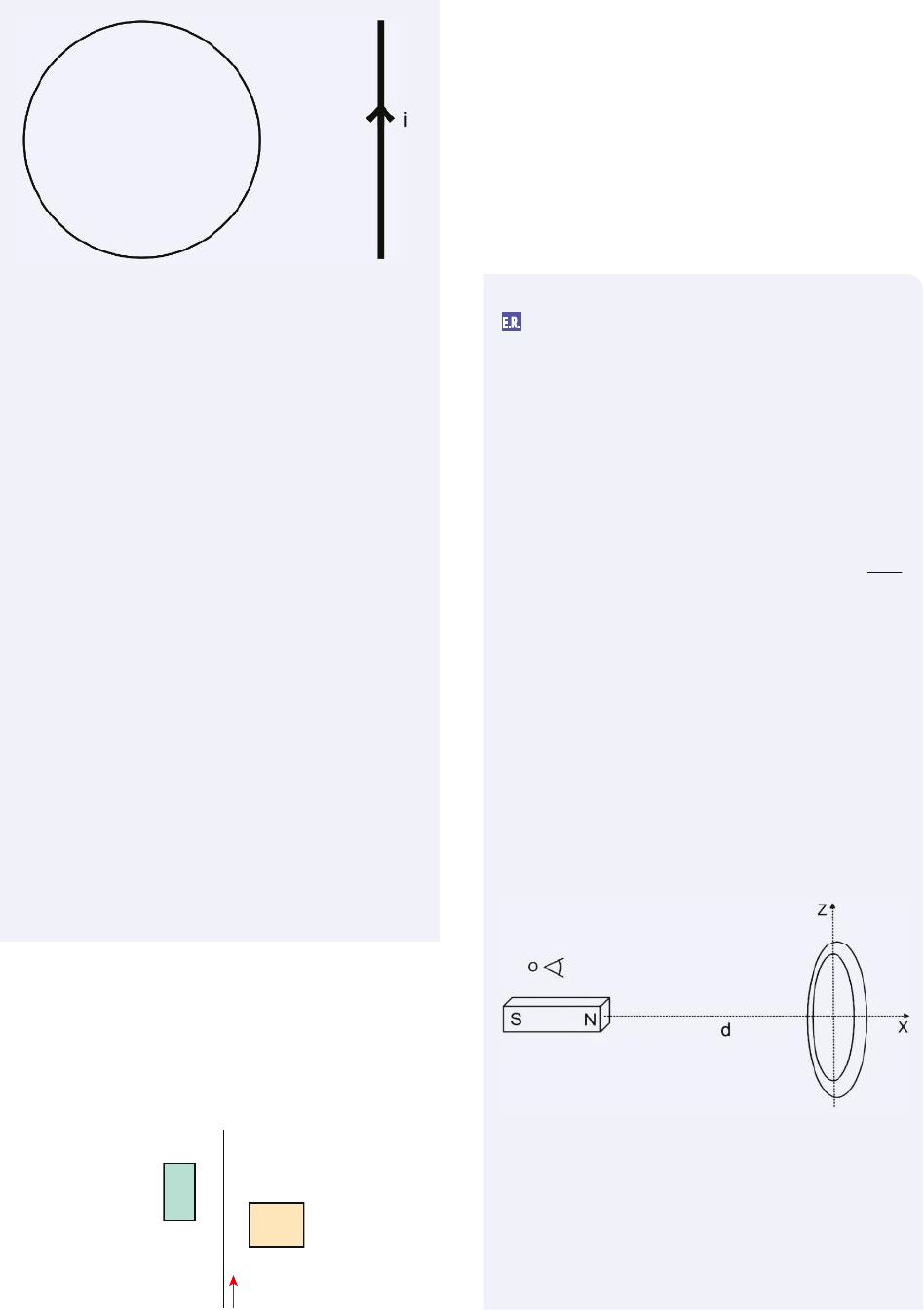 477TÓPICO 4 | INDUÇÃO ELETROMAGNÉTICA Verifica-se uma corrente elétrica induzida na espira condutora na(s) situação(ões) a) 1, apenas. b) 3, apenas. c) 1 e 2, apenas. d) 2 e 3, apenas. e) 1, 2 e 3. Resolução: Uma corrente elétrica será induzida na espira nas situações em que o fluxo magnético atra- vés dela for variável no tempo. Isso ocorre na situação 1, pois a espira girando faz com que a área que as linhas de campo têm de atra- vessar aumente e diminua ao longo de seu período de rotação; e na situação 2, pois a lâmpada piscando indica uma corrente elétri- ca no circuito, variável no tempo, a qual indu- zirá um campo magnético também variável no tempo ao atravessar a área delimitada pela espira. Na situação 3 a corrente elétrica, ao contrário, é constante, gerando um campo magnético invariante no tempo, que atravessa uma área também constante, sem variação no fluxo magnético e sem corrente induzida na espira. Resposta: alternativa c. 11. (UFPR) Michael Faraday foi um cientista inglês que viveu no século XIX. Através de suas des- cobertas foram estabelecidas as bases do ele- tromagnetismo, relacionando fenômenos da eletricidade, eletroquímica e magnetismo. Suas invenções permitiram o desenvolvimen- to do gerador elétrico, e foi graças a seus es- forços que a eletricidade tornou-se uma tec- nologia de uso prático. Em sua homenagem, uma das quatro leis do eletromagnetismo leva seu nome e pode ser expressa como: e 5 DF Dt , onde e é a força eletromotriz induzida em um circuito, F o fluxo magnético através desse circuito e t é o tempo. Considere a figura abaixo, que representa um ímã próximo a um anel condutor e um obser- vador na posição O. O ímã pode deslocar-se ao longo do eixo do anel e a distância entre o polo norte e o centro do anel é d. Tendo em vista essas informações, identifique as se- guintes afirmativas como verdadeiras (V) ou falsas (F): ( ) Mantendo-se a distância d constante se observará o surgimento de uma corrente induzida no anel no sentido contrário. ( ) Durante a aproximação do ímã à espira, observa-se o surgimento de uma corrente induzida no anel no sentido horário. E.R. 10. (ITA-SP) A figura a seguir representa um fio re- tilíneo pelo qual circula uma corrente de i am- pères no sentido indicado. Próximo do fio existem duas espiras retangulares A e B planas e copla- nares com o fio. Se a corrente no fio retilíneo está crescendo com o tempo, pode-se afirmar que: B A i R e p ro d u ç ã o /A rq u iv o d a e d it o ra a) aparecem correntes induzidas em A e B, ambas no sentido horário. b) aparecem correntes induzidas em A e B, ambas no sentido anti-horário. c) aparecem correntes induzidas no sentido an- ti-horário em A e horário em B. d) neste caso só se pode dizer o sentido da cor- rente induzida se conhecermos as áreas das espiras A e B. e) o fio atrai as espiras A e B. R e p ro d u ç ã o / U F P R , 2 0 1 5 R e p ro d u ç ã o /P U C , 2 0 1 7 3CONECTEFIS_MERC18Sa_U3_Top4_p457a495.indd 477 9/13/18 9:58 AM 478 UNIDADE 3 | ELETROMAGNETISMO ( ) Durante o afastamento do ímã em relação à espira, observa-se o surgimento de uma corrente induzida no anel no sentido horário. ( ) Girando-se o anel em torno do eixo z, ob- serva-se o surgimento de uma corrente induzida. Assinale a alternativa que apresenta a se- quência correta, de cima para baixo. a) F – F – V – V. b) F – V – F – V. c) V – V – F – F. d) V – F – V – V. e) F – F – V – F. Resolução: (F) Se a distância d for mantida constante, o ímã não estará em movimento e, como consequência, não haverá variação de flu- xo magnético no anel, tampouco corrente induzida. (F) A intensidade do campo magnético que corta a superfície do anel aumenta com a aproximação do ímã, ocasionando uma va- riação positiva do fluxo magnético. Essa variação induzirá uma corrente elétrica no anel tal que gere um campo magnético in- duzido que diminua esse fluxo. Essa dimi- nuição ocorrerá porque o campo induzido aplicará uma força sobre o ímã no sentido contrário a seu movimento, repelindo-o. Portanto, o campo magnético induzido tem de ser no sentido do eixo x negativo, gerado por uma corrente no sentido anti-horário do anel, pela regra da mão direita. (V) Neste caso, a variação do fluxo magnético é negativa e o campo magnético induzido na espira tende a aumentá-lo. Para isso, o cam- po magnético induzido deve ser no mesmo sentido do campo do ímã e, portanto, a cor- rente no anel deve ser no sentido horário. (V) As linhas do campo magnético do ímã atra- vessam uma área do anel que está cicli- camente variando o valor por conta de sua rotação. Portanto, haverá variação no flu- xo magnético no anel e, consequentemen- te, corrente elétrica induzida. Resposta: alternativa a. 13. (UPE) Uma bobina formada por 5 espiras que possui um raio igual a 3,0 cm é atravessada por um campo magnético perpendicular ao plano da bobina. Se o campo magnético tem seu módulo va- riado de 1,0 T até 3,5 T em 9,0 ms, é CORRE- TO afirmar que a força eletromotriz induzida foi, em média, igual a a) 25 mV b) 75 mV c) 0,25 V d) 1,25 V e) 3,75 V Resolução: A força eletromotriz induzida e nas espiras de raio r 5 3 ? 1022 m ocorre, pela Lei de Faraday, por conta da variação do fluxo mag- nético através delas. O fluxo magnético varia por conta da variação D D B t do campo mag- nético sobre a superfície total A 5 nπr2 das E.R. 12. Um anel metálico cai verticalmente devido ao seu peso em uma região de campo magnético cons- tante saindo perpendicularmente ao plano da folha, de acordo com a figura abaixo. Assinale a alternativa CORRETA sobre a corrente induzida no anel. a) Não existe corrente induzida no anel durante o percurso da queda, pois o campo é constante. b) A corrente induzida no anel é no sentido horá- rio quando o anel entra na região do campo. c) A corrente indu