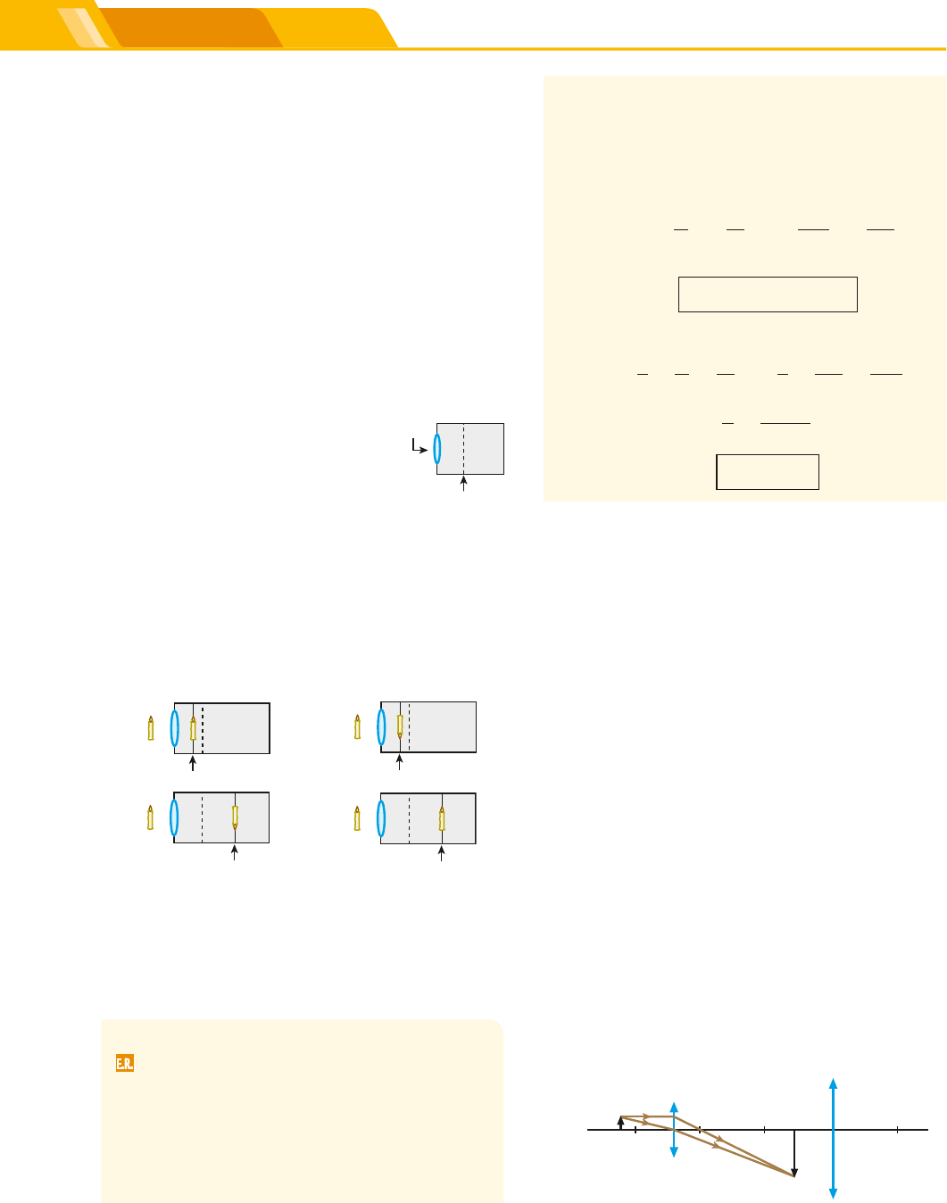 601TÓPICO 5 | INSTRUMENTOS ÓPTICOS E ÓPTICA DA VISÃO Nível 1Exercícios Resolução: a) Pelo enunciado, sabemos que p 5 5,0 cm, o 5 3,0 cm e i 5 180,0 cm. Utilizando a expressão para o aumento linear trans- versal, temos: A i o p' p 180 3,0 p' 5,0 ⇒5 52 2 52 Da qual: p' 5 300 cm 5 30 m b) Da Equação de Gauss, temos: 1 f 1 p 1 p' 1 f 1 5,0 1 300 ⇒ ⇒5 1 5 1 1 f 60 1 300 5 1 f > 4,9 cm 5. Uma lente convergente operando como lupa, com 5,0 cm de distância focal, amplia cinco vezes o tamanho de um pequeno objeto luminoso. Nessas condições, determine a distância entre o objeto e sua imagem. 6. (Fatec-SP) Um colecionador examina um selo com uma lupa localizada a 2,0 cm do selo e observa uma imagem 5 vezes maior. a) Determine a distância focal da lupa. b) Faça, em seu caderno, um esquema gráfico dos raios de luz representando a lupa, o selo, a imagem do selo e o olho do colecionador. 7. (Unesp-SP) Em uma aula sobre Óptica, o profes- sor explica aos seus alunos o funcionamento bá- sico de um microscópio óptico composto, que pode ser representado por duas lentes conver- gentes, a objetiva e a ocular. Quando o objeto a ser visualizado é colocado próximo à objetiva, uma imagem ampliada II é formada entre a ocular e o foco da ocular, como esquematizado na figura. Essa imagem é, então, ampliada pela ocular, gerando a imagem III, vista pelo observador. objetiva objeto ocular I I 1. (Unifei-MG) Um estudante construiu uma caixa retangular provida de uma lente biconvexa de dis- tância focal f 5 50,0 mm e pretende usá-la como máquina fotográfica. A distância entre a lente e a parte posterior da caixa onde será registrada a imagem pelo filme é de 150 mm. A que distância à frente da lente deve se localizar um objeto para que sua foto fique perfeitamente focalizada? 2. (UFMG) Rafael, fotógrafo lambe-lambe, possui uma câmara fotográfica que consiste em uma caixa com um orifício, onde é colocada uma lente. Dentro da caixa, há um filme fotográfico, posicionado a uma distância ajustável em relação à lente. Essa câmara está representada, esque- maticamente, na figura ao lado. Para produzir a imagem nítida de um objeto muito distante, o filme deve ser colocado na posição indi- cada pela linha tracejada. No entanto, Rafael deseja fotografar uma vela que está próxima a essa câmara. Para obter uma imagem nítida, ele, então, move o filme em relação à posição acima descrita. Indique a alternativa cujo diagrama melhor re- presenta a posição do filme e a imagem da vela que é projetada nele. a) filme b) filme c) filme d) filme 3. A lente de um antigo projetor de slides está a uma distância de 4,1 m da tela de projeção. Um slide de 35 mm de altura tem sua imagem projetada na tela com 1,4 m de altura. Qual a distância focal da lente do equipamento? 4. Deve-se projetar em uma tela a imagem de um slide que se encontra a 5,0 cm da lente do projetor. Sabendo que as alturas do slide e de sua imagem valem, respectivamente, 3,0 cm e 180 cm, calcule: a) a distância da tela à lente do projetor. b) a distância focal à lente do projetor. E.R. R e p ro d u ç ã o /A rq u iv o d a e d it o ra Il u s tr a ç õ e s : R e p ro d u ç ã o / A rq u iv o d a e d it o ra R e p ro d u ç ã o / A rq u iv o d a e d it o ralente filme 2CONECTEFiS_MERC18Sa_U3_Top5_p592a618.indd 601 7/7/18 2:31 PM 602 UNIDADE 3 | ÓPTICA GEOMÉTRICA Sendo assim: a) copie a figura em seu caderno e complete-a com raios de luz que mostrem a formação da imagem III gerada pela ocular. b) classifique como real ou virtual as imagens II e III. 8. Um objeto A está situado a 5 cm de uma lente con- vergente L 1 , cuja distância focal é de 4 cm. Uma se- gunda lente convergente, idêntica à anterior, é colo- cada a 2 cm de distância da imagem A' conjugada por L 1 . A figura a seguir ilustra a situação descrita: L 1 L 2 luz A' A a) A que distância de L 1 encontra-se L 2 ? b) Qual a ampliação total do sistema L 1 L 2 ? Exercícios Nível 2 10. Um fotógrafo amador criou um dispositivo capaz de projetar imagens no fundo de uma câmara. Tal dispositivo, esquematizado a seguir, é composto por uma lente esférica convergente (L), de distância focal 12 cm, um tubo móvel (T) e uma câmara escura (C). O L T 10 cm C 10 cm Ao se formar uma imagem nítida no fundo da câ- mara, o objeto luminoso (O) encontra-se a 60 cm da lente. a) Calcule quanto foi necessário deslocar o tubo, em relação à posição inicial indicada na figura acima, para focalizar a imagem nítida no fundo da câmara. b) Dê as características dessa imagem. 11. (Unesp-SP) Uma câmara fotográfica rudimentar utiliza uma lente convergente de distância focal f 5 50 mm para focalizar e projetar a imagem de um objeto sobre o filme. A distância da lente ao filme é p'5 52 mm. A figura mostra o esboço dessa câmara. Para se obter uma boa foto, é necessário que a imagem do objeto seja formada exatamente sobre o filme e seu tamanho não deve exceder a área sensível do filme. Assim: 9. A objetiva de uma câmera fotográfica tem dis- tância focal de 100 mm e é montada num mecanismo tipo fole, que permite seu avanço e retrocesso. A câmera é utilizada para tirar duas fotos: uma aérea e outra de um objeto distante 30 cm da objetiva. a) Qual o deslocamento da objetiva, de uma foto para a outra? b) Da foto aérea para a outra, a objetiva afas- ta-se ou aproxima-se do filme? Resolução: a) Na obtenção da foto aérea, o motivo da foto comporta-se como objeto impróprio. Por isso, sua imagem forma-se no plano focal da objetiva. Assim: p'1 > f Logo: p'1 5 100 mm Para a outra foto, tem-se: 1 f 1 p 1 p'2 2 5 1 ⇒ 1 100 1 300 1 p'2 5 1 p'2 5 150 mm Seja d o deslocamento pedido. Então, é correto que: d 5 p'2 2 p1' ⇒ d 5 150 mm 2 100 mm d 5 50 mm. b) Como p'2 . p'1 , pode-se concluir que da foto aérea para a outra a objetiva afasta-se do filme. E.R. B a n c o d e i m a g e n s /A rq u iv o d a e d it o ra B a n c o d e i m a 
