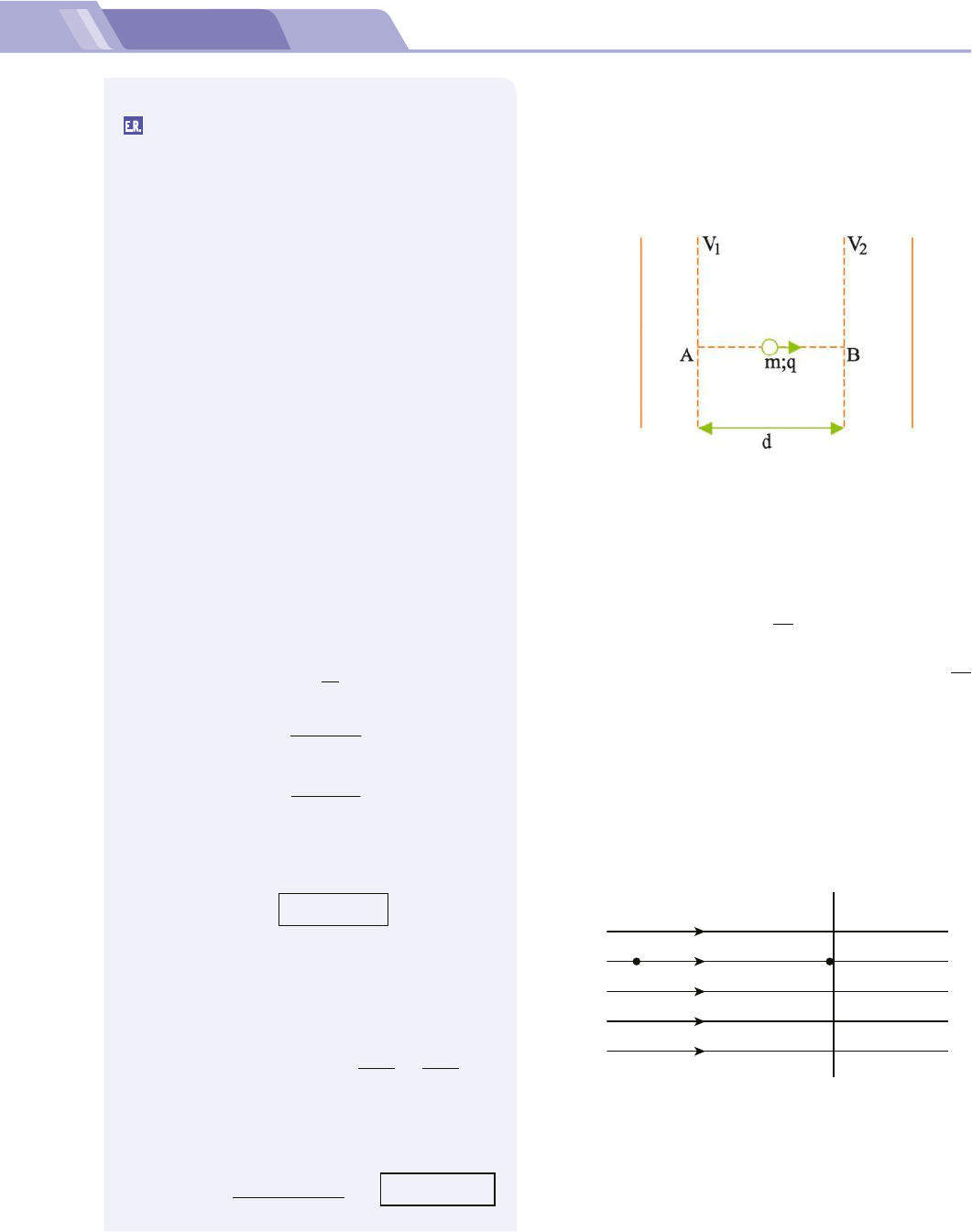 107TÓPICO 3 | POTENCIAL ELƒTRICO Exercícios Nível 2 31. Uma partícula fixa, eletrizada com carga 15,0 mC, é responsável pelo campo elétrico existente em determinada região do espaço. Uma carga de prova de 12,0 mC e 0,25 g de massa é abandonada a 10 cm da cargafon te, recebendo desta uma força de repulsão. Determine: a) o trabalho que o campo elétrico realiza para levar a carga de prova a 50 cm da cargafonte; b) a velocidade escalar da carga de prova, submetida exclusivamente ao campo ci tado, quando ela estiver a 50 cm da car gafonte. Dado: constante eletrostática do meio: k 5 1,0 ? 1010 N m2 C22. Resolução: a) O trabalho realizado pelo campo elétrico é calculado pela relação: τAB 5 q(nA 2 nB) (I) em que nA é o potencial na posição inicial e nB, o potencial na posição final. Assim, vamos calcular nA e nB usando a expressão: n 5 k Q d nA 5 1,0 ? 10 10 ? 5,0 10 0,10 6 ? 2 [ nA 5 5,0 ? 10 5 V nB 5 1,0 ? 10 10 ? 5,0 10 0,50 6 ? 2 [ nB 5 1,0 ? 10 5 V Voltando à relação (I), temos: τAB 5 2,0 ? 10 26 ? (5,0 ? 105 2 1,0 ? 105) τAB 5 0,80 J b) Como a partícula está exclusivamente sob a ação do campo elétrico, a força elétrica é a força resultante. Vamos usar, então, o Teorema da Energia Cinética. τ AB 5 DEC ⇒ τAB 5 mv 2 mv 2 B 2 A 2 2 Sendo m 5 0,25 ? 1023 kg, vA 5 0 e τAB 5 0,80 J, temos: 0,80 5 ? ? 20,25 10 v 2 3 B 2 ⇒ vB 5 80 m/s E.R. 32. (FGVSP) No interior de um campo elétrico unifor me, uma partícula, de massa m e eletrizada com carga q positiva, é abandonada do repouso no pon to A da superfície equipotencial V1. Ela é acelerada pela força do campo até o ponto B da superfície equipotencial V2, distante d de V1. Desprezados os efeitos gravitacionais, a veloci dade com que a partícula passará pelo ponto B depende a) diretamente da diferença de potencial V1 2 V2. b) diretamente da raiz quadrada da diferença de potencial V1 2 V2. c) diretamente da razão q m entre a carga e a mas sa da partícula. d) inversamente da raiz quadrada da razão q m entre a carga e a massa da partícula. e) inversamente da distância d entre as superfí cies equipotenciais V1 e V2. 33. (UPMSP) Uma partícula de massa 1 g, eletrizada com carga elétrica positiva de 40 mC, é abando nada do repouso no ponto A de um campo elétri co uniforme, no qual o potencial elétrico é 300 V. BA anteparo Essa partícula adquire movimento e se choca em B, com um anteparo rígido. Sabendose que o potencial elétrico do ponto B é de 100 V, a velocidade dessa partícula ao se chocar com o obstáculo é de: a) 4 m/s. b) 5 m/s. c) 6 m/s. d) 7 m/s. e) 8 m/s. R e p ro d u ç ã o /F G V -E c o n o m ia , 2 0 1 3 . R e p ro d u ç ã o /A rq u iv o d a e d it o ra 3CONECTEFIS_MERC18Sa_U1_Top3_p087a151.indd 107 9/13/18 9:38 AM 108 UNIDADE 1 | ELETROSTÁTICA 34. Ao colocarmos duas cargas pontuais q1 5 5,0 mC e q2 5 2,0 mC a uma distância d 5 30,0 cm, rea lizamos trabalho. Determine a energia potencial eletrostática, em joule, deste sistema de cargas pontuais. Dado: k 5 9 ? 109 N m2C22. 35. Um próton penetra com energia cinética de 2,4 ? 10216 J em uma região extensa de campo elétrico uniforme de intensidade 3,0 ? 104 N/C. A trajetória descrita é retilínea, com a partícula invertendo o sentido de movimento após percor rer uma distância d. Qual é o valor de d, saben dose que o próton se moveu no vácuo? Dado: carga do próton 5 1,6 ? 10219 C. 36. Um próton é acelerado no vácuo por uma diferença de potencial de 1 MV. Qual é o aumento da sua energia cinética? Dado: carga do próton 5 1,6 ? 10219 C. 37. Determinada região submetese exclusivamente a um campo elétrico, estando algumas de suas linhas de força representadas por linhas cheias na figura a seguir. S P R a) O que as linhas tracejadas representam? b) O potencial do ponto R é maior que o potencial do ponto S, menor que ele ou igual a ele? c) Se uma carga de prova positiva for abandonada no ponto P, em que sentido ela se moverá? O que ocorrerá com sua energia potencial? d) Repita o item c, empregando, agora, uma carga de prova negativa. 38. (UFBA) A figura apresenta as linhas de força de um campo elétrico uniforme, de intensidade igual a 100 N/C, gerado por duas placas paralelas com cargas de sinais contrários. A B 10 cm E R e p ro d u ç ã o /A rq u iv o d a e d it o ra B a n c o d e i m a g e n s / A rq u iv o d a e d it o ra Desprezandose a interação gravitacional, se uma partícula de carga elétrica igual a 2,0 ? 1023 C e massa m é abandonada em repouso no ponto A e passa pelo ponto B com energia potencial elé trica igual a 2,0 ? 1021 J, é correto afirmar: (01) A partícula deslocase para a direita, em movimento retilíneo uniforme. (02) As superfícies equipotenciais do campo elé trico que passam pelos pontos A e B são planos paralelos entre si e perpendiculares às linhas de força. (04) A força elétrica realiza trabalho para deslo car a partícula ao longo de uma superfície equipotencial. (08) A partícula, abandonada do repouso no cam po elétrico, deslocase espontaneamente, para pontos de potencial maior. (16) O potencial elétrico do ponto B é igual a 100 V. (32) A energia potencial elétrica da partícula, no ponto A, é igual a 2,2 ? 1021 J. Dê como resposta a soma dos números asso ciados às afirmações corretas. 39. (UPMSP) A ilustração abaixo referese a um es quema simplificado de parte de uma válvula ter miônica, também conhecida por diodo retificador. O filamento A é aquecido por Efeito Joule e, devi do ao potencial elétrico do filamento B, distante de A, 3,00 mm, elétrons se deslocam, a partir do repouso, de A para B, com aceleração pratica mente constante. Observação: Admita que entre A e B o campo elétrico seja uni forme. R e p ro d u ç ã o /M a ck e n zi e , 2 0 1 4 . 3CONECTEFIS_MERC18Sa_U1_Top3_p087a151.indd 108 9/13/18 9:38 AM 109TÓPICO 3 | POTENCIAL ELƒTRICO Se a ddp VB 2 VA mede 300 V, os referidos elétrons estarão sujeitos a uma força de