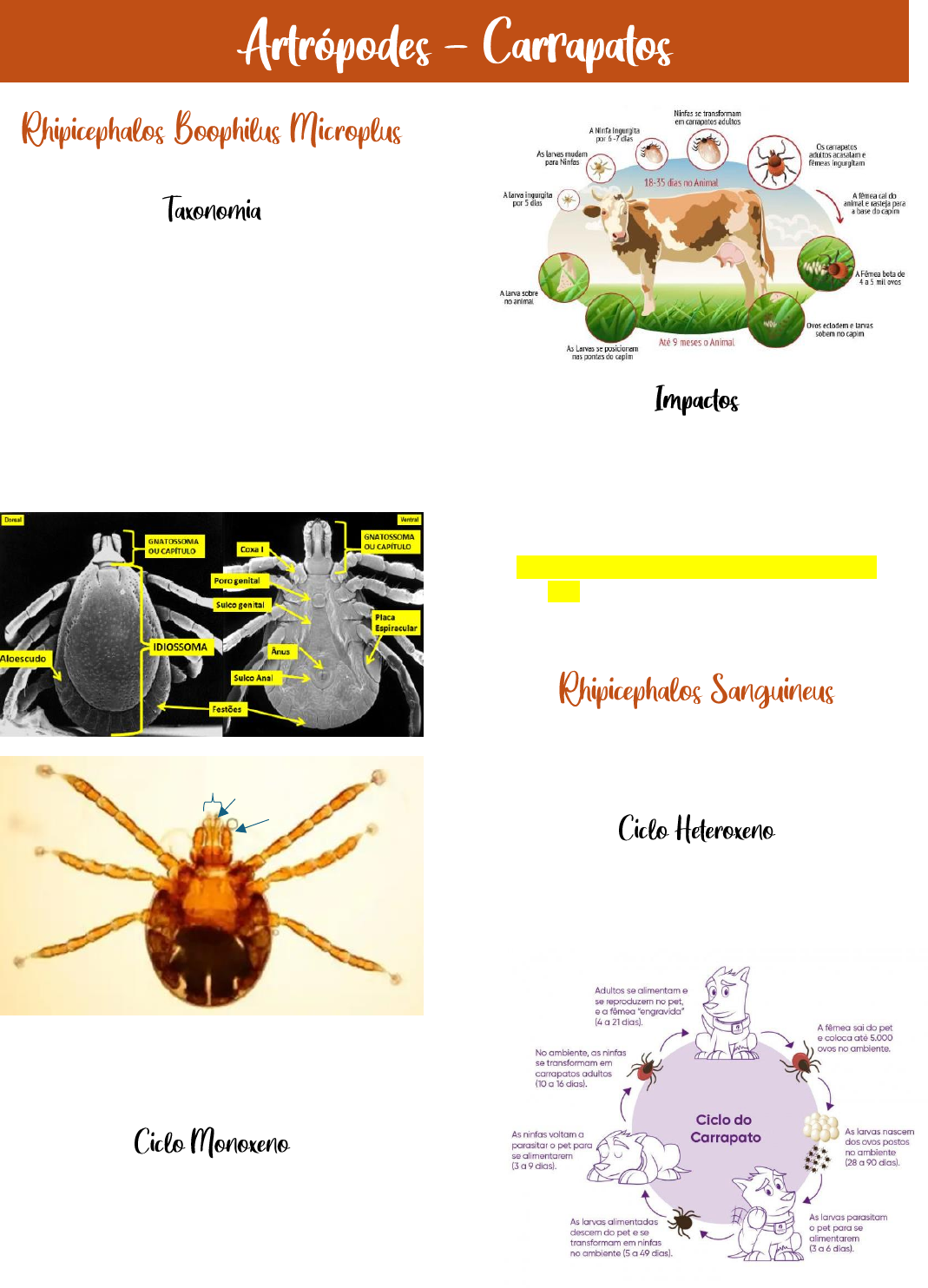 1 “carrapato do boi” Reino: Animalia Filo: Arthropoda Classe: Arachinida Ordem: Acari (ácaros de pequeno porte; larvas com 3 pares de patas; ninfas e adultos com 4 pares (ninfas não possui órgão genital)) Família: Ixodidae (Carrapatos duros com escuto dorsal cobrindo a face dorsal → machos cobre por completo e as fêmeas adultas, ninfas e larvas somente 1/3, pois o abdômen destente para abrigas ovos) Gênero: Rhipicephalus Espécie: R. Boophilus Microplus; R. Sanguineus Possui palpos e quelíceras (como se fosse os “dentes” e onde se encontra é chamado de hipostômio e ao seu redor tem os palpos) Os palpos são menores que o hipostômio no carrapato do boi. Os 3 estágios de desenvolvimento se alimentam no mesmo hospedeiro - Todas as mudas ocorrem no hospedeiro. Hospedeiros: Bovídeos domésticos e silvestres (pode acometer equinos) • Irritação local – predisposição para moscas (miíase); desvalorização do couro → impacto na produção • Anemia • Desvio de energia (deixa de se alimentar preocupado em se livrar do parasita) • Pode ser vetor de Babesia spp e Anaplasma spp. “carrapato do cão” Palpos maiores ou iguais ao hipostômio Base do capítulo é hexagonal • Parasito eurixeno • 3 hospedeiros (podem subir no mesmo) • Todas as mudas no ambiente • Hospedeiros: cães, gatos, carnívoros silvestres Hipostômio Quelíceras Palpos *A cada estágio evolutivo vão mudando o exoesqueleto* 2 • Infestações – irritação na pele • Anemia (espoliação) • Pode ser vetor de Erlichia Canis e Rickettsia Rickettis • Já foi encontrado em humanos!! “carrapato de equídeos” • Parasito eurixeno • Usa 3 hospedeiros (pode ser roedores e equídeos - pode usar 3 cavalos ou o mesmo 3x) • Parecido com o do cão Ovos depositados na pastagem eclodem e libera as larvas que vai subir no 1º hospedeiro (pequeno roedor) se alimentar e cai no ambiente, troca exoesqueleto e vira ninfa que vai subir para o 2º hospedeiro (roedor maior) se alimenta e cai no ambiente e vira adulta e sobe para o 3º hospedeiro(equídeos) onde vai acasalar e as fêmeas vão descer para o ambiente para colocar seus ovos. (mesma imagem do amblyoma) • Anemia • Respostas alérgicas – dermatites • Pode ser vetor de Babesia spp. e Theileria “carrapato estrela” • Adultos tem uma macha branca no escudo que lembra uma estrela. • Aparelho bucal grande • Precisa de condições boas – umidade • Mais difícil de controlar - ciclo muito longo, passa mais tempo no ambiente que no animal • Longo – no ambiente 4 a 6 meses; no animal 7 a 10 dias • Parasito eurixeno e zoonótico • Hospedeiros (3): mamíferos e aves • Reservatório: capivaras (raro pegar a febre maculosa) • Infestações – irritação na pele • Anemia (espoliação) • Pode ser vetor da bactéria da Febre maculosa • Acaricidas no ambiente – parede, teto e piso • Higiene das instalações • Limpeza das pastagens – calagem; rotação; gradagem do solo; tratamento com carrapaticida onerosa (muito caro) • Tratamento dos animais – Imersão (em água com princípios ativos); Aspersão (banho) • Educação sanitária