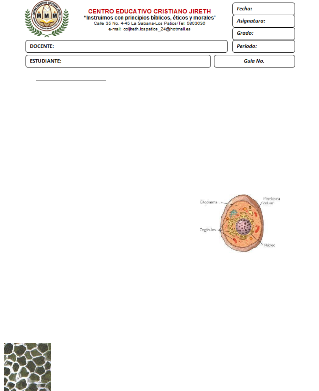 Tema: La célula y sus organelos Logros: Comprender la estructura de la célula y las funciones básicas de sus componentes. Relacionar la diferenciación celular corno un proceso de formación de tejidos en los seres vivos. Indicadores de desempeño Conoce los primeros postulados de la teoría celular. Diferencia una célula eucariota de una célula procariota. Compara células procariotas con células eucariotas. Compara células vegetales con células animales. Identifica las tres partes básicas de una célula eucariota. Comprende y explica la función que realiza cada uno de los organelos celulares. Compara organelos celulares de acuerdo con la función que realiza. Compara los procesos de transporte celular y determina las diferencias que se presentan entre estos. Participa activa y responsablemente en las actividades asignadas por el docente. Ejes temáticos ¿Cómo son las células? Funcionamiento celular. Niveles de organización de los seres vivos. Copio en mi cuaderno La célula La célula es la unidad de vida más pequeña de tu cuerpo y de cualquier organismo. En ella se llevan a cabo funciones de nutrición, respiración, circulación. Excreción y reproducción. Teoría celular El conocimiento humano de la naturaleza celular de la vida fue lento. En 1965, un científico e inventor llamado Robert Hooke informó de algunas observaciones con un microscopio primitivo. Coloco en su instrumento un “pedazo de corcho muy delgado” y vio una gran cantidad de celdillas. Hooke llamó a estas celdillas “células” porque le recordaban las pequeñas habitaciones o celdas ocupadas por los monjes. El corcho proviene de la corteza externa seca del albaricoque. Hooke escribió que en este árbol vivo y en otras plantas, dichas celdillas están llenas de jugos. Después de esto, pasaron 150 años para lograr unificar conceptos de biólogos como Theodor Schwann, Mattias Schleiden y Rudolf Virchow. De su investigación surgió la teoría celular, la cual plantea: Todos los organismos vivos están formados por una o más células. Las reacciones químicas para producir sustancias y energía del organismo vivo ocurren en la célula. Las células se originan de otras células. Las células contienen información hereditaria que pasa de una generación de organismos a otra. Clases de células Las células han evolucionado a través del tiempo. De acuerdo con su grado de desarrollo y organización se clasifican en células procariotas y eucariotas. Células procariotas: son aquellas que tienen citoplasma y una membrana exterior, carecen de un núcleo organizado. Son células procariotas las bacterias y las algas verde-azules. Células eucariotas: son las que presentan un mayor grado de desarrollo. Tienen la estructura más compleja que las procariotas. Normalmente son más grandes y constan de Una membrana, envoltura que separa una célula de otras y del medio ambiente. Un líquido espeso, a veces transparente, a veces turbio: es el citoplasma. Una porción más oscura y de tamaño reducido que es el núcleo. Las células animales, plantas, hongos y protistos pertenecen a esta clase. Las células eucariotas pueden ser: Células vegetales Células animales Son autótrofas: fabrican su propio alimento Son heterótrofas: consumen su alimento del medio. Poseen cloroplastos No poseen cloroplastos Poseen paredes celulares No poseen paredes celulares Son rígidas Son flexibles. Algunos organismos con células eucariotas pueden fabricar su alimento, es decir son autótrofos (células vegetales). Otros necesitan tomar su alimento del entorno, es decir, son heterótrofos (células animales). Formas y tamaños celulares: Imagina algunas células de tu cuerpo y dibújalas. Lee y realiza un resumen con tus palabras. En nuestro planeta hay una gran diversidad de organismos. También si pensamos en que estamos formados por tejidos y órganos constituidos por células de diferentes tamaños y formas. De esta manera, podemos decir, que a nivel celular existe gran diversidad. Las células varían en tamaño y forma. La mayoría de las células miden de 10 a 30 micras. Una micra (u) equivale a la milésima parte de un milímetro. Como las células no pueden almacenar oxígeno. Sólo tienen energía para unos dos o tres minutos y luego, si no les llega oxígeno para liberar más energía, mueren. El oxígeno, el azúcar y los demás componentes que requiere la célula se mueven rápidamente en volúmenes pequeños de agua, pero de manera lenta en volúmenes grandes. Por esto, el oxígeno y los demás componentes deben difundirse rápidamente; esto sería demorado si la célula tuviera grandes tamaños. Copio la siguiente tabla en mi cuaderno. Células Función Espermatozoides Son células masculinas que participan en los procesos de reproducción sexual. Su tamaño es pequeño y poseen un flagelo que les facilita movilizarse en medios líquidos. Células nerviosas Son las células más largas del cuerpo, ellas deben transmitir impulsos nerviosos a través de todo el organismo. Gracias a ellas, podemos percibir los estímulos de calor, frio o dolor. Glóbulos rojos o eritrocitos Son células presentes en la sangre. Poseen forma de disco y llevan en su interior una molécula llamada hemoglobina, la cual da el color rojo a la sangre y permite que la célula transporte oxigeno hacia otras células del organismo. TALLER 1. Del siguiente listado, identifica que está conformado por células. Escribe una x en la casilla correspondiente. Nombre Sí No Nombre Si No Coral Lechuga Moho de pan Tiburón Roca Arena Huesos Huevo Arcilla Pulmón Corcho Hielo Carbón Araña Trigo Cemento Los seres vivos están constituidos por diferentes clases de células. ¿esto es una ventaja o una desventaja? Intenta dar una explicación de lo anterior. Entre las células procarióticas y eucarióticas , ¿cuáles son las más desarrolladas? Explica tu respuesta. 2. Relaciona los términos del cuadro y realiza las actividades: 1. Célula 2.