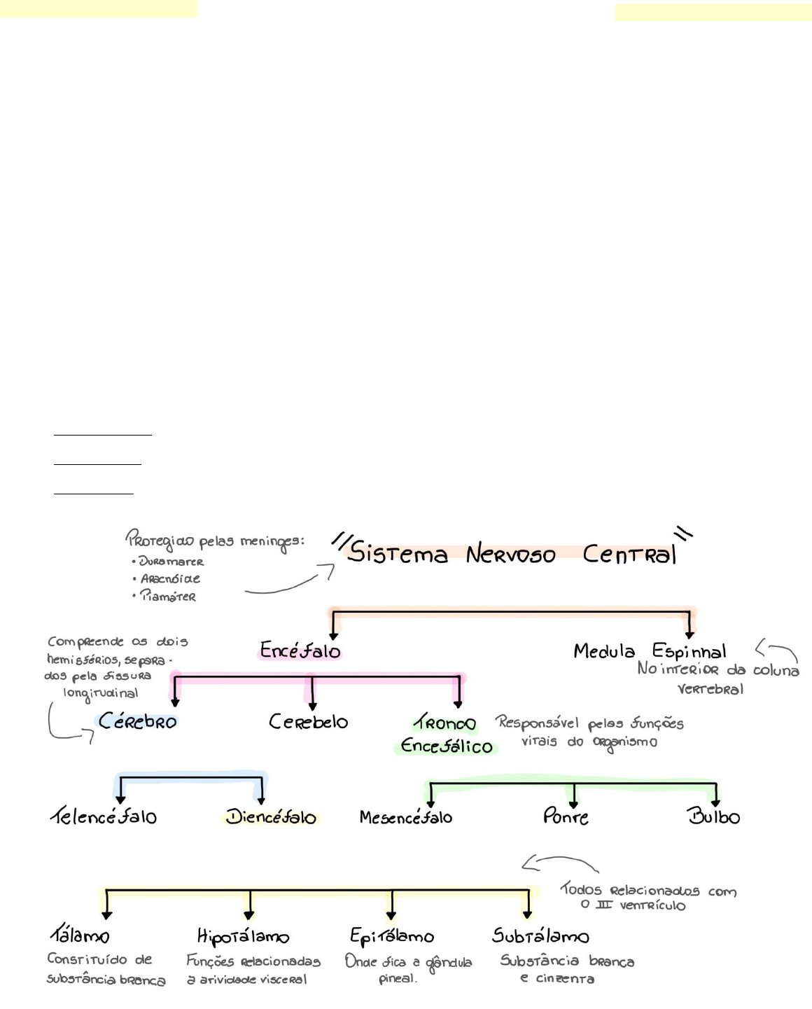 Luciana Supino – 1º Semestre – Neurologia e Neurociências Neurologia e Neurociências Sistema Nervoso Central Líquor ou Liquido Cefalorraquidiano ● Protege o sistema nervoso central ● Circula no espaço subaracnóide e nos ventrículos ● Plexos coroides, dentro do tronco encefálico, onde é produzido a maior parte do LCR. Ventrículos Encefálicos ● Cavidades que se comunicam entre si, onde circula o liquido cefalorraquidiano Meninges Encéfalo e medula espinhal são envolvidos e protegidos por laminas (ou membranas) chamadas: ● Dura-máter ➝ mais espessa, mais próxima ao crânio ● Aracnoide ➝ espaço subaracnóide onde circula o liquido cérebro espinhal (líquor) ● Pia-máter ➝ mais fina, mais próxima do encéfalo Luciana Supino – 1º Semestre – Neurologia e Neurociências Funções do Tálamo: - Transmite e interpresa - Sensibilidade e Motricidade - Ativação do Córtex - Desempenha algum papel no mecanismo de vigília ou estado de alerta ● Capta os estímulos através das vias aferentes – sensitivas (Periferia – SNC) ● Executa através das vias eferentes – motoras (SNC – Periferia) ● Crista Neural da origem ao Sistema Nervoso Periférico ● Tubo Neural da origem ao Sistema Nervoso Central Sistema Nervoso Periférico Constituído por nervos (cranianos e espinhais), gânglios nervosos e terminações nervosas. Sua função é conectar o SNC com as outras partes do corpo Possui 31 pares de nervos: ● Nervos superficiais (sensitivos – órgãos do sentido) ● Nervos profundos (motores – olhos, língua e músculos) ● Nervos mistos (sensitivos e motores) Nervos Responsáveis pela união do SNC a outros órgãos periféricos e pela transmissão de impulsos nervosos. ● Nervos espinhais 31 pares ➝ fazem conexão com a medula espinhal ● Nervos cranianos 12 pares ➝ fazem conexão com encéfalo ● Nervos aferentes (vias ascendentes) ➝ sensitivos enviam sinais da periferia para SNC ● Nervos eferentes (vias descendentes) ➝ motores enviam sinais do SNC para músculos ou glândulas ● Nervos mistos ➝ formado por fibras sensoriais e fibras motoras. Exemplo: nervos raquidianos Luciana Supino – 1º Semestre – Neurologia e Neurociências Divisão Funcional: Sistema Nervoso Somático (fora / voluntário) Aquele que relaciona o organismo com o meio. Recebe informações do meio externo (tato, olfato, paladar, etc.) Sistema Nervoso Autônomo ou sistema Nervoso Visceral (dentro / involuntário), recebe informações relacionadas ao funcionamento do organismo (movimentos intestinais, respiratórios, etc.) dividido em: ● SNA Simpático ➝ reação em situação de “luta ou fuga”, estresse ● SNA Parassimpático ➝ responsável pela restauração ou manutenção das funções orgânicas. Situação de repouso. Sensação Receptores periféricos Percepção Primeiro segundo córtices sensoriais. Interpretação Áreas de proces- sament sensorial de nível superior nos lobos parietal, occipital e temporal Conceitualização Córtex pré-frontal e outras áreas de associação de nível superior Lobos: ● Frontal ➝emoções e tomada de decisões ● Temporal ➝ audição e linguagem falada ● Parietal ➝ espaço e orientação ● Occipital ➝ visão ● Ínsula ➝ funções vitais Luciana Supino – 1º Semestre – Neurologia e Neurociências ● Substância Cinza ➝ muito corpo celular, muito processamento ● Substância Branca ➝ muito axônio, transmite informação ● Corpo caloso ➝ faz a ligação entre os dois hemisférios (“bananinha”) ● Sulcos ➝ “fissuras” (depressões) ● Giros ➝ “gordinhos” (dilatações) Divisões do córtex: ● Córtex primário ➝ área relacionada diretamente com a motricidade e sensibilidade ● Córtex secundário ➝ áreas de associação ● Córtex terciário ➝ envolvidas na integração da informação, elaboração de estratégias comportamentais. Sensações através dos receptores sensoriais ● Dor neuropática ➝ lesão do SN ● Dor nociceptiva ➝ dor de alerta, aviso Neurônio Luciana Supino – 1º Semestre – Neurologia e Neurociências Motricidade ● Movimento voluntário ➝ conscientes, provocados pela nossa vontade. Origem córtex cerebral ● Movimento involuntário ➝ inconscientes, independente da nossa vontade. Origem subcortical. Três tipos: reflexos, reações reflexas e movimentos automáticos ● Planejador ➝ córtex (hemisfério direito e esquerdo) ● Ordenador ➝ medula - Vias piramidais (descendentes) ➝ responsável pela execução do movimento voluntário - Vias extrapiramidais ➝ coordenação e controle dos movimentos involuntários (movimentos mais específicos) ● Efetuador ➝ músculos ● Controlador ➝ cerebelo ↳ - Controle do tônus muscular - Controle dos movimentos involuntários - Manutenção postura e equilíbrio - Integração do processo de motricidade ● Automatização ➝ núcleos da base (dentro do sistema límbico) ● Tradução ➝ passagem do sinal elétrico de um neurônio para outro ● Transdução ➝ conversão do estímulo em outro tipo