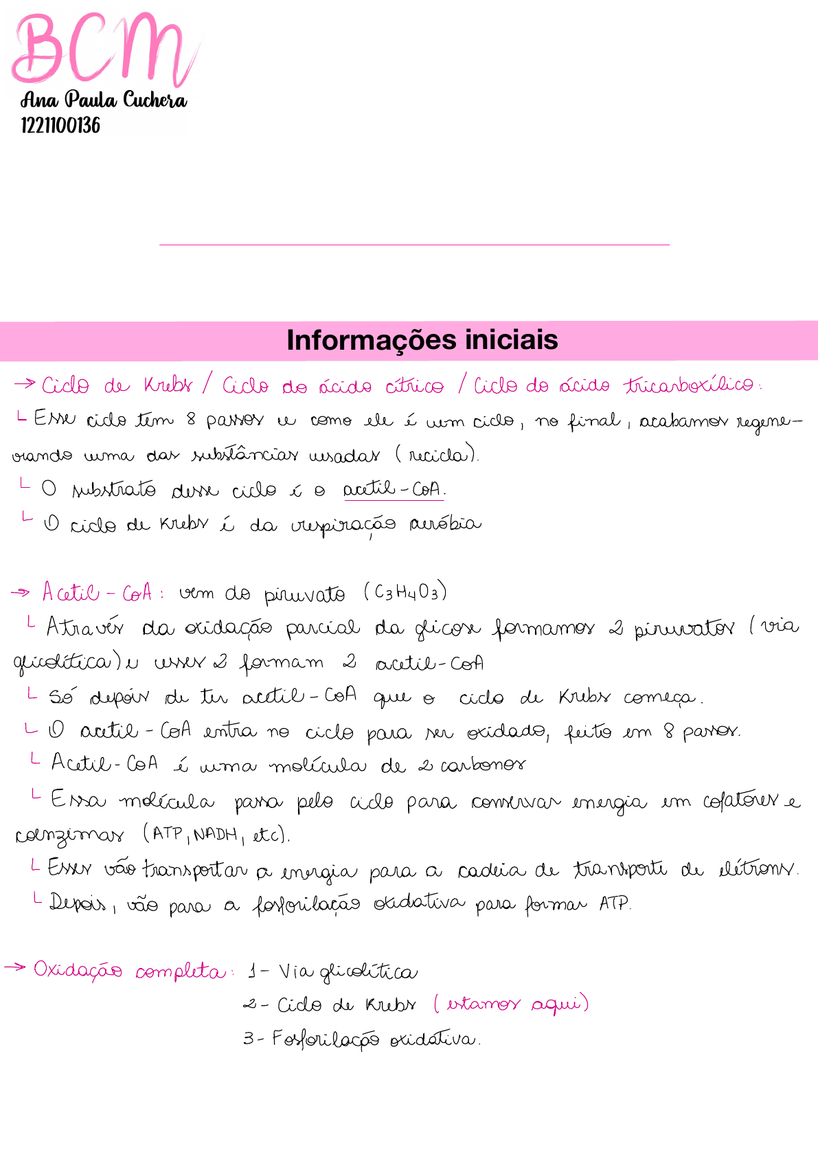 29/09/2021 Ciclo do ácido cítrico (Ciclo de Krebs) Professora Micheli Informações iniciais Ciclo de Krebs / ciclo do ácido cítrico / ciclo do ácido tricarboxílico : Esse ciclo tem 8 passar a como ele é um ciclo , no final , acabamos regenerando uma das substâncias usadas ( recicla) . substrato desse ciclo é o acetil - COA . L O ciclo de Krebs é da respiração aeróbia → Acetil - Colt : vem do piruvato ( C3H403) L Através da oxidação parcial da glicose formamos 2 piruvato ( via geicdítica ) e user 2 formam 2 acetil - cara L só depois de ter acetil - COA que o ciclo de ibs começa . L O acetil - loA entra no ciclo para ser oxidado , feito em 8 passar. L Acetil - lo A é uma molécula de 2o carbonos L Essa molécula passa pelo ciclo para conservar energia em cofatovr e colnzimasr ( ATP , NADH , etc) . L Esses vão transportar a energia para a cadeia de transporte de elétrons . L Depois , vão para a fosforilação oudativo para formar ATP . → Oxidação completa : I - Via glicdítica 2- Ciclo de Krebs ( estamos aqui) 3- Fosforilação oudativo . → ciclo de Krebs - Ele não formou muitos ATPN , mas ele é necessário para que ocorra a fosforilação oúdativa . L Ele fornece energia , em forma de elétrons , para que o oxigênio produza os ATPN necessários para o nosso metabolismo . L Mas a produção dos ATPN em grande quantidade só ocorre depois do ciclo de Krebs . → Via qlicolítica e ciclo de Krebs - o ciclo é como se fosse acontinuaçãoda via glicdítica , pois ele usa um dos produtos final da via , o acetil- COA . → Acetil - loA - o piruvato é a principal substância para a produção da molécula de acetil - lo A . L Contudo , também podemos obter , em menor quantidade , de ácidos graxos , mas isso só ocorre em falta de glicose . L O acetil - loA pode ser usado também para a formação de algunsneurotransmissores . → Intermediários do ciclo de Krebs - são usados no ciclo , mas também podem ser usados para formar outras biomoléculas . L Exemplos : um deles é usado para fazer neurotransmissora , outro para a síntese do grupo H eme de hemácias, etc . → Regulação - o ciclo é regulado por 3 reações . L E antes , a transformação do piruvato a acetil - loA , também é uma forma de regulação . L Portanto no total será passado 4 reações que regulam o ciclo de Krebs . L É importante para regular a velocidade do ciclo . Recapitulando - Glicólise Regulação coordenada com todas as etapas L A necessidade de ATP coordena todo o processo . L Devido ao fato de todos os processou serem conectados , todas as etapas precisam ser reguladas de maneira coordenada L Velocidade e fluxo precisam ser iguais em todas as vias . → Deficiência de enzimas no ciclo de Krebs - são patologias bem raras 1. Via geicdílica 2. ciclo de Krebs 3. FosforilaçãoKrebs didativo * { * Piruvato - anaeróbiose - virou lactato aeróbiose - virou acetil- loA ( 2 Piruvato = 2 acetil - COA) Obs? Na olídação completa o número de ATPor produzidos depende da demanda . → Via gliedíticou - a glicose é captada pela GLU-12 e alidada para ser usada como substrato energético . L No final ela precisa gerar 2 piruvato para serem usados no ciclo de Krebs . L Ela gera também 2 ATPN , energia , e 2 NADH que servem comotransportadores de elétrons que levam energia para outros processos . Mapa metabólico → 2 piruvato - serão convertidos em acetil- coa . Obs& Para cada glicose será preciso dar 2 voltas no acto de Krebs , pois tem 2 piruvato que fazem 2 acetil - COA . → Descarboxilação - ao longo do ciclo vão existir diversas desaarbotilaçãs , ou seja , a retirada de uma carboxílico C- OOH) L A partir da descarbcoúlação gera CO2 → Os 2 processos acima serão vistos na aula. glicólisegliconeogênese } Acetil-COA } ciclo de Krebs Condições anaeróbicas Condições aeróbicas → Anaeróbias - piruvato vira lactato . L Lactato entrou no ciclo de Cori ( geieoneogênese) e volta a ser glicose . > Cdnzima A - é uma estrutura grande que tem um grupo acetiea na ponta 1 . O piruvato precisará ser transportado para dentro da mitocôndria . 2 . Na matriz mitocondrial o piruvato encontrará o complexo da piruvato desidrogenase , que vai catalizar a sua descarboúlação . 3. A dexarbouilação será feita através da retirada de um grupo aarboúla , e esse grupo carboteba dará origem ao CO2 . 4 . O piruvato terá também a inserção de grupamento chamado Coenzima A , para assim ser transformado em acetil - loA Fontes de Acetil-Coa Piruvato a Acetil-CoA: entrada na mitocôndria Obs ? O ciclo de Krebs acontece na mitocôndria , então o acetil- loA não sai de lá . → Fonte de acetil - COA - vemnormalmente da glicose ( dieta - é a prioridade) . L Também pode vir de ácidos gratos , aminoácidos e corpos cetônicos , mas estes são usados em condições específicas da células . Acetil - COA - também é utilizado em outras rotas biomiméticax → Mitocôndria - tem membra interna e uterina L O piruvato precisa passar essas duas membranas para poder acessar a matriz mitocondrial Descarboxilação do piruvato a Acetil-CoA → Caminho do piruvato : 1- Entra na mitocôndria através de poemas ( proteínas) por difusão e ele ficou no espaço entre membranas , espaço intermembranas . 2- A piruvato tranlocase ( carreada mitocondrial de piruvato) é uma proteína que leva o piruvato até a matriz mitocondrial . Obs ! Se o piruvato não entrar , ele não consegue descartoular e nem fazer o ciclo de Krebs , pois ambos ocorrem na mitocôndria . doca enxofre ao grupo carbóilou , resultado → Assim que o piruvato chega na matriz ocorre a primeira reação : Piruvato Acetil - loA 3C 2C → completo piruvato dlsidrogenase - responsável pela descarboúlação do piruvato e acréscimo da coenzimao A . L Acetil - COA tem uma ligação de alta energia , devido ao enxofre ( grupo troll e ele que dá energia ao ciclo de Krebs . L Quando descartada o piruvato , retirou um 