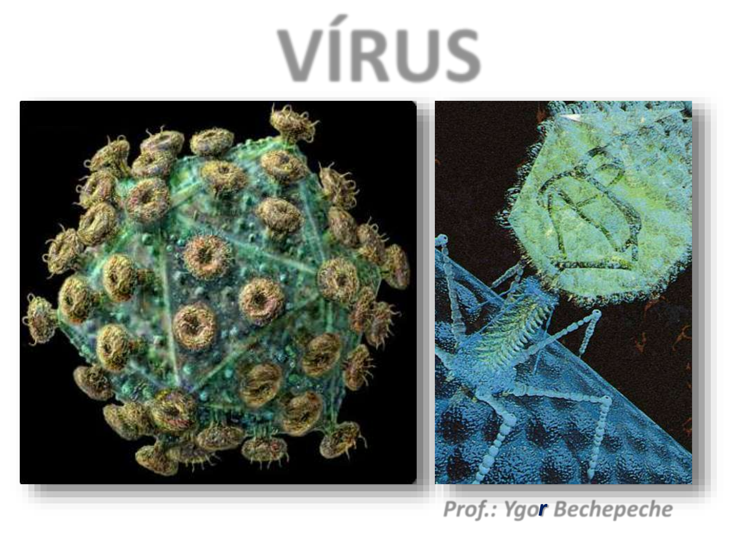 VÍRUS Prof.: Ygor Bechepeche VÍRUS Não possuem metabolismo próprio = Parasitas Intracelulares Obrigatórios Não estão classificados em nenhum dos 5 reinos; São de 10 a 100 vezes menores que as bactérias; Para alguns autores: Não são considerados seres vivos; • são acelulares, • não possuem metabolismo próprio, • parasitos obrigatórios. Para outros: São seres vivos; • Autoreprodução (embora dentro de outra célula), • Mutabilidade, • Adaptação através de mutações. Estrutura dos Vírus NUCLEOCAPSÍDEO = capsídeo + ácido nucléico (DNA ou RNA). CAPSÍDEO: cápsula de proteína que envolve o material genético. (proteínas formam capsômeros) capsídeo DNA ou RNA (material genético), dependendo do tipo de vírus. OBS: Não possuem membrana plasmática, citoplasma e nem organelas. (não possuem metabolismo próprio). RNA Alguns vírus possuem um envoltório (lipoprotéico) ou envelope externo ao nucleocapsídeo VÍRUS ENVELOPADOS ou CAPSULADOS. • Existem vírus específicos para bactérias, fungos, protozoários, algas, plantas e animais Reprodução BACTERIÓFAGOS: São vírus que atacam bactérias. Podem apresentar dois ciclos de vida: Ciclo Lítico e Ciclo Lisogênico Ciclo Lisogênico: o DNA do vírus associa-se ao da Bactéria e pode permanecer assim por um longo período de tempo e sem interferir no metabolismo da bactéria. Sofrendo alguma ação externa, tais como, raio X, radiações ou agentes químicos, pode realizar o ciclo lítico. C ic lo L is o g ê n ic o Ciclo Lítico Ciclo Lítico: o bacteriófago encosta na superfície da bactéria e injeta seu DNA, deixando a cápsula do lado de fora. O DNA viral se multiplica e comanda a síntese de RNA que por sua vez comanda a síntese de proteínas que formarão o capsídeo. 3 2 5 4 1 RNA RNA Síntese protéica • Ciclo reprodutivo de um vírus de RNA (vírus da gripe) • Ciclo reprodutivo de um Retrovírus (HIV) • O HIV liga-se à membrana da célula por meio da proteína gp120 que encaixa-se na proteína CD4 (linfócito T4 ou T auxiliares). • Após o encaixe, a cápsula do vírus se funde à membrana da célula e o material genético penetra no citoplasma. • O vírus possui a enzima transcriptase reversa, que a partir do RNA forma uma molécula de DNA (retrovírus) que produz sua parte complementar. Se unem e migram para o núcleo onde incorporam-se ao material genético da célula hospedeira. • DNA desencadeia a formação de moléculas de RNA que comandarão a síntese de proteínas, estas formarão novos vírus que sairão do linfócito T4. • Ocorre a destruição dos linfócitos comprometendo o sistema imunitário. RNA DNA RNA Síntese protéica Vírus de DNA: DNA RNA PROTEÍNAS Retrovírus: RNA DNA RNA PROTEÍNAS Classificação • Tipo de ácido nucléico: Vírus DNA (ADN) e vírus RNA (ARN). • Os vírus DNA dividem-se em seis famílias: poxvírus (que inclui o agente causador da varíola), adenovírus, herpesvírus, iridovírus, papovavírus (papilomavírus, que causam as verrugas genitais, carcinomas de pele, de vulva e de pênis). • Os vírus RNA classificam-se nas famílias picornavírus (resfriados, poliomielite e hepatite A), calicivírus, togavírus (rubéola), flavivírus (dengue e febre amarela), coronavírus (pneumonia), ortomixovírus (gripe), paramixovírus (sarampo e caxumba), rabdovírus (raiva), arenavírus (febre hemorrágica), buniavírus, retrovírus (AIDS, leucemia e câncer de pele) e reovírus. Os arbovírus não chegam a constituir uma família, agrupam-se nessa classificação todos os vírus transmitidos por artrópodes, principalmente mosquitos. Como exemplos de arbovírus citam-se os vírus transmissores da dengue, da febre amarela e da encefalite equina. - Adenovírus: (tipo DNA), a transmissão do mesmo ocorre por contato direto(transmissão fecal-oral), sendo que o mesmo ainda pode ser transmitido através da água, porém neste último caso com menos frequência. Causa doenças no sistema respiratório, gastrenterite, conjuntivite entre outras. - Retrovírus: (tipo RNA), o vírus HIV da AIDS é um vírus do tipo retrovírus, cuja transmissão pode acontecer através do contato sexual(doença sexualmente transmissível), pelo sangue(transfusões ou utilização de seringas contaminadas por exemplo). - Arbovírus: (tipo RNA), são vírus que tem como agente transmissor artrópodos, como por exemplo o mosquito do gênero Aedes que transmite o vírus da dengue e da febre amarela. - Coronavírus: (tipo RNA), são uma causa comum de constipação/resfriado. Podem ainda causar pneumonia, gastroenterite e SARS (pneumonia). - Rotavirus: (tipo RNA de dupla hélice), não possuem envelope e são extremamente resistentes. É umas das principais causas de diarréia grave em lactentes e crianças jovens, gastroenterite, etc. - Vírus com fita de RNA positiva (RNA+): Pode ser traduzido imediatamente mediante infecção da célula hospedeira. Ex: poliovirus, togavírus, flavivírus, retrovírus. - Vírus com fita de RNA negativa (RNA-): Precisa ser copiado no RNAm complementar de sentido positivo para que as proteínas possam ser feitas. Assim, além de precisar codificar para uma RNA- polimerase dependente de RNA. Ex: vírus da influenza (ortomixovírus), vírus do sarampo, vírus da caxumba (paramixovírus), vírus da raiva (rabdovírus) - Vírus de RNA de fita dupla: O RNA do virion (genômico) é de fita dupla e portanto não pode funcionar como RNAm; assim esses vírus também precisam empacotar uma RNA polimerase para fazer seus RNAm após infecção da célula hospedeira. Ex: rotavírus (pertencem à família dos reovírus). Tipos de RNA Doenças causadas por vírus AIDS : HIV (human immunodeficiency virus) – retrovírus • sangue • sêmen • secreção vaginal • leite materno • líquido amniótico Se reproduz dentro do Linfócito T4 , comprometendo o sistema imunológico do corpo. • Infecção Aguda: • infecção pelo vírus (sistema imu