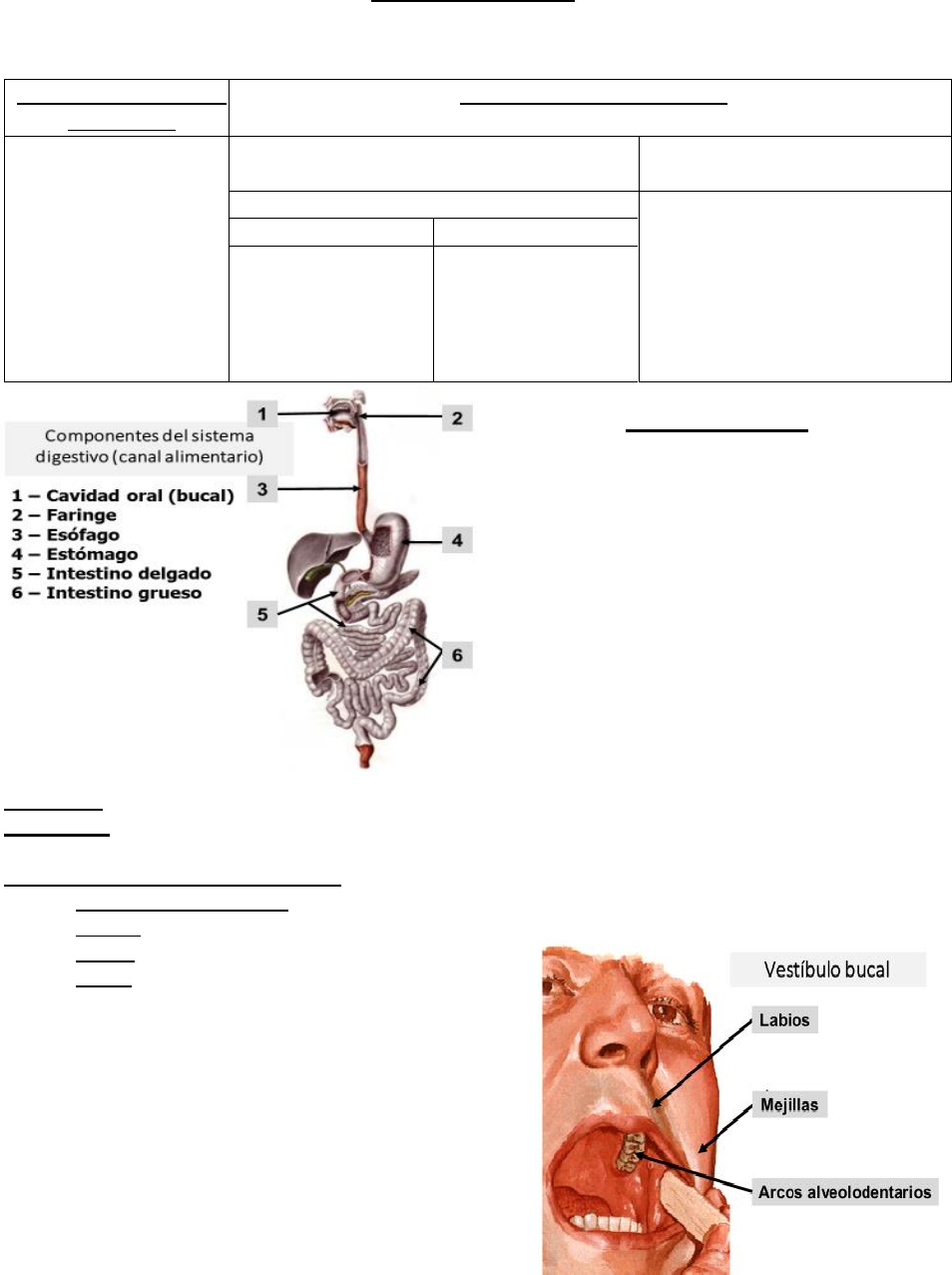 01- SISTEMA DIGESTIVO RANDY MEJÍAS GONZÁLEZ Página 1 de 22 Sistema digestivo Conjunto de órganos que intervienen en la función de digestión que consiste en la transformación mecánica y química de los alimentos en sustancias asimilables por el organismo. CAVIDAD BUCAL Primer segmento del canal alimentario donde se encuentran los dientes y la lengua en que comienza la digestión que tiene como funciones principales la masticación, insalivación y deglución, aunque también actúa como vía respiratoria auxiliar y dispositivo auxiliar de la fonación. En la boca también encontramos estructuras como: los labios, las encías, los carrillos o mejillas, el paladar, los dientes, la lengua, las glándulas salivales y las amígdalas palatina y lingual Situación: En el viscerocráneo, en la parte inferior y medio de la cara Porciones: Vestíbulo y la Cavidad Bucal Relaciones de la Cavidad Bucal: 1. Delante y a cada lado: Arcos Alveolodentarios 2. Detrás: Faringe a través del istmo de las fauces 3. Arriba: Velo del paladar 4. Abajo: raíz de la lengua. Vestíbulo bucal: Hendidura en forma de herradura entre labios y mejillas (por delante y a cada lado) y arcos alveolodentarios (por detrás y parte medial). En el vestíbulo también se hallan los frenillos del labio superior e inferior y orificios donde desembocan los conductos de la parótida y las glándulas salivales menores. Labios y carrillos (mejillas) Los labios cierran la entrada a la cavidad bucal por aposición del labio superior con el inferior. La estructura interna está constituida por fibras musculares estriadas esqueléticas del músculo orbicular de los labios. Tubo Digestivo o Canal Alimentario Glándulas Anexas (Exocrinas) -Cavidad Oral -Faringe -Esófago -Estomago -Intestino Delgado -Intestino Grueso En relación con la boca (Situadas en la cara) Situadas en la Cavidad Abdominal Glándulas Salivales -Páncreas -Hígado Mayores Menores -Parótida -Sublingual -Submandibular -Bucales -Linguales -Palatinas -Labiales -Molares 01- SISTEMA DIGESTIVO RANDY MEJÍAS GONZÁLEZ Página 2 de 22 Los carrillos están revestidos por una mucosa y por fuera por piel fina y entre ellas se halla una capa de músculo estriado esquelético (buccinador) Cavidad bucal propiamente dicha Está limitada por delante y a cada lado por los arcos alveolodentarios, por detrás comunica con la faringe a través del istmo de las fauces, a su vez está limitado a los lados por los papilares palatoglosos, arriba por el velo del paladar y abajo por la raíz de la lengua. Techo de la cavidad bucal: Está compuesto por el paladar duro u óseo, formado por láminas horizontales de los huesos palatinos y los procesos palatinos de los huesos maxilares, más la mucosa que la recubre y por el paladar blando. El paladar blando presenta una porción horizontal unida al paladar duro y otra oblicua llamada velo del paladar. 1. A cada lado se continua en 4 pliegues, 2 a cada lado: los anteriores (arcos palatogloso) y los posteriores (arcos palatofaríngeos). 2. Entre estos pliegues queda delimitada la fosa tonsilar, sitio donde se encuentra la tonsila o amígdala palatina. 3. El borde posterior libre del paladar blando presenta en su parte media la úvula. 4. El paladar blando está constituido por varios músculos:  los músculos palatoglosos van del paladar a la lengua, forman los pilares o pliegues palatoglosos y su acción es descender el paladar y estrechar el istmo de las fauces.  Los músculos palatofaríngeos se dirigen del paladar a la faringe, originan los pliegues palatofaríngeos y presentan las mismas funciones que el anterior, además elevan la faringe.  El músculo de la úvula solo existe en el hombre y su función es acortar la úvula.  Los músculos tensores del velo del paladar se inician en el esfenoides y en la tuba auditiva y van hacia el paladar blando, y su función es tensar el velo del paladar en sentido horizontal  Los músculos elevadores del velo del paladar recorren la porción petrosa del temporal al paladar blando y elevan este último con lo que cierran la comunicación con la nasofaringe.  El piso de la cavidad oral está constituido por los músculos milohioideos, reforzados por los genihioideos en su parte media. 01- SISTEMA DIGESTIVO RANDY MEJÍAS GONZÁLEZ Página 3 de 22 Arcadas Alveolodentarias: forman la pared anterior y las laterales de la cavidad bucal, está constituidas por alveolos de los huesos maxilar y mandibular, así como los dientes se encuentran en dichos alveolos. Existe una arcada superior formada por el maxilar y otra inferior formada por la mandíbula. DIENTES Son papilas de mucosa osificada, destinadas al procesamiento mecánico desde los 2 años. Dentición decidual: Formula dentaria (2.1.2) Dentición permanente: Formula dentaria (2.1.2.3) lo que suman 32 dientes (8 incisivos, 4 caninos, 8 premolares, 12 molares) Las partes de un diente son la corona, el cuello y la raíz. La corona sobresale de la encía, el cuello lo abarca la encía y la raíz está incluida dentro del alveolo. En el interior de la corona está la pulpa dentaria, y en el interior de la raíz está el canal de la raíz del diente, ocupado por vasos sanguíneos y nervios. La sustancia dura del diente se compone de: dentina, esmalte y cemento.  El esmalte cubre la corona, es la sustancia más dura que existe en el organismo  La dentina es la masa principal del diente, que rodea la cavidad de est3  El cemento que cubre la raíz. Cada diente presenta 5 caras:  La vestibular  La lingual o palatina  Las contactantes  La masticatoria (es la que contacta con los dientes localizados en la otra arcada dentaria) LENGUA: ֍ Es un órgano muscular de gran movilidad ֍ Se estructura presenta un núcleo central de músculo estriado esquelético dispuesto en 3 planos principalmente, recubierto por una membrana mucosa ֍ Interviene en el gusto, la fonación, la deglución y la masticación. ֍ Porciones: el ápice, el cuerpo y la raíz  El ápice dirigi
