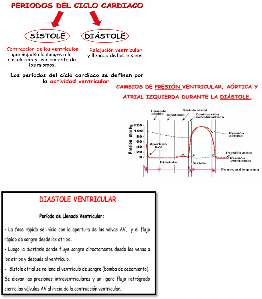 01- CICLO CARDIACO & ACTIVIDAD ELÉCTRICA DEL CORAZÓN RANDY MEJÍAS GONZÁLEZ Página 1 de 17 CICLO CARDÍACO: -Se define como los eventos (eléctricos, mecánicos, los cambios de presión y volumen que tienen lugar en las cavidades cardiacas) que ocurren desde el inicio de una contracción cardiaca hasta el inicio de la siguiente. Cada ciclo se inicia con la generación espontánea de un PA en el nodo SA, el cual se propaga por los atrios y posteriormente por los ventrículos. A los cambios eléctricos se suceden cambios mecánicos, de presión y volumen en los atrios y ventrículos. SISTOLE - Contracción isovolumétrica. - Expulsión o eyección ventricular. DIÁSTOLE -Relajación isovolumétrica. -Llenado rápido -Llenado lento o diastasis. -Contracción atrial. Cambios de presión en los atrios Onda a: producida por la contracción atrial. Onda c: producida por el flujo retrógrado de sangre desde los ventrículos a los atrios al inicio de la contracción ventricular. Onda v: Producida por el flujo lento de sangre desde las venas a los atrios al final de la contracción ventricular. Función de los ventrículos como bombas. Llenado de los ventrículos: Durante la sístole ventricular se acumulan grandes cantidades de sangre en las aurículas derecha e izquierda porque las válvulas AV están cerradas. Por tanto, tan pronto como ha finalizado la sístole y las presiones ventriculares disminuyen de nuevo a sus valores diastólicos bajos. el aumento moderado de presión que se ha generado en las aurículas durante la sístole ventricular inmediatamente abre las válvulas AV y permite que la sangre fluya rápidamente hacia los ventrículos. Esto se denomina período de llenado rápido de los ventrículos. El período de llenado rápido dura aproximadamente el primer tercio de la diástole. Durante el tercio medio de la diástole normalmente sólo Ruye una pequeña cantidad de sangre hacia los ventrículos: ésta es la sangre que continúa drenando hacia las aurículas desde las venas y que pasa a través de las aurículas directamente hacia los ventrículos. Durante el último tercio de la diástole las aurículas se contraen y aportan un impulso adicional al flujo de entrada de sangre hacia los ventrículos; este fenómeno es responsable de aproximadamente el 20% del llenado de los ventrículos durante cada ciclo cardíaco. 01- CICLO CARDIACO & ACTIVIDAD ELÉCTRICA DEL CORAZÓN RANDY MEJÍAS GONZÁLEZ Página 2 de 17 Vaciado de los ventrículos durante la sístole Periodo de contracción Isovolúmica (Isométrica): Inmediatamente después del comienzo de la contracción ventricular se produce un aumento súbito de presión ventricular, que hace que se cierren las válvulas AY. Después son necesarios otros 0,02 a 0,03 segundos para que el ventrículo acumule una presión suficiente para abrir las válvulas AV semilunares (aórtica y pulmonar) contra las presiones de la aorta y de la arteria pulmonar. Por tanto, durante este período se produce contracción en los ventrículos, pero no vaciado. Esto se denomina período de contracción Isovolúmica o isométrica, lo que quiere decir que se produce aumento de la tensión en el músculo, pero con un acortamiento escaso o nulo de las fibras musculares. Período de eyección: Cuando la presión ventricular izquierda aumenta ligeramente por encima de 80 mm Hg (y la presión ventricular derecha ligeramente por encima de 8 mm Hg), las presiones ventriculares abren las válvulas semilunares. Inmediatamente comienza a salir la sangre de los ventrículos, de modo que aproximadamente el 70% del vaciado de la sangre se produce durante el primer tercio del período de eyección y el 30% restante del vaciado durante los dos tercios siguientes. Por tanto, el primer tercio se denomina período de eyección rápida y los dos tercios finales periodo de eyección lenta. Período de relajación isovolúmica (isométrica): Al final de la sístole comienza súbitamente la relajación ventricular lo que permite que las presiones intraventriculares derecha e izquierda disminuyan rápidamente. Las presiones elevadas de las grandes arterias distendidas que se acaban de llenar con la sangre que procede de los ventrículos que se han contraído empujan inmediatamente la sangre de nuevo hacia los ventrículos, 10 que cierra súbitamente las válvulas aórtica y pulmonar. Durante otros 0,03 a 0,06 segundos el músculo cardíaco sigue relajándose aun cuando no se modifica el volumen ventricular, dando lugar al período de relajación isovolúmica o isométrica. Durante este período las presiones intraventriculares disminuyen rápidamente y regresan a sus bajos valores diastólicos. Después se abren las válvulas AV para comenzar un nuevo ciclo de bombeo ventricular. El VDF determina la longitud de las fibras antes de la contracción llamado Precarga VDF- VSF= Volumen sistólico (VS) VS x Frecuencia = Gasto cardíaco Postcarga: tensión parietal que soporta el ventrículo durante la eyección; es la carga que debe superar para bombear, determinada por la resistencia a la salida, en el lecho vascular como en la aorta. Precarga: La tensión que soporta la pared ventricular al final de la diástole, determinada por el volumen de llenado ventricular o volumen diastólico final (VDF). depende del volumen de sangre que retorna al corazón en la unidad de tiempo 01- CICLO CARDIACO & ACTIVIDAD ELÉCTRICA DEL CORAZÓN RANDY MEJÍAS GONZÁLEZ Página 3 de 17 Volúmenes Ventriculares -VDF (volumen diastólico final) = 120 ml -VS (Volumen sistólico) = 70 ml -VSF (volumen sistólico final) = 50 ml -FE (Fracción de eyección) > 60 % -La contractilidad, o estado contráctil del miocardio es la capacidad del músculo para contraerse y generar la presión que permite la apertura valvular y la salida de la sangre o eyección. Depende: La disponibilidad de iones calcio en el interior de las fibras musculares (modificada por el tono vago-simpático) El estado del músculo en cuanto