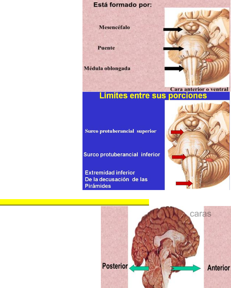 2-TRONCO ENCEFÁLICO, CONFIGURACÍON EXTERNA RANDY MEJÍAS GONZÁLEZ Página 1 de 10 El tronco encefálico está situado en la fosa craneal posterior, cefálicamente con relación a la médula espinal y por delante del cerebelo, en íntima relación con el clivus del hueso occipital En este se observan tres porciones: médula oblongada, puente y mesencéfalo. El límite entre la médula oblongada y el puente, lo constituye el surco bulbopontino o protuberancial inferior; y entre el puente y el mesencéfalo, el límite está dado por el surco pontopeduncular o protuberancial superior. El límite inferior y que lo separa de la médula espinal, es un plano que pasa por la extremidad inferior de la decusación de las pirámides, Por arriba clásicamente se acepta como límite un plano a nivel de las cintillas ópticas que lo separa del diencéfalo o también un plano por encima de los colículos superiores. CONFIGURACIÓN EXTERNA DEL TRONCO ENCEFÁLICO: Los detalles anatómicos de la configuración externa del tronco encefálico son de importancia extraordinaria, ya que muchos de ellos no son más que la manifestación externa de estructuras que se sitúan en su interior. El origen aparente se trata del lugar por donde emerge el nervio en la superficie de la sustancia nerviosa. Este no es realmente el sitio de origen del nervio. El origen real está en los núcleos motores asociados a nervios craneales, para el caso de los nervios con componente (fibras) motor, o en los ganglios craneales para aquellos con componentes (fibras) sensitivos. A pesar de este detalle diferencial en el origen real entre sensitivo y motor se puede decir que, por convenio, se toma el origen real de un nervio craneal a nivel de sus núcleos. En su cara anterior se tiene, a nivel de la médula oblongada, la fisura mediana anterior. Esta se encuentra interrumpida por la decusación de las pirámides, detalle producido cuando las fibras del tracto corticoespinal de la vía piramidal cruzan la línea media caras 2-TRONCO ENCEFÁLICO, CONFIGURACÍON EXTERNA RANDY MEJÍAS GONZÁLEZ Página 2 de 10 Lateralmente están las pirámides y lateral a estas el surco anterolateral donde se observa el origen aparente del nervio hipogloso (XII nervio craneal). Se describe también la oliva y por detrás de esta el surco posterolateral con la emergencia de los nervios glosofaríngeo (IX nervio craneal), vago (X nervio craneal) y accesorio (XI nervio craneal) En el surco bulbopontino, a cada lado de la línea media, se observa la emergencia del nervio abductor (VI nervio craneal), y en la fosita lateral del propio surco en sentido lateral el VII nervio craneal o nervio facial y el VIII nervio craneal o nervio vestíbulococlear 2-TRONCO ENCEFÁLICO, CONFIGURACÍON EXTERNA RANDY MEJÍAS GONZÁLEZ Página 3 de 10 Inmediatamente por encima del surco bulbopontino se encuentra, en la cara anterior del puente, un rodete voluminoso formado por fibras transversales, convexo en sentido vertical y transversal, llamado rodetes piramidales. Esta cara presenta en la línea media un surco ancho denominado surco basilar, por corresponder al tronco basilar. Lateralmente la cara anterior de este segmento se encorva para continuarse con los pedúnculos cerebelares medios. En esta zona se produce la emergencia del V nervio craneal o trigémino, mediante una raíz gruesa sensitiva y otra motora más pequeña. A este nivel se puede trazar una línea imaginaria que vaya desde la emergencia del trigémino a la del facial, la cual sirve de límite lateral entre el puente y los pedúnculos cerebelares medios, denominada línea trigémino facial En el mesencéfalo se observan los pedúnculos cerebrales y entre ellos la fosa interpeduncular con la sustancia perforada posterior y el origen aparente del nervio oculomotor (III nervio craneal) en el borde medial del pedúnculo CARA POSTERIOR: Al observar la cara posterior del tronco encefálico llama la atención primeramente la presencia de una profunda depresión llamada fosa romboidea. La misma constituye el piso del cuarto ventrículo. El resto de la cara posterior está representada por dos segmentos: uno inferior a la fosa, correspondiente a la cara posterior de la médula oblongada y otro superior a la fosa correspondiente a la cara posterior del mesencéfalo o techo mesencefálico 2-TRONCO ENCEFÁLICO, CONFIGURACÍON EXTERNA RANDY MEJÍAS GONZÁLEZ Página 4 de 10 DETALLES ANATÓMICOS DE LA FOSA ROMBOIDEA: 1. Surco mediano. 2. Eminencia medial. 3. Colículo facial (formado por núcleo motor somático del VI nervio craneal (abductor) rodeado de fibras del núcleo motor del VII (facial). 4. Estrías medulares que separan los triángulos pontino y bulbar y se forman por fibras de la vía acústica pertenecientes a los núcleos cocleares. 5. Áreas vestibulares y cocleares (en los ángulos laterales). 6. Trígono del nervio vago 7. Trígono del nervio hipogloso 2-TRONCO ENCEFÁLICO, CONFIGURACÍON EXTERNA RANDY MEJÍAS GONZÁLEZ Página 5 de 10 DETALLES ANATÓMICOS DE LA MÉDULA OBLONGADA: En médula oblongada la morfología es muy parecida a la médula espinal con la que se continúa sin límite alguno. En la línea media presenta el surco mediano posterior, que termina hacia arriba en el óbex). Lateralmente están los surcos posterolaterales. Se describe también el funículo posterior dividido a este nivel por el surco intermedio posterior, en una porción medial o fascículo grácil y una porción lateral o fascículo cuneiforme los que presentan unos relieves denominados tubérculos grácil y cuneiforme y que corresponden con los núcleos homónimos. A partir del óbex y debido a la apertura del IV ventrículo los cordones posteriores se separan de la línea media y se hacen más redondos, por lo que se denominan cuerpos restiformes. Como macroscópicamente se les ve llegar al cerebelo, son conocidos también como pedúnculos cerebelares inferiores 2-TRONCO ENCEFÁLICO, CONFIGURACÍON EXTERNA RANDY MEJÍAS 