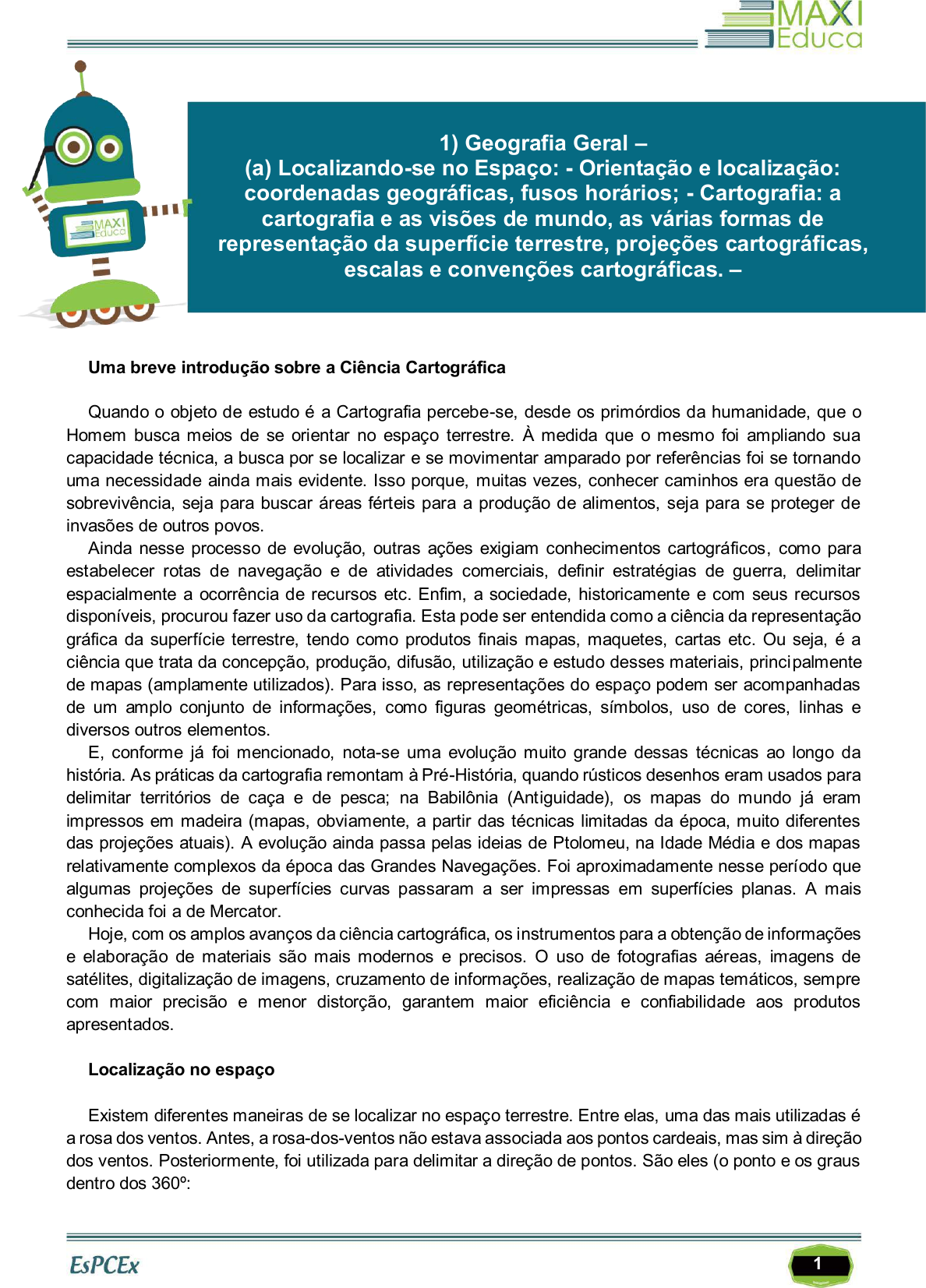 1 Uma breve introdução sobre a Ciência Cartográfica Quando o objeto de estudo é a Cartografia percebe-se, desde os primórdios da humanidade, que o Homem busca meios de se orientar no espaço terrestre. À medida que o mesmo foi ampliando sua capacidade técnica, a busca por se localizar e se movimentar amparado por referências foi se tornando uma necessidade ainda mais evidente. Isso porque, muitas vezes, conhecer caminhos era questão de sobrevivência, seja para buscar áreas férteis para a produção de alimentos, seja para se proteger de invasões de outros povos. Ainda nesse processo de evolução, outras ações exigiam conhecimentos cartográficos, como para estabelecer rotas de navegação e de atividades comerciais, definir estratégias de guerra, delimitar espacialmente a ocorrência de recursos etc. Enfim, a sociedade, historicamente e com seus recursos disponíveis, procurou fazer uso da cartografia. Esta pode ser entendida como a ciência da representação gráfica da superfície terrestre, tendo como produtos finais mapas, maquetes, cartas etc. Ou seja, é a ciência que trata da concepção, produção, difusão, utilização e estudo desses materiais, principalmente de mapas (amplamente utilizados). Para isso, as representações do espaço podem ser acompanhadas de um amplo conjunto de informações, como figuras geométricas, símbolos, uso de cores, linhas e diversos outros elementos. E, conforme já foi mencionado, nota-se uma evolução muito grande dessas técnicas ao longo da história. As práticas da cartografia remontam à Pré-História, quando rústicos desenhos eram usados para delimitar territórios de caça e de pesca; na Babilônia (Antiguidade), os mapas do mundo já eram impressos em madeira (mapas, obviamente, a partir das técnicas limitadas da época, muito diferentes das projeções atuais). A evolução ainda passa pelas ideias de Ptolomeu, na Idade Média e dos mapas relativamente complexos da época das Grandes Navegações. Foi aproximadamente nesse período que algumas projeções de superfícies curvas passaram a ser impressas em superfícies planas. A mais conhecida foi a de Mercator. Hoje, com os amplos avanços da ciência cartográfica, os instrumentos para a obtenção de informações e elaboração de materiais são mais modernos e precisos. O uso de fotografias aéreas, imagens de satélites, digitalização de imagens, cruzamento de informações, realização de mapas temáticos, sempre com maior precisão e menor distorção, garantem maior eficiência e confiabilidade aos produtos apresentados. Localização no espaço Existem diferentes maneiras de se localizar no espaço terrestre. Entre elas, uma das mais utilizadas é a rosa dos ventos. Antes, a rosa-dos-ventos não estava associada aos pontos cardeais, mas sim à direção dos ventos. Posteriormente, foi utilizada para delimitar a direção de pontos. São eles (o ponto e os graus dentro dos 360º: 1) Geografia Geral – (a) Localizando-se no Espaço: - Orientação e localização: coordenadas geográficas, fusos horários; - Cartografia: a cartografia e as visões de mundo, as várias formas de representação da superfície terrestre, projeções cartográficas, escalas e convenções cartográficas. – 1111017 E-book gerado especialmente para LEANDRO GUIMARAES DE SANTANA 2 ► Cardeais: N - Norte (0º); S - Sul (180º); L - Leste – ou Este (90º); O - Oeste (270º). ► Colaterais: NE - Nordeste (45º); SE - Sudeste (135º); NO - Noroeste (315º); SO - Sudoeste (225º). ► Subcolaterais: NNE - Nor-nordeste (22,5º); ENE - Leste-nordeste (67,5º); ESE - Leste-sudeste (112,5º); SSE - Sul-sudeste (157,5º); SSO - Sul-sudoeste (202,5º); OSO - Oeste-sudoeste (247,5º); ONO - Oeste-noroeste (292,5º); NNO - Norte-noroeste (337,5º). Esses pontos são representados pela Rosa dos Ventos, que pode ter diferentes formas de representação. Eis um exemplo: Como forma de orientação/localização, também podem ser usadas as coordenadas geográficas (ou terrestres), que são linhas imaginárias que se cruzam e dão a localização geográfica de um determinado ponto na superfície. Através do “cruzamento” entre o paralelo e o meridiano de um lugar, ficamos sabendo sua localização exata na superfície terrestre. Os paralelos estão relacionados com as latitudes, ou seja, a variação em graus a partir da Linha do Equador, para o Norte e para o Sul (variam de 0º a 90º). Para alguns paralelos foram estabelecidos nomes especiais, como Trópicos de Câncer e Capricórnio e Círculos Polares Ártico e Antártico. Nota-se que a variação latitudinal possui várias funções, entre elas, a de delimitar as zonas térmicas do planeta. 1111017 E-book gerado especialmente para LEANDRO GUIMARAES DE SANTANA 3 Já as longitudes estão relacionadas aos meridianos (variação em graus a partir do Meridiano de Greenwich, para Oeste e para Leste (de 0 a 180 para cada extremo). O meridiano de Greenwich e as longitudes são muito importantes na definição dos fusos horários das diversas partes do planeta. Quando se cruza um paralelo com um meridiano, tem-se a coordenada de um ponto, por exemplo: Ponto X: 30º lat N; 60º long O. Veja alguns exemplos na ilustração a seguir: Fonte: geomodelopiaui.blogspot.com O ponto D, por exemplo, estaria a 60º de Latitude Norte e 30º de Longitude Leste. Nenhum outro ponto do planeta possui essa localização. Ressalta-se que os sistemas de coordenadas e a própria rosa dos ventos são conhecimentos-chave para a utilização de tecnologias e equipamentos modernos utilizados atualmente, como os aparelhos receptores de GPS. Projeções Cartográficas Uma das tarefas mais árduas da Cartografia é projetar a superfície da Terra, que é arredondada, nos mapas, que são planos. Por conta disso, acabam sendo utilizadas diferentes técnicas de projeções, cada uma proporcionando distorções diferentes. Nota-se as projeções também possuem uma 