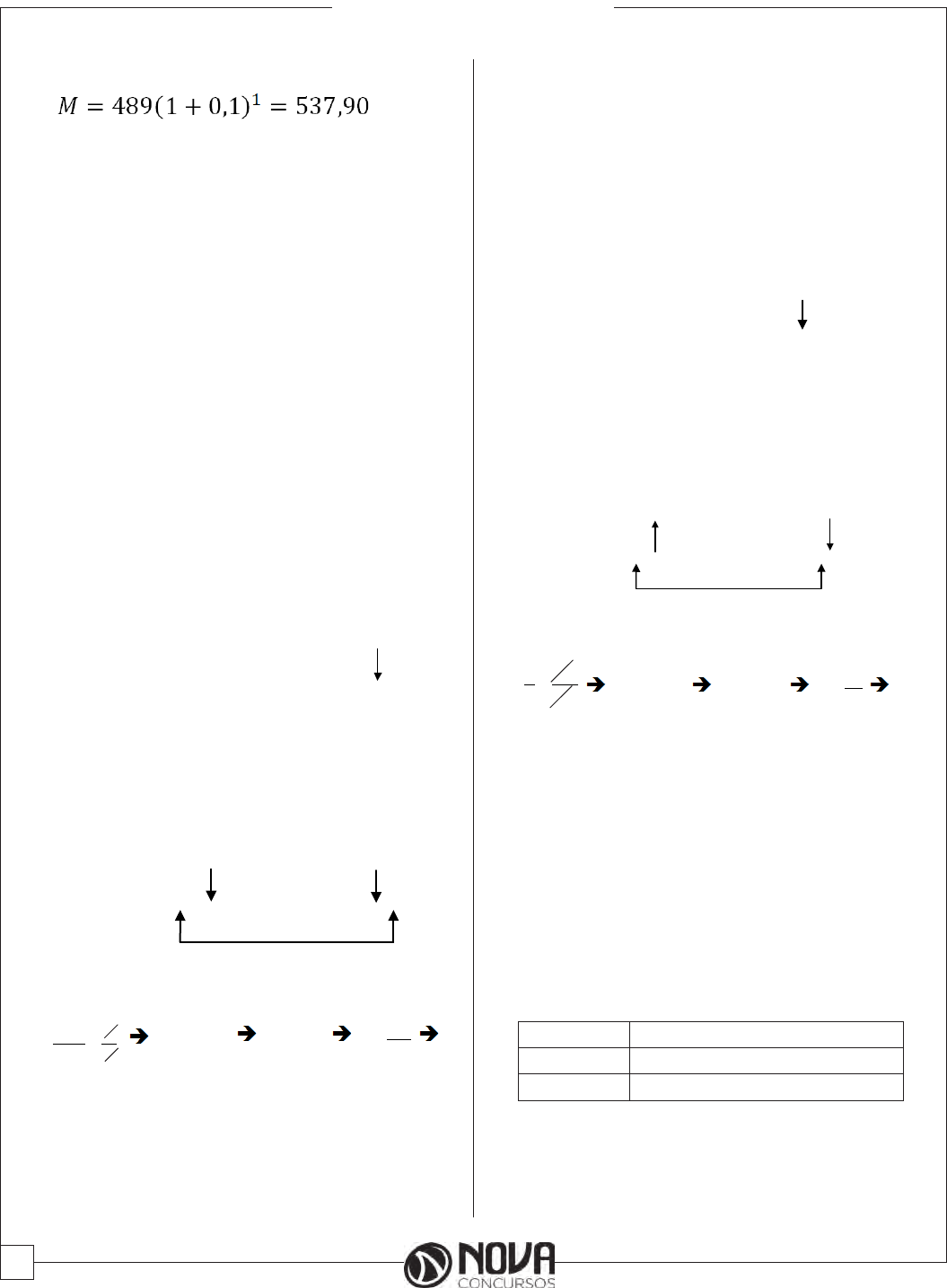 34 MATEMÁTICA Depois de dois meses João pagou R$ 600,00. 1089-600=489 Regra de Três Simples Os problemas que envolvem duas grandezas direta- mente ou inversamente proporcionais podem ser resol- vidos através de um processo prático, chamado regra de três simples. Exemplo 1: Um carro faz 180 km com 15L de álcool. Quantos litros de álcool esse carro gastaria para percorrer 210 km? Solução: O problema envolve duas grandezas: distância e litros de álcool. Indiquemos por x o número de litros de álcool a ser consumido. Coloquemos as grandezas de mesma espécie em uma mesma coluna e as grandezas de espécies diferentes que se correspondem em uma mesma linha: Distância (km) Litros de álcool 180 15 210 x Na coluna em que aparece a variável x (“litros de ál- cool”), vamos colocar uma flecha: Distância (km) Litros de álcool 180 15 210 x Observe que, se duplicarmos a distância, o consumo de álcool também duplica. Então, as grandezas distância e litros de álcool são diretamente proporcionais. No es- quema que estamos montando, indicamos esse fato colo- cando uma flecha na coluna “distância” no mesmo sentido da flecha da coluna “litros de álcool”: Distância (km) Litros de álcool 180 15 210 x mesmo sentido Armando a proporção pela orientação das flechas, te- mos: x 15 210 180 7 6 = 6x = 7 . 15 6x = 105 x = 6 105 x = 17,5 Resposta: O carro gastaria 17,5 L de álcool. Exemplo 2: Viajando de automóvel, à velocidade de 60 km/h, eu gastaria 4 h para fazer certo percurso. Aumen- tando a velocidade para 80 km/h, em quanto tempo farei esse percurso? Solução: Indicando por x o número de horas e colocan- do as grandezas de mesma espécie em uma mesma coluna e as grandezas de espécies diferentes que se correspon- dem em uma mesma linha, temos: Velocidade (km/h) Tempo (h) 60 4 80 x Na coluna em que aparece a variável x (“tempo”), va- mos colocar uma flecha: Velocidade (km/h) Tempo (h) 60 4 80 x Observe que, se duplicarmos a velocidade, o tempo fica reduzido à metade. Isso significa que as grandezas ve- locidade e tempo são inversamente proporcionais. No nosso esquema, esse fato é indicado colocando-se na co- luna “velocidade” uma flecha em sentido contrário ao da flecha da coluna “tempo”: Velocidade (km/h) Tempo (h) 60 4 80 x sentidos contrários Na montagem da proporção devemos seguir o sentido das flechas. Assim, temos: 3 4 60 804 = x 4x = 4 . 3 4x = 12 x = 4 12 x = 3 Resposta: Farei esse percurso em 3 h. Exemplo 3: Ao participar de um treino de Fórmula 1, um competidor, imprimindo velocidade média de 200 km/h, faz o percurso em 18 segundos. Se sua velocidade fosse de 240 km/h, qual o tempo que ele teria gasto no percurso? Vamos representar pela letra x o tempo procurado. Estamos relacionando dois valores da grandeza veloci- dade (200 km/h e 240 km/h) com dois valores da grandeza tempo (18 s e x s). Queremos determinar um desses valores, conhecidos os outros três. Velocidade Tempo gasto para fazer o percurso 200 km/h 18 s 240 km/h x Se duplicarmos a velocidade inicial do carro, o tempo gasto para fazer o percurso cairá para a metade; logo, as grandezas são inversamente proporcionais. Assim, os nú- meros 200 e 240 são inversamente proporcionais aos nú- meros 18 e x. 35 MATEMÁTICA Daí temos: 200 . 18 = 240 . x 3 600 = 240x 240x = 3 600 x = 240 3600 x = 15 Conclui-se, então, que se o competidor tivesse andan- do em 200 km/h, teria gasto 18 segundos para realizar o percurso. Regra de Três Composta O processo usado para resolver problemas que envol- vem mais de duas grandezas, diretamente ou inversamente proporcionais, é chamado regra de três composta. Exemplo 1: Em 4 dias 8 máquinas produziram 160 pe- ças. Em quanto tempo 6 máquinas iguais às primeiras pro- duziriam 300 dessas peças? Solução: Indiquemos o número de dias por x. Coloque- mos as grandezas de mesma espécie em uma só coluna e as grandezas de espécies diferentes que se correspondem em uma mesma linha. Na coluna em que aparece a variável x (“dias”), coloquemos uma flecha: Máquinas Peças Dias 8 160 4 6 300 x Comparemos cada grandeza com aquela em que está o x. As grandezas peças e dias são diretamente proporcio- nais. No nosso esquema isso será indicado colocando-se na coluna “peças” uma flecha no mesmo sentido da flecha da coluna “dias”: Máquinas Peças Dias 8 160 4 6 300 x Mesmo sentido As grandezas máquinas e dias são inversamente pro- porcionais (duplicando o número de máquinas, o número de dias fica reduzido à metade). No nosso esquema isso será indicado colocando-se na coluna (máquinas) uma fle- cha no sentido contrário ao da flecha da coluna “dias”: Máquinas Peças Dias 8 160 4 6 300 x Sentidos contrários Agora vamos montar a proporção, igualando a razão que contém o x, que é x 4 , com o produto das outras razões, obtidas segundo a orientação das flechas 300 160. 8 6 : 5 1 15 8 1 2 300 160. 8 64 = x 5 24 = x => 2x = 4 . 5 a x = 1 2 2 5.4 => x = 10 Resposta: Em 10 dias. Exemplo 2: Uma empreiteira contratou 210 pessoas para pavimentar uma estrada de 300 km em 1 ano. Após 4 meses de serviço, apenas 75 km estavam pavimentados. Quantos empregados ainda devem ser contratados para que a obra seja concluída no tempo previsto? Solução: Em de ano foi pavimentada de estrada. Comparemos cada grandeza com aquela em que está o x. Sentido contrário As grandezas “pessoas” e “tempo” são inversamente proporcionais (duplicando o número de pessoas, o tem- po fica reduzido à metade). No nosso esquema isso será indicado colocando-se na coluna “tempo” uma flecha no sentido contrário ao da flecha da coluna “pessoas”: As grandezas “pessoas” e “estrada” são diretamente proporcionais. No nosso esquema isso será indicado colo- cando-se na coluna “estrada” uma flecha no mesmo senti- do da flecha da coluna “pessoas”: Como já haviam 210 pessoas trabalhando, logo 315 – 210 = 105 pessoas. Reposta: