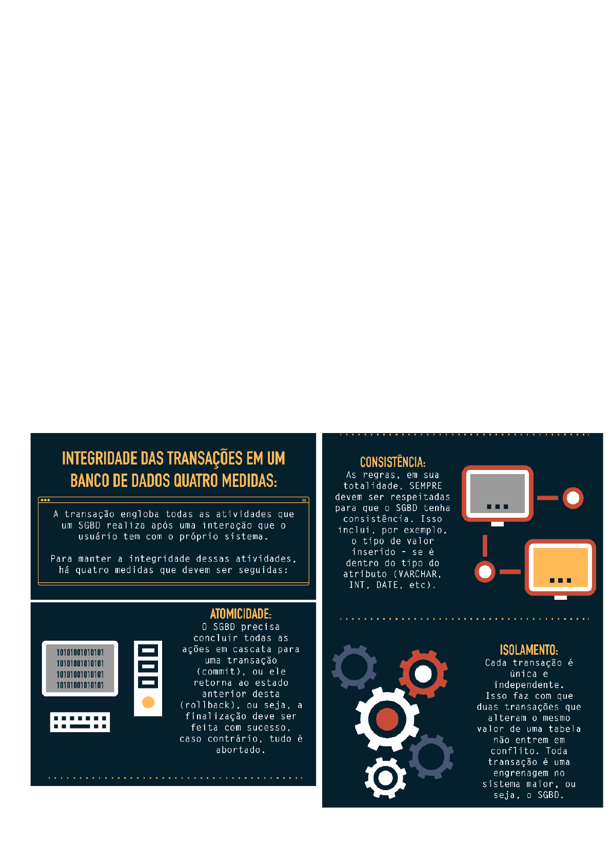 CONCEITOS DE BANCO DE DADOS Apresentação Seja bem-vindo! Nas empresas, há uma infinidade de informações a serem organizadas para controle e extração de dados quando necessário –por exemplo, um relatório. Para isso, utiliza-se o banco de dados, uma maneira de guardar informações como planilhas eletrônicas ou documentos em forma de textos. Nesta Unidade de Aprendizagem, você vai entender a importância da utilização do banco de dados e a diferença entre os sistemas de banco de dados existentes, bem como suas aplicações mais comuns. Você verá, ainda, os aspectos positivos e negativos de cada opção de uso dos sistemas abordados. Bons estudos. Ao final desta Unidade de Aprendizagem, você deve apresentar os seguintes aprendizados: ● Identificar a importância da utilização do banco de dados no contexto organizacional. ● Reconhecer as principais ferramentas de administração de banco de dados. ● Relacionar os principais ambientes de banco de dados. Infográfico No Infográfico a seguir, você vai conhecer as quatro características das transações de um banco de dados e o que fazem. Conteúdo do Livro Quando se trabalha com a tecnologia de banco de dados, a otimização do tempo e a consistência dos dados armazenados são itens fundamentais para que o sistema tenha total exatidão para a tomada de decisão por case em relatórios e extrações pontais. No capítulo Conceitos de banco de dados, do Livro Modelagem e desenvolvimento de banco de dados, você vai entender a priorização do uso de banco de dados em detrimento de qualquer outra forma de guardar as informações – planilhas eletrônicas ou documentos de textos, por exemplo. OBS: O conteúdo será impresso e deixado junto com este material Dica do Professor Conheça a história por trás dos bancos de dados desde sua origem até os dias de hoje. ➔ Conteúdo do Vídeo A linha do tempo da evolução dos Bancos de Dados Década de 60: As informações eram gravadas de forma rudimentar(primitivas e arcaicas para os padrões atuais), mas tecnologia de ponta pra época. Eis que então, a IBM (gigante da indústria tecnológica da época até os dias atuais) investiu em pesquisar para melhorar o relacionamento e atividades de armazenagem de dados do formato virtual. E deu um resultado positivo! A IBM através de seu pesquisador Edgar Frank Codd: realizou a autoria de um modelo relacional de banco de dados que foi um ponto de partida para os banco de dados relacionais. Assim pouco tempo depois, já na década de 70, surgiu o Sistema R e a linguagem SQL(Structured Query Language). Já nos anos 80, outra gigante entrou na área de Banco de Dados, a Oracle que lançou o Oracle 2. E a IBM para não ficar para trás lançou o SQL DS o futuro DB2. Foi lançado também o Microsoft SQL Server com suas diversas versões e características. Tinha o My SQL que era livre, mas acabou comprado pela Oracle e seus idealizadores, realizando um spin off para o Maria DB. Paradox que muitos em consideram como banco de dados e muitos outros vieram na sequência. Já nos tempos atuais, a lista de banco de dados de grande disseminação pode ser a seguinte em ordem alfabética: DB2, MariaDB, Microsoft SQL, Server, MongoDB, MySQL, Oracle, PostgreSQL. Algumas curiosidade ocorreram ao longo da história: ● IBM e suas versões de banco de dados com diversos nomes até chegar ao DB2. ● Aquisição da Informix pela IBM. ● A disputa da primeira posição pelo MarketingShare de banco de dados. ● IBM e seu conceito de banco de dados federados. ● Disputa para usar o nome: Universal Data Base Concluindo, os sistemas de banco de dados atuais são seguros e muito confiáveis além de proporcionar infinitas possibilidades aos desenvolvedores de sistemas para o uso deles. Na Prática É possível construir uma tabela somente com base na consulta SQL, ou seja, realizar o processo inverso. Olhando uma consulta SQL, pode-se identificar as informações das tabelas em que a consulta realiza conexão ou comparação. Acompanhe a experiência de Ronaldo, funcionário novo de uma empresa de TI. Esse tipo de pensamento é muito útil para efetuar manutenção em sistemas de banco de dados que não possuem as informações necessárias. Exercícios 1. Por que deve-se adotar o uso de banco de dados ao invés de planilhas eletrônicas ou outros meios defasados de controle? 2. Qual das alternativas a seguir é um bom atributo para ser chave primária de uma tabela para cadastro de livros do sistema de uma biblioteca? 3. Assinale a alternativa correta em relação aos tipos de atributos das tabelas. 4. Existe cláusula opcional para a consulta SELECT no SQL? 5. Para um pequeno projeto com custo limitado, qual dos bancos de dados a seguir é recomendado?