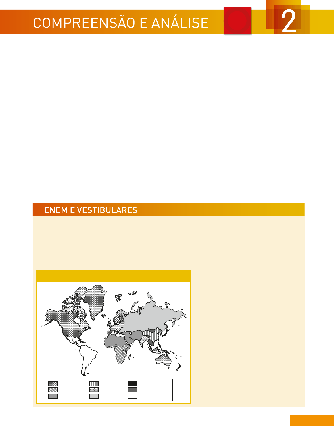 1. Na atual ordem geopolítica mundial, dois países, entre as grandes forças econômicas mundiais, reto- maram investimentos em armamentos e, após o fim da Segunda Guerra, participaram pela primeira vez de ações militares sob o comando da Otan. Aponte quais são esses países e descreva a relevância deles no contexto mundial. 2. Leia o texto e resolva as questões. China: uma superpotência? “[...] se o modelo chinês foi bem-sucedido em condu- zir o país da quase insignificância para o patamar de grande potência, agora o desafio é qualitativamente diferente: de grande potência para superpotência. Isso significa ir além de crescer, reproduzir tecno- logias existentes e ter um grande peso econômico e político. É preciso ser capaz de criar e difundir tec- nologia de ponta, ser aceito como modelo e liderança e projetar seu poder político e militar em qualquer parte do mundo de acordo com suas necessidades.” COSTA, Antonio Luiz M. C. Carta na escola, p. 41. Edição n. 42, dez. 2008 a jan. 2010. a) Apresente dados e informações que demonstrem a importância da China no cenário internacional. b) Discuta as relações da China com o continente africano. c) Comente a importância da Organização de Coope- ração de Shangai e do Banco Asiático de Investi- mento em Infraestrutura (BAII) no contexto geo- político atual. 3. Compare a situação da Rússia no contexto geopolítico do final da década de 1990 à na atualidade. 4. Quais foram as causas e como se desenrolou o recente conflito entre Rússia e Ucrânia? Que interesses estão envolvidos nesse conflito e quais foram suas conse- quências, no contexto geopolítico atual? 5. Qual o papel da Rússia no conflito entre a Moldá- via e o estado separatista da Transnístria? Quais são as motivações históricas e geopolíticas desse conflito? • (Enem 2003) Segundo Samuel Huntington (autor do livro O choque das civilizações e a recomposição da ordem mundial), o mundo está dividido em nove “civilizações” conforme o mapa adiante. Na opinião do autor, o ideal seria que cada civilização principal tivesse pelo menos um assento no Conselho de Segurança das Nações Unidas. Sabendo-se que apenas EUA, China, Rússia, França e Inglaterra são membros permanentes do Conselho de Segurança, e analisando o mapa abaixo, pode-se concluir que D A C O S T A M A P A S Faça no caderno Ocidental Africana Islâmica Sínica Hindu Ortodoxa Japonesa Budista Latino-Americana O mundo das civilizações pós-1990 a) atualmente apenas três civilizações pos- suem membros permanentes no Conse- lho de Segurança. b) o poder no Conselho de Segurança está concentrado em torno de apenas dois terços das civilizações citadas pelo autor. c) o poder no Conselho de Segurança está desequilibrado, porque seus membros pertencem apenas à civilização Ocidental. d) existe uma concentração de poder, já que apenas um continente está repre- sentado no Conselho de Segurança. e) o poder está diluído entre as civiliza- ções, de forma que apenas a África não possui representante no Conselho de Segurança. 63Capítulo 2 – Grandes atores da geopolítica no mundo atual TS_V2_U1_CAP02_038_065.indd 63 17/05/16 19:35 PROJETO: DE OLHO NAS PROPAGANDAS Objetivos: 1) Compreender como as novas tecnologias criam e recriam mercadorias, valores, necessidades e trans- formam as relações sociais. 2) Identificar e analisar criticamente as propagandas veiculadas em diferentes mídias. 3) Refletir sobre a influência da propaganda no modo de vida contemporâneo. PUBLICIDADE E VALORES A propaganda sempre foi utilizada para divulgar valores, opiniões, informações, produtos e serviços. Com o desenvolvimento tecnológico, ampliaram-se a capacidade de produção e a inovação, assim como os meios de comunicação e o acesso a eles, colaborando para uma maior difusão da propaganda. Os governos e as instituições, da esfera federal até a municipal, fazem uso da publicidade para tornar públi- cos programas de abastecimento de água, projetos escolares, divulgação científica, segurança pública, entre outros. As empresas privadas, por sua vez, têm objetivos de vender mercadorias. Diariamente, somos bombardeados por propagandas que buscam nos vender uma ideia, um produto, um serviço ou até mesmo um estilo de vida. Um exemplo disso é a conservação ambiental e a sustentabilidade. Sociedade e empresas são convidadas a participar de um movimento que visa assegurar um planeta melhor para as gerações futuras. O mercado, no entanto, logo se apropriou dessa ideia do movimento sustentável, pois viu nela uma possibilidade de lucro. O papel da publicidade aqui é atrelar a imagem da empresa à ideia do ecologicamente responsável; com isso, a empresa ganha mais mercado consumidor. Uma fatia da publicidade é destinada às crianças e aos adolescentes. Por considerá-los vulneráveis, alguns países adotam medidas para controlar a publicidade destinada a esse público. Em Quebec (uma província do Canadá), a publicidade infantil foi banida; na Suécia, as propagandas estão proibidas na televisão aberta. O Brasil recomenda que se evite publicidade que induza a criança ao consumo de produtos e serviços. Diante dessa realidade, é fundamental refletir sobre a disseminação dessas ideias, valores e produtos, aos quais somos submetidos toda vez que acessamos a internet, ligamos a televisão, abrimos uma revista ou um jornal, ouvimos o rádio ou circulamos pelas ruas e avenidas. É imprescindível refletir sobre a real neces- sidade dos produtos que consumimos. Compramos porque precisamos ou porque somos persuadidos a comprar para satisfazer uma ideia de realização material e aceitação social? Para sugestões de encaminhamento e avaliação do projeto, consulte o Manual do Professor – Orientações Didáticas. Sugestões de mídias que podem ajudá-lo na reali- zação deste projeto: Sites Akatu www.akatu.org.br Conselho Nacional de
