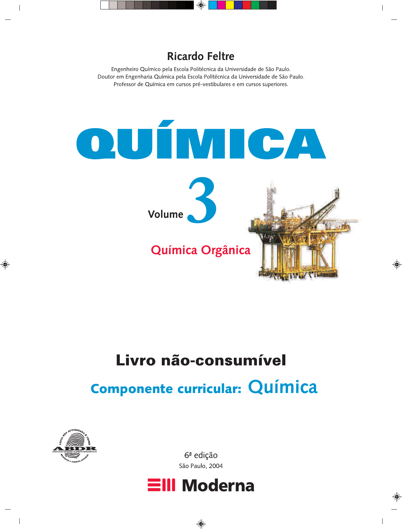 Fronts Quimica 3 Feltre LA 14/06/2005 11:14 Page 1 Composite C M Y CM MY CY CMY K Ilustrações: Adilson Secco, Aline Pellissari Antonini Ruiz, Jurandir Ribeiro, Nelson Matsuda CO RB IS – ST O CK PH O TO S Título original: QUÍMICA © Ricardo Feltre, 2004 Coordenação editorial: José Luiz Carvalho da Cruz Edição de texto: Alexandre da Silva Sanchez, Flávia Schiavo, Márcio Costa, Regina Gimenez Colaboradora: Soraya Saadeh (Manual do Professor) Revisão técnica: Carlos Roque Duarte Correia, Soraya Saadeh Revisão editorial: Iraci Miyuki Kishi Preparação de texto: Morissawa Casa de Edição ME Assistência editorial: Joel de Jesus Paulo, Rosane Cristina Thahira, Regiane de Cássia Thahira Coordenação de design e projetos visuais: Sandra Botelho de Carvalho Homma Projeto gráfico: Marta Cerqueira Leite, Sandra Botelho de Carvalho Homma Capa: Luiz Fernando Rubio Foto: Plataforma de petróleo © Corbis-Stock Photos Coordenação de produção gráfica: André Monteiro, Maria de Lourdes Rodrigues Coordenação de revisão: Estevam Vieira Lédo Jr. Revisão: Lumi Casa de Edição Ltda., Márcia Benjamim Coordenação de arte: Wilson Gazzoni Agostinho Edição de arte: Wilson Gazzoni Agostinho Editoração eletrônica: Setup Bureau Editoração Eletrônica Coordenação de pesquisa iconográfica: Ana Lucia Soares Pesquisa iconográfica: Vera Lucia da Silva Barrionuevo As imagens identificadas com a sigla CID foram fornecidas pelo Centro de Informação e Documentação da Editora Moderna. Coordenação de tratamento de imagens: Américo Jesus Tratamento de imagens: Fabio N. Precendo e Riedel Pedrosa Saída de filmes: Helio P. de Souza Filho, Marcio H. Kamoto Coordenação de produção industrial: Wilson Aparecido Troque Impressão e acabamento: Reprodução proibida. Art. 184 do Código Penal e Lei 9.610 de 19 de fevereiro de 1998. Todos os direitos reservados EDITORA MODERNA LTDA. Rua Padre Adelino, 758 - Belenzinho São Paulo - SP - Brasil - CEP 03303-904 Vendas e Atendimento: Tel. (0_ _11) 6090-1500 Fax (0_ _11) 6090-1501 www.moderna.com.br 2005 Impresso no Brasil 1 3 5 7 9 10 8 6 4 2 Dados Internacionais de Catalogação na Publicação (CIP) (Câmara Brasileira do Livro, SP, Brasil) Feltre, Ricardo, 1928- . Química / Ricardo Feltre. — 6. ed. — São Paulo : Moderna, 2004. Obra em 3 v. Conteúdo: V. 1. Química geral — v. 2. Físico-química — v. 3. Química orgânica Bibliografia. 1. Química (Ensino médio) 2. Físico-química (Ensino médio) — Problemas, exercícios etc. I. Título. 04-2879 CDD-540.7 Índices para catálogo sistemático: 1. Química : Ensino médio 540.7 Ficha QUIMICA 3-PNLEM-LA 06/14/2005, 10:232 APRESENTAÇÃO R ep ro du çã o pr oi bi da . A rt .1 84 do C ód ig o P en al e Le i 9 .6 10 de 19 de fe ve re iro de 19 98 . Em seus três volumes, esta obra procura contribuir para o ensino da Química entre os alunos do Ensino Médio. Nela são apresentados os conhecimentos básicos da Química e suas aplicações mais importantes. Continuamos nos guian- do para a simplificação da teoria, na articulação desta com os fatos do cotidiano e na diversificação dos exercícios. Para atingir essa finalidade, cada capítulo da obra foi dividido em tópicos que visam tornar a exposição teórica gradual e didática. No final de cada tópico, propusemos algumas perguntas cuja finalidade é a revisão das idéias principais aí desenvolvidas, seguindo-se também uma série de exercícios sobre o que foi discutido. Em todos os capítulos foram colocados, em muitas opor- tunidades, boxes com curiosidades e aplicações da Química, pequenas biografias de cientistas, sugestões de atividades práticas e leituras. A intenção dessas seções foi proporcio- nar maior articulação dessa ciência com outras, como a Ma- temática, a Física e a Biologia, e também com os avanços tecnológicos. Agradecemos aos professores e aos alunos que presti- giam nossa obra e reiteramos que críticas e sugestões serão sempre bem recebidas. O autor Iniciais-QF3-PNLEM 29/6/05, 14:053