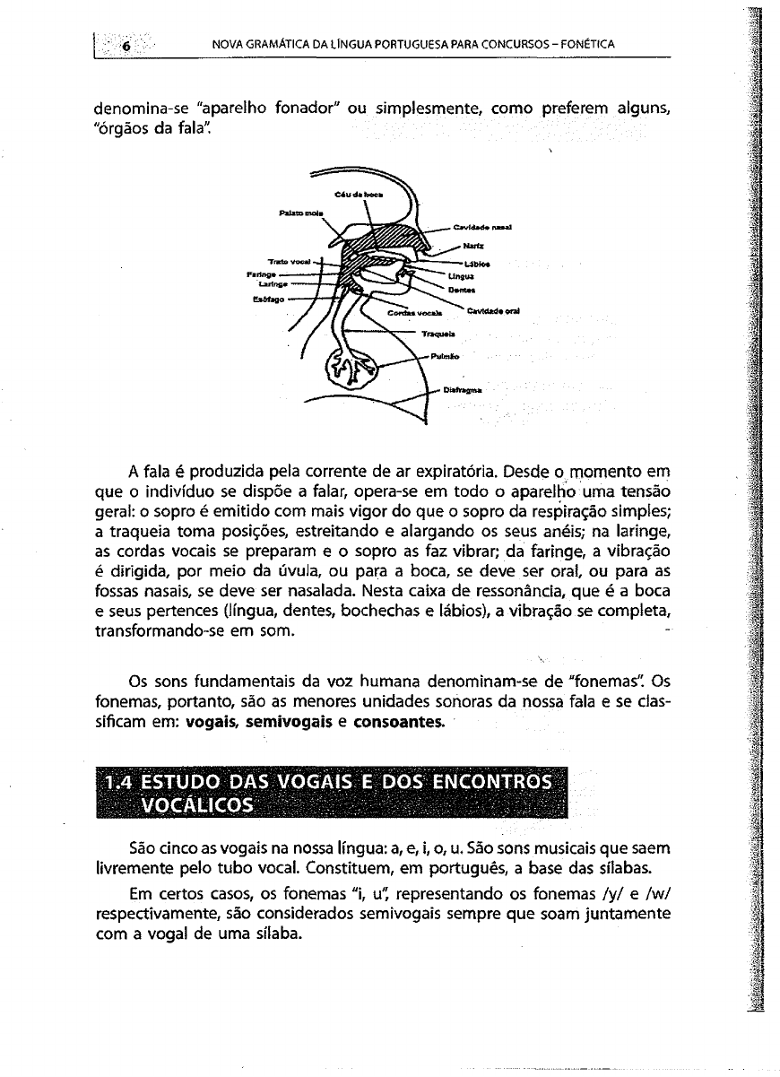 6 ü NOVA GRAMÁTICA DA LÍNGUA PORTUGUESA PARA CONCURSOS - FONÉTICA denomina-se "aparelho fonador" ou simplesmente, como preferem alguns, "órgãos da fala" A fala é produzida pela corrente de ar expiratória. Desde o momento em que o indivíduo se dispõe a falar, opera-se em todo o aparelho uma tensão geral: o sopro é emitido com mais vigor do que o sopro da respiração simples; a traqueia toma posições, estreitando e alargando os seus anéis; na laringe, as cordas vocais se preparam e o sopro as faz vibrar; da faringe, a vibração é dirigida, por meio da úvula, ou para a boca, se deve ser oral, ou para as fossas nasais, se deve ser nasalada. Nesta caixa de ressonância, que é a boca e seus pertences (língua, dentes, bochechas e lábios), a vibração se completa, transformando-se em som. Os sons fundamentais da voz humana denominam-se de "fonemas". Os fonemas, portanto, são as menores unidades sonoras da nossa fala e se clas sificam em: vogais, semivogais e consoantes. 1.4 ESTUDO DAS VOGAIS E DOS ENCONTROS f f i i v Ò Ê a ü c q s E : ! ^ ^ . São cinco as vogais na nossa língua: a, e, i, o, u. São sons musicais que saem livremente pelo tubo vocal. Constituem, em português, a base das sílabas. Em certos casos, os fonemas "i, u" representando os fonemas /y/ e /w/ respectivamente, são considerados semivogais sempre que soam juntamente com a vogal de uma sílaba. Capitulo 1 - FONÉTICA E FONOLOGIA 1.5 CLASSIFICAÇÃO DAS VOGAIS a) Quanto à zona de articulação: anteriores, médias e posteriores. b) Quanto ao timbre: abertas, fechadas e reduzidas. c) Quanto ao papel das cavidades bucal e nasal: orais e nasais. d) Quanto à intensidade: átonas e tônicas. 1.5*1 QUANTO À ZONA DE ARTICULAÇÃO A vogal "a"forma-se com a maior abertura da boca/ficando a língua em posição de quem respira em silêncio (posição média ou neutra). Por isso, a voga! "a" é chamada de "média, mediai ou central". Se a língua se eleva gradualmente para a frente, formam-se as vogais anteriores ou palatais (é, ê, e, i); se se eleva para trás, formam-se as vogais posteriores ou velares (ó, ô, o, u). Observe figura abaixo. A Posição das Vogaisd* Emtate d.\tat Observe nas figuras acima a distribuição triangular das vogais quanto à zona de articulação. 1.5.2 QUANTO AO TIMBRE O timbre de uma vogai é dado pela maior ou menor proximidade da língua com o palato. Na vogal aberta, a língua se abaixa: é, ó. Na vogal fe chada, a língua se eleva: ê, ô, i, u. Por isso, as vogais são classificadas quanto ao timbre em: NOVA GRAMÁTICA DA LÍNGUA PORTUGUESA PARA CONCURSOS - FONÉTICA a) Abertas *■> á, é, ó = pá, pé, pó. b) Fechadas ê, ô: vê, avô. c) Reduzidas -> a (bela), e (vale), o (pelo) Observação: As vogais reduzidas tomam esse nome por pertencerem a sílabas átonas, sendo, pois, pronunciadas fracamente. 1.5.3 QUANTO AO PAPEL DAS CAVIDADES BUCAL E NASAL Quanto ao papel das cavidades bucal e nasal, as vogais dassificam-se em: a) Orais que se formam com o véu palatino levantado, saindo a coluna de ar somente pela boca: a, e, i, o, u. b) Nasais que se formam com o abaixamento do véu palatino, distribuindo-se a coluna de ar pela boca e nariz: ã, ê, í, õ, ü. Quanto à intensidade, as vogais podem ser átonas ou tônicas. A vogal tônica é pronunciada com mais intensidade que as outras. Encontra-se na sílaba tônica da palavra. Excetuando-se as sílabas tônica e subtônica de uma palavra, as demais são chamadas de átonas. As vogais dessas sílabas átonas são também átonas. Observe: 1.5.4 QUANTO À INTENSIDADE acarajé lâmpada a - átona c a - átona â - tônica m Pr é - tônica a - átona a - átona d a - átona