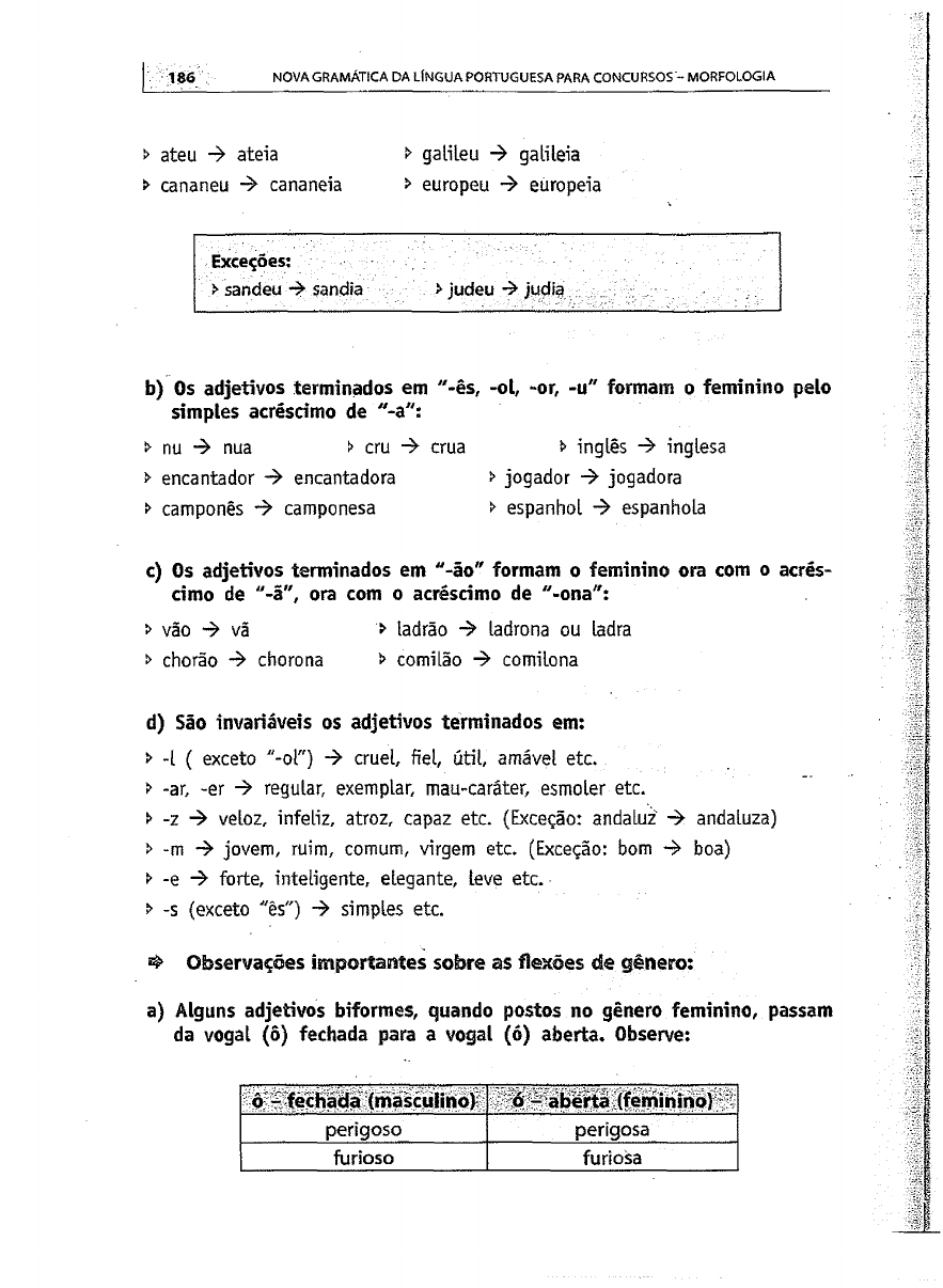 186 NOVA GRAMÁTICA DA ÜNGUA PORTUGUESA PARA CONCURSOS - MORFOLOGIA > ateu -> ateia > galileu ga Li leia > cananeu cananeia > europeu -> europeia Exceções: > sandeu sandia > judeu judia b) Os adjetivos terminados em "-ês, -ol, -or, -u" formam o feminino pelo simples acrésdmo de "-a": > nu nua > cru -$■ crua > inglês inglesa > encantador -> encantadora > jogador jogadora > camponês camponesa > espanhol espanhola c) Os adjetivos terminados em "-ão" formam o feminino ora com o acrés cimo de "-ã", ora com o acrésdmo de "-ona": > vão vã > ladrão -> ladrona ou ladra > chorão chorona > comilão -> comilona d) São invariáveis os adjetivos terminados em: > -l ( exceto "-ol") -> cruel, fiel, útil, amável etc. > -ar, -er regular, exemplar, mau-carãter, esmoler etc. > -z veloz, infeliz, atroz, capaz etc. (Exceção: andaluz' -> andaluza) > -m jovem, ruim, comum, virgem etc. (Exceção: bom *-> boa) > -e forte, inteligente, elegante, leve etc. ■ s> -s (exceto "ês") -> simples etc. Observações importantes sobre as flexões de gênero: a) Alguns adjetivos biformes, quando postos no gênero feminino, passam da vogal (ô) fechada para a vogal (6) aberta. Observe: I ô - fechada (masculino) ó - aberta (feminino) perigoso perigosa j furioso furiosa Capítulo 3 - ADJETIVO 187 ô - fechada (máscüíinb) ó - aberta (feminino) V religioso religiosa bondoso bondosa mimoso mimosa b) Outros adjetivos, entretanto, mantêm a mesma vogal (ô) fechada do masculino no feminino. m m m m m m r n m fosco fosca oco oca gordo gorda moço moça solto solta c) 0 adjetivo "só", significando "sozinho", é invariável quanto ao gênero. > Etes ficaram sós. > Elas ficaram sós. 3.4.2 FLEXÕES DE NÚMERO a) Como já dissemos, o adjetivo acompanha o substantivo e com este concorda. Portanto, o adjetivo se flexionará em número de acordo com as règras que se utilizam para a flexão de número dos substantivos. ;> vestido azul vestidos azuis > prato espanhol -> pratos espanhóis > questão comum -> questões comuns > pensamento vão -> pensamentos vãos b) Nos adjetivos compostos, só o último elemento se flexiona. > intervenção médico-cirúrgica intervenções médico-cirúrgicas > acordo luso-latino-americano acordos luso-latino-americanos > problema sodopolítico -> problemas soriopoliticos > 'tratado franco-brasileiro -> tratados franco-brasileiros > cabelo castanho-escuro cabelos castanho-escuros NOVA GRAMÁTICA DA LÍNGUA PORTUGUESA PARA CONCURSOS - MORFOLOGIA c) São invariáveis os adjetivos compostos formados de "cor + de -s- subs tantivo". Observe? í> blusa cor-de-rosa -> blusas cor-de-rosa > azulejos cof de musgo í> suéter cor de café com leite suêteres cor de café com leite & Observação: Nos exemplos, há a omissão da preposição "de" entre o primeiro subs tantivo e a palavra "cor" Logo, também seria gramaticalmente correta a seguinte escrita: í> luvas de cor de café > vestidos de cor de chocolate > meias de cor de rosa Em outras construções, omitem-se as três palavras "de cor de" fazendo com que o substantivo indicativo da cor modifique diretamente o substanti vo cuja cor se quer indicar. Ainda neste caso, o substantivo indicativo da cor permanecerá invariável. > luvas salmão -> omissão de "de cor de" s> cetim rosa -> omissão de "de cor de" > fita creme omissão de "de cor de" » tecido laranja omissão de "de cor de" d) São igualmente invariáveis os compostos formados de "adjetivo + substantivo". > calça amarelo-ouro -> calças amarelo-ouro i> terno verde-oliva ternos verde-oliva > tecido vermelho-sangue -> tecidos vermelho-sangue > sofá azul-ferrete -> sofás azul-ferrete Observações: a) Excetuam-sè das regras acima os adjetivos "surdo-mudo" e"surda-muda", cujos plurais são, respectivamente, "surdos-mudos" e "surdas-mudas" b) A despeito de os dicionaristas registrarem - respaldados, diga-se de passagem, pelo Vocabulário Ortográfico da língua portuguesa - os plurais "azuls-marinhos" e "azuis-celestes", prefere-se utilizar, no portu guês corrente, estes adjetivos como invariáveis: calças azul-marinho, blusas azul-celeste.