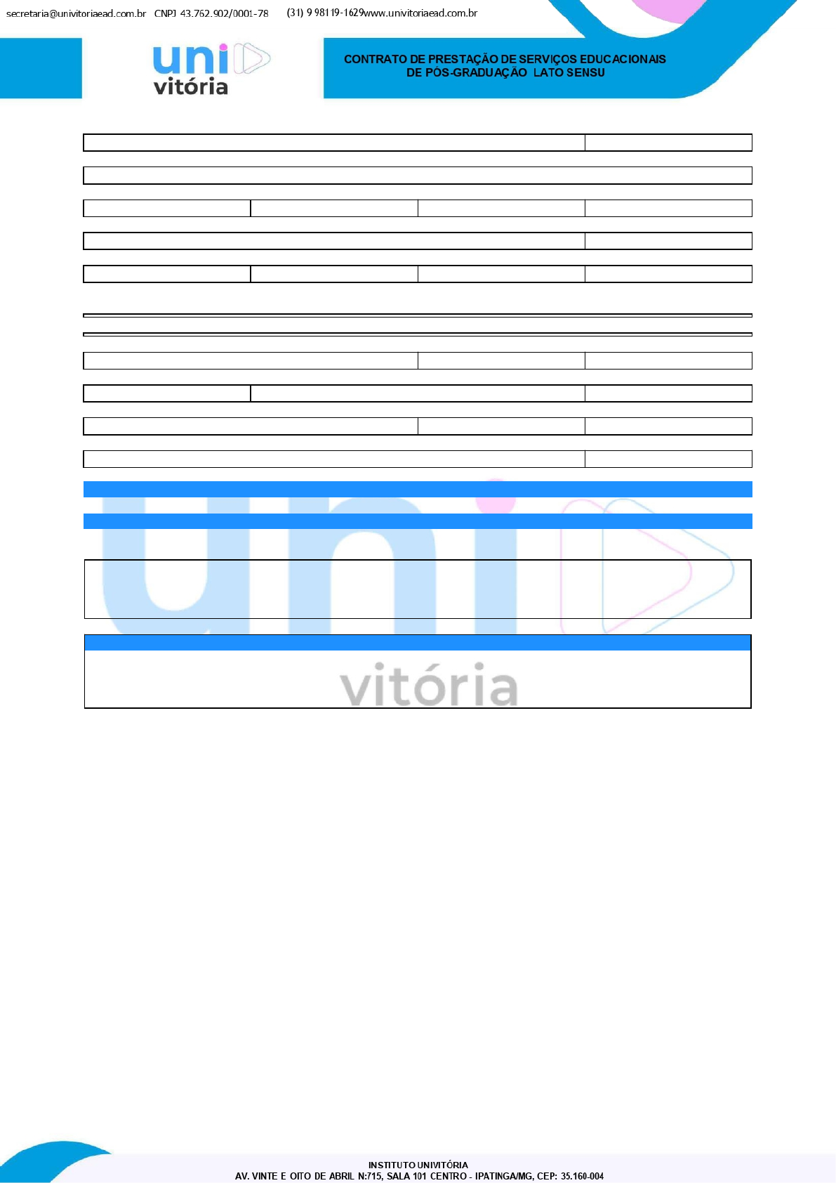Nome do Curso: Nº de Matrícula: ANÁLISE CRIMINAL 022058200001 Aluno (a): SILVIO MOREIRA ALVES JÚNIOR Nacionalidade: Cidade onde nasceu: Estado: Sexo: Brasileiro Coruripe AL Masculino E-mail: Data de nascimento: silviojr.adv@outlook.com.br 01/11/1995 Identidade: Órgão Emissor: CPF: Estado Civil: 36445177 080.544.384-35 Solteiro Filiação: Pai: Mãe: Av/Rua: N°: Apto: Rua da Alegria 195 Casa Bairro: Cidade: Estado: Coruripe AL CEP: Telefone Residencial: Telefone Celular: 57230-000 (82) 99933-4504 Qual curso você se graduou: Mês/Ano da Colação de Grau: ANÁLISE CRIMINAL PÓS-GRADUAÇÃO A) (X) 17 parcelas de R$ 20,00 B.( ) 01 x R$2.300,00 C.( ) 06 x R$384,00 D.( ) 18 x R$128,00 MATERIAL DIDÁTICO A) () 1 parcela de R$ 0,01 B) ( ) 1 x R$900,00 C) (x) Material on-line gratuito O VALOR DA TAXA DE MATRÍCULA É DE R$300,00 VALOR COM O DESCONTO:____________________ PREFIRO PAGAR OS BOLETOS TODO DIA _______ DE CADA MÊS *MATRÍCULA DE ENGENHARIA DE SEGURANÇA É DE R$600,00 DOCUMENTOS OBRIGATÓRIOS PARA CONFECÇÃO DO CERTIFICADO A. RG B. CPF C. Histórico da Graduação D. Diploma da Graduação E. Comprovante de alistamento militar ou dispensa (para homens) G. Título de Eleitor (comprovante/certidão de quitação eleitoral) H. Certidão de nascimento ou casamento F. Contrato (assinatura digital no portal do aluno) 1. Todos os cursos deverão ter duração mínima de 4 meses e máxima de 18 meses,contados a partir do pagamento da matrícula; é considerada a data de colação de grau do curso superior; 2. Pós graduação em Engenharia de Segurança do Trabalho deverá ter duração mínima de 6 meses e máxima de 18 meses. 3. Ser aprovado nas avaliações em todas as disciplinas com nota mínima de 70 (setenta) pontos; 4. Entregar toda documentação exigida; CONTRATO DE PRESTAÇÃO DE SERVIÇOS EDUCACIONAIS DE PÓS-GRADUAÇÃO LATO SENSU Por um lado, a CONTRATADA: INSTITUTO SERRA GERAL EAD inscrito no CNPJ sob o n° 41.482.531/0001-45 situada na rua PRIMEIRO DE JANEIRO, 35, sala 104 centro, TIMOTÉO/MG CEP: 35180-032 neste ato representada pelo INSTITUTO UNIVITÓRIA inscrito no CNPJ 43.762.902/0001- 78, situado na rua Av. vinte e oito de abril, 715, Sala 101 – Centro, Ipatinga/MG CEP: 35.160-004 e por outro lado o ALUNO CONTRATANTE. RESPONSÁVEL FINANCEIRO Nome: SILVIO MOREIRA ALVES JÚNIOR CPF: 080.544.384-35 RG: 36445177 Endereço: Rua da Alegria, N° 195 Coruripe Telefone Celular: (82) 99933-4504 (82) 99933-4504 Email: silviojr.adv@outlook.com.br CONSIDERAÇÕES INICIAIS As partes acima identificadas têm, entre si, justo e acertado o presente Contrato de Prestação de Serviços Educacionais, que se regerá pelas cláusulas seguintes e pelas condições de valor, forma e termo de pagamento descritas no presente, bem como nos termos da Legislação Educacional vigente e consubstanciado nos seguintes diplomas: Artigos 5º, inciso II e 209 da Constituição Federal; Artigos 104, 185, 427, 472, 476 e 477 do Código Civil; Artigos 2º, 3º §2º e art. 54 §3° do Código de Defesa do Consumidor e pela Lei 9.870/99. OBJETO DO CONTRATO CLÁUSULA PRIMEIRA: O objeto do presente contrato é a Prestação de Serviços Educacionais, na modalidade à distância, do Curso de Pós-Graduação Lato-Sensu --Especialização-- atendendo a Resolução CNE/CES N° 01 do dia 08/06/2007 e Portaria do MEC N° 1.999 do dia 20/12/2006, Portaria do MEC N° 3.445 do dia 19/11/2003 com validade em todo território Nacional. 1. Como serviços educacionais mencionados nesta cláusula se entendem aqueles obrigatoriamente prestados na modalidade à distância, via internet, utilizando ferramentas tecnológicas de informação e comunicação, e ambiente virtual de aprendizagem na web selecionados pelo Instituto Univitória, tendo em vista a natureza do conteúdo e das técnicas pedagógicas que se fizerem necessárias. 2. O curso, objeto deste contrato, deverá ter duração mínima de 4(quatro) meses com carga horária mínima de 360 horas, e duração máxima de 18 meses, contados a partir do pagamento da matrícula; A PÓS-GRADUAÇÃO EM ENGENHARIA DE SEGURANÇA DO TRABALHO DEVERÁ TER DURAÇÃO MÍNIMA DE 6 MESES E MÁXIMA DE 18 MESES §1° É possível a extensão do prazo limite de 18 meses para conclusão do curso, por mais 12 meses, mediante pagamento de taxa no valor de R$100,00 (Cem reais) mais o pagamento correspondente a uma parcela por cada mês de extensão. Extensão = Taxa + parcelas correspondentes a quantidade de meses de extensão. §2° O Aluno que não concluir a Pós Graduação dentro do prazo de 12 meses referente a extensão do curso, terá o seu curso cancelado. 3. O período de prestação de serviços referente a este contrato será de acordo com a duração do curso objeto do contrato. 4. As disciplinas deverão ser cursadas pelo Contratante conforme Conteúdo Programático do curso no qual o Aluno efetuou a matrícula. O CONTRATANTE que iniciar um curso diferente da área de sua graduação, fica ciente que o certificado da especialização será somente a título de conhecimento. 5. A grade curricular do curso poderá sofrer alterações ou atualizações ao longo do curso, conforme necessidade do Instituto Univitória, sendo tais alterações disponibilizadas ao aluno, durante o período regular de realização do curso, em tempo hábil para que seja possível o acesso ao conteúdo de cada disciplina antes da realização da respectiva avaliação, não sofrendo o Aluno qualquer prejuízo em função de ditas alterações 6. O Aluno declara estar ciente que a CONTRATADA não trabalha com o sistema de vídeo aula, mas através de apostilas disponíveis em PDF no PORTAL DO ALUNO, e caso opte por receber as apostilas impressas, deverá pagar referente ao material o valor de R$900,00 (novecentos reais). 7. Ao celebrar o presente contrato, o CONTRATANTE submete-se ao regime da CONTRATADA, as normas do programa de Pós Graduação lato sensu neste instrumento e no Guia Informati