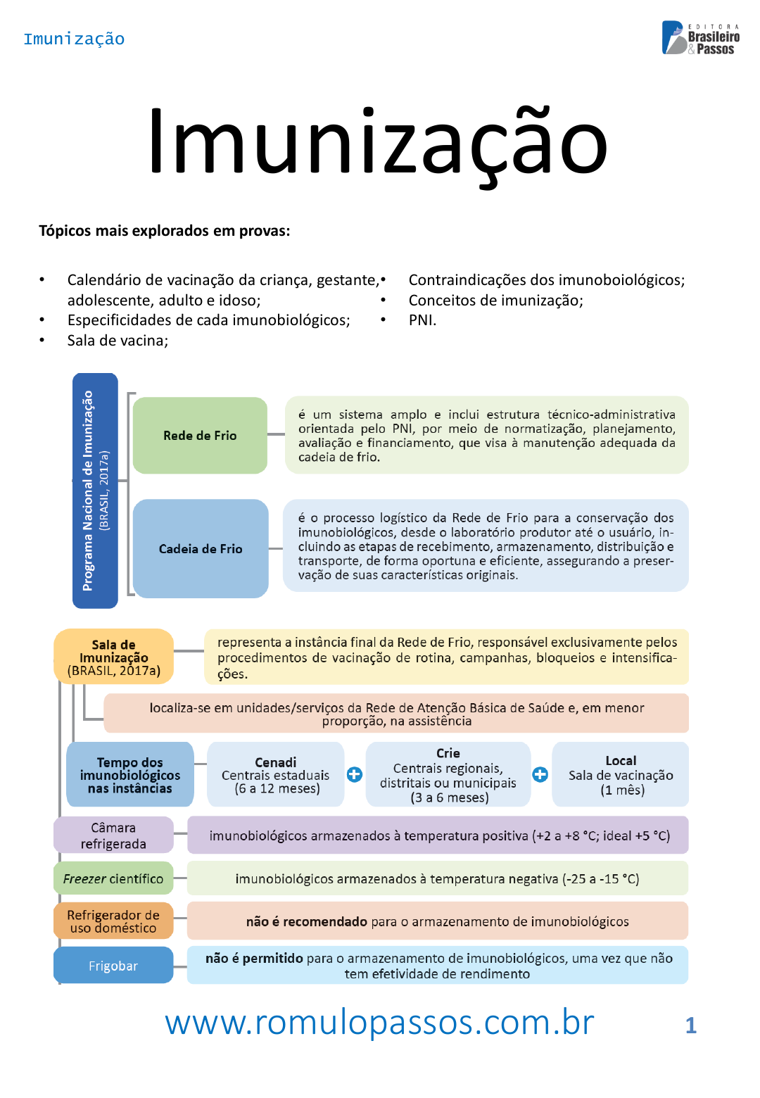 www.romulopassos.com.br Imunização 1 Imunização Tópicos mais explorados em provas: • Calendário de vacinação da criança, gestante, adolescente, adulto e idoso; • Especificidades de cada imunobiológicos; • Sala de vacina; • Contraindicações dos imunoboiológicos; • Conceitos de imunização; • PNI. Ana Clara Picanço Duque - 02330095236 www.romulopassos.com.br Imunização 2 1. (Prefeitura de Cruzeiro do Sul-AC/IBFC/2019) Segundo o Manual de Rede de Frio do Programa Nacional de Imunizações (BRASIL, 2017), na organização das caixas térmicas de uso diário, na sala de imunização, recomenda-se o uso de caixa térmica de poliuretano com capacidade mínima. Sobre a capacidade mínima recomendada, assinale a alternativa correta. a) 12 litros. b) 8 litros. c) 6 litros. d) 7 litros. 2. (EBSERH/HU-UNIFAP/IBFC/2022) Sobre a vacina BCG, assinale a alternativa correta. a) Não adiar a vacinação com BCG, mesmo que a criança tenha nascido com peso inferior a 2 kg. b) A comprovação da vacinação com BCG é feita por meio do registro da vacinação no cartão ou caderneta de vacinação, da identificação da cicatriz vacinal ou da palpação de nódulo no deltoide direito, na ausência de cicatriz. c) Na rotina dos serviços, a vacina é disponibilizada para crianças de até 10 (dez) anos 11 meses e 29 dias, ainda não vacinadas. d) Crianças vacinadas na faixa etária preconizada que não apresentam cicatriz vacinal necessitam ser revacinadas. e) Esta vacina também está indicada para gestantes e pessoas imunodeprimidas. Ana Clara Picanço Duque - 02330095236 www.romulopassos.com.br Imunização 3 3. (HU-UNIFAP/EBSERH/IBFC/2022) Sobre vacinar contatos prolongados de portadores de hanseníase com a BCG, assinale a alternativa correta. a) A partir de 1 (um) ano de idade, sem cicatriz, deve-se administrar 1 (uma) dose. b) A partir de 1 (um) ano de idade, vacinados com 1 (uma) dose, não administrar outra dose de BCG. c) A partir de 1 (um) ano de idade, vacinados com 2 (duas) doses, administrar outra dose de BCG, com intervalo mínimo de 6 (seis) meses após a dose anterior. d) A partir dos 10 (dez) anos de idade, pessoas portadoras de HIV não devem ser vacinadas, mesmo que assintomáticas e sem sinais de imunodeficiência. e) A partir dos 5 (cinco) anos de idade, pessoas portadoras de HIV devem ser vacinadas, mesmo que sintomáticas e apresente sinais de imunodeficiência. 4. (HUGG-UNIRIO/EBSERH/IBFC/2017) Sobre a vacina BCG, analise as afirmativas a seguir e assinale a alternativa correta. I. Imediatamente após a injeção da vacina BCG aparece no local uma pápula de aspecto esbranquiçado e poroso (tipo casca de laranja), com bordas bem nítidas e delimitadas. II. A compressão mecânica deve ser realizada no local da vacinação, no dia seguinte de sua aplicação. III. Como cuidados com a lesão, deve-se cobrir a úlcera e fazer uso de compressas quentes. IV. Não é necessário colocar qualquer medicamento na úlcera da lesão vacinal. Estão corretas as afirmativas: a) I e IV, apenas. c) I apenas. e) I, II, III e IV. b) I, III e IV, apenas. d) II, III e IV, apenas. Ana Clara Picanço Duque - 02330095236 www.romulopassos.com.br Imunização 4 5. (PM-ES/AOCP/2023) Em relação à vacina contra Hepatite A, assinale a alternativa correta. a) Dosagem e via de administração: 0,5 ml por via intramuscular profunda. b) Apresentação: forma liofilizada, multidoses e acompanhada do respectivo diluente. c) Para indivíduos de 12 meses a 29 anos de idade, administrar 2 (duas) doses, conforme situação vacinal encontrada. d) Administrar a 1ª dose aos 12 meses de idade e a 2ª dose a partir de 15 meses de idade. e) Local de aplicação: região posterior do braço ou tríceps braquial direito. Ana Clara Picanço Duque - 02330095236 www.romulopassos.com.br Imunização 5 6. (TRT 17ª Região-ES/FCC/2022) A equipe de saúde do ambulatório do Tribunal Regional do Trabalho iniciou uma campanha para prevenção de doenças transmissíveis e, dentre as ações realizadas, está o levantamento da cobertura vacinal dos colaboradores por meio da análise da situação da carteira de vacinação. Ao identificar um colaborador sem comprovação vacinal para a vacina da hepatite B, a equipe deve orientá-lo quanto à necessidade em administrar 3 doses da vacina com intervalo de a) 30 dias entre a primeira e a segunda dose, e de 6 meses entre a segunda e a terceira dose. b) 30 dias entre a primeira e a segunda dose, e de 6 meses entre a primeira e a terceira dose. c) 60 dias entre a primeira e a segunda dose, e de 60 dias entre a segunda e a terceira dose. d) 60 dias entre a primeira e a segunda dose, e de 5 meses entre a primeira e a terceira dose. e) 30 dias entre a primeira e a segunda dose, e de 90 dias entre a segunda e a terceira dose. 7. (EBSERH Nacional/VUNESP/2020) Em 31.01.2020, C.S., 32 anos, sexo feminino, sofreu queimaduras de primeiro e segundo graus em 15% da superfície corporal devido à exposição a líquido quente, e está internada. Ao cumprir o protocolo assistencial da instituição para esses casos, o enfermeiro solicitou a carteira de vacinação da paciente, na qual constavam os seguintes registros: No que diz respeito à prevenção do tétano, de acordo com o calendário nacional de vacinação que compõe o Programa Nacional de Imunização – PNI, o enfermeiro deve a) reiniciar o esquema vacinal com a vacina dT, pois os intervalos entre as doses foram demasiado longos, o que não garante imunidade contra a doença. Ana Clara Picanço Duque - 02330095236 www.romulopassos.com.br Imunização 6 b) considerar que o esquema vacinal está completo, sendo desnecessária a aplicação de dose de reforço da vacina dupla adulto. c) aplicar uma dose de reforço da vacina dT, pois a última dose foi administrada há mais de 10 anos. d) aplicar a segunda dose da vacina dTpa e agendar uma dose de reforço após 60 dias. 8. (Prefeitura de Manaus-AM/FGV/2022) Conf