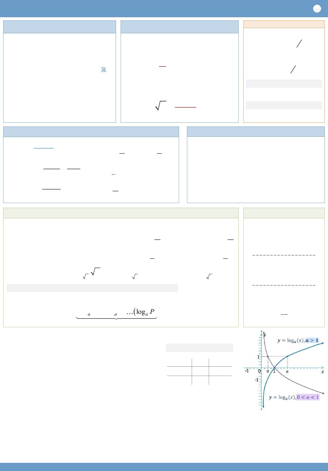 L O G A R I T M O S 1.2 M a t h C h e a t S h e e t 3 c o n 1 4 . c o m Propiedades log log log log log log log log log log a a a a a a n a a n a a P Q P Q P P Q Q P n N P P n ① ② ③ ④ Y se lee logaritmo en base a de x log ya x y a x 0 1 ; 0 ;a a x y DEFINICIÓN De la definición deducimos que: El logaritmo de un número es un exponente, y solo eso. log a x a x Equivalencias Observaciones El cero no tiene logaritmo: Los números negativos no tienen logaritmo: log 0a loga k ; 0k Logaritmos decimales 10log logN N Logaritmos neperianos log lne N N log 2 0,3010 log3 0,4771 log 0,4343 ln 2 0,6931 ln3 1,0986 ln10 2,3026 log 0,4343 ln ln 2,3026 log 10 log5 log 1 log 2 2 e N N N N Igualdades 0 1 log 1 0 1 log 1 log log log logn n a a n a nn a a a pues pues a a a a a n P P P log log ; log 1 1 log log ; log log log ; log n n n n n n m m aa a aa a aa a m m P P a n n P P a n n P n P a n De la definición de logaritmo y de sus propiedades deducimos las siguientes igualdades: " "log log log log log log log log log logb c d nn a a a a a n v e eces e regla de la cadenab c d P P a a P P P Otras relaciones: CAMBIO DE BASE log ln log l log log og ln 1 log log log a a P b a b N N N a a a N P a N 1 log log log log 1 log log log a a a a P Q Q P P P P co P P Antilogaritmo log log ya ax y Anti y x a x 2,1673 10log log 2,1673 10 147 log 2,1673 147también se escribe: Si N N N Anti Ejemplo Los logaritmos fueron introducidos en matemáticas con el propósito de facilitar, simplificar o hacer posible complicados y tediosos cálculos numéricos. Utilizando logaritmos podemos convertir productos en sumas, cocientes en restas, potencias en productos y raíces en cocientes. El método de cálculo mediante logaritmos aparece en el siglo XVII gracias a los trabajos independientes de Neper y Bürgi. Los logaritmos se emplearon habitualmente en astronomía, geodesia, navegación marítima y matemática. APLICACIONES: Geología: escala Richter; Química: cálculo de pH; Arqueología: velocidad desintegración del C14; Física: intensidad sonora; Medicina: concentración de alcohol en sangre, etc... Hasta la llegada de las calculadoras y los ordenadores los logaritmos fueron muy utilizados por científicos, ingenieros, para realizar operaciones más fácil y rápidamente, usando reglas de cálculo y tablas de logaritmos. La constante a es un número real positivo distinto de 1 y se denomina base del sistema de logaritmos. El número N debe ser un número real positivo El exponente b puede ser cualquier número real SIGNO 1 0 1 1 0 1 logaritmos a a N N Forma Logarítmica Forma Exponencial Es decir, la operación de logaritmación ( extracción de logaritmos o tomar logaritmos ) es siempre posible en el campo real cuando tanto la base a como el número N son positivos. La base puede ser cualquier número pero las más frecuentes son la base 10 (logaritmos decimales) y la base e (logaritmos neperianos) y lo habitual es no escribir la base. card_logaritmos3.vsdx Página-1