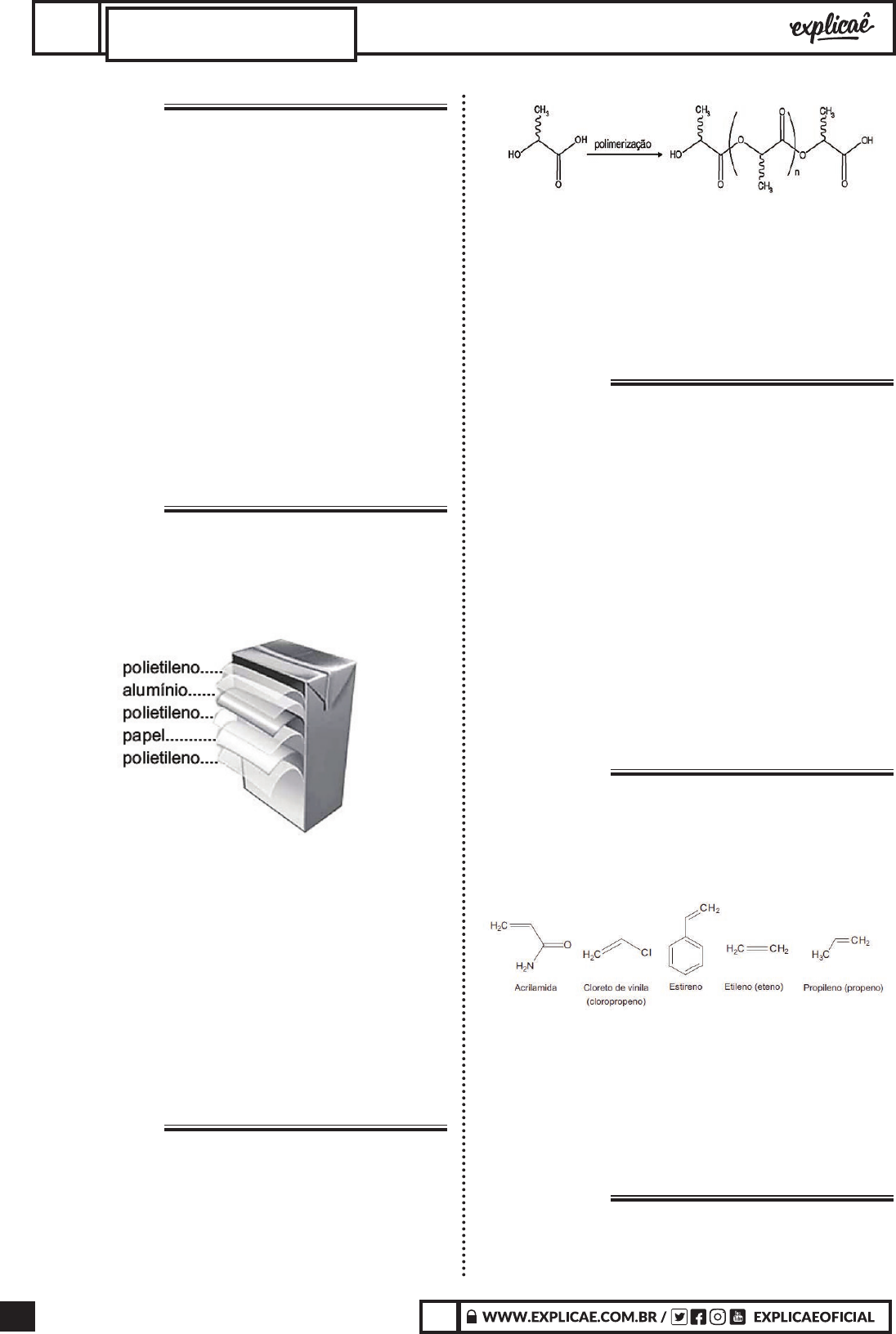 308 X X CIÊNCIAS DA NATUREZA E SUAS TECNOLOGIASQUÍMICA QUESTÃO 09 (ENEM 2014 3ª APLICAÇÃO) Alguns materiais poliméricos não podem ser utilizados para a produção de certos tipos de artefatos, seja por limitações das propriedades mecânicas, seja pela facilidade com que sofrem degradação, gerando subprodutos indesejáveis para aquela aplicação. Torna-se importante, então, a fi scalização, para determinar a natureza do polímero utilizado na fabricação do artefato. Um dos métodos possíveis baseia-se na decomposição do polímero para a geração dos monômeros que lhe deram origem. A decomposição controlada de um artefato gerou a diamina H 2 N(CH 2 ) 6 NH 2 e o diácido HO 2 C(CH 2 ) 4 CO 2 H. Logo, o artefato era feito de: A. polipropileno. B. poliamida. C. poliéster. D. poliacrilato. E. polietileno. QUESTÃO 10 (ENEM 2015 2ª APLICAÇÃO) A fi gura representa uma embalagem cartonada e sua constituição em multicamadas. De acordo com as orientações do fabricante, essas embalagens não devem ser utilizadas em fornos micro-ondas. NASCIMENTO, R. M. M. et al. Embalagem cartonada longa vida: lixo ou luxo? Química Nova na Escola, n. 25, maio 2007 (adaptado). A restrição citada deve-se ao fato de a: A. a embalagem aberta se expandir pela pressão do vapor formado em seu interior. B. camada de polietileno se danifi car, colocando o alumínio em contato com o alimento. C. fi na camada de alumínio blindar a radiação, não permitindo que o alimento se aqueça. D. geração de centelhas na camada de alumínio, que pode levar à queima da camada de papel e de polietileno. E. absorção de radiação pelo papel, que se aquece e pode levar à queima da camada de polietileno. QUESTÃO 11 (ENEM 2015 2ª APLICAÇÃO) O poli(ácido lático) ou PLA é um material de interesse tecnológico por ser um polímero biodegradável e bioabsorvível. O ácido lático, um metabólito comum no organismo humano, é a matéria-prima para produção do PLA, de acordo com a equação química simplifi cada: cido d l l ico 1 1 Que tipo de polímero de condensação é formado nessa reação? A. Policarbonato. B. Poliamida. C. Poliuretana. D. Polivinila. E. Poliéster. QUESTÃO 12 (ENEM 2016 2ª APLICAÇÃO) As sacolas plásticas são utilizadas em grande quantidade no Brasil por serem práticas, leves e de baixo custo. Porém, o tempo necessário para que sofram degradação nas condições do meio é de, no mínimo, 100 anos. Com o intuito de reduzir o impacto ambiental desses produtos, as sacolas biodegradáveis foram introduzidas no mercado. Essas sacolas são confeccionadas de um material polimérico que confere a elas uma característica que as torna biodegradáveis. A qual característica das sacolas biodegradáveis o texto faz referência? A. Elevada massa molecular do polímero. B. Espessura fi na do material que as constitui. C. Baixa resistência aos líquidos nas condições de uso. D. Baixa resistência ao ataque por microrganismos em condições adequadas. E. Ausência de anéis aromáticos na estrutura do polímero usado na confecção das sacolas. QUESTÃO 13 (ENEM 2017 2ª APLICAÇÃO) Os polímeros são materiais amplamente utilizados na sociedade moderna, alguns deles na fabricação de embalagens e fi lmes plásticos, por exemplo. Na fi gura estão relacionadas as estruturas de alguns monômeros usados na produção de polímeros de adição comuns. Dentre os homopolímeros formados a partir dosmonômereos da fi gura, aquele que apresenta solubilidade em água é: A. polietileno. B. poliestireno. C. polipropileno. D. poliacrilamida. E. policloreto de vinila. QUESTÃO 14 (ENEM 2015 2ª APLICAÇÃO) O Nylon® é um polímero (uma poliamida) obtido pela reação do á cido adípico com a hexametilenodiamina, como indicado no esquema reacional. 309X X CIÊNCIAS DA NATUREZA E SUAS TECNOLOGIASQUÍMICA Na época da invenção desse composto, foi proposta uma nomenclatura comercial, baseada no número de átomos de carbono do diácido carboxílico, seguido do número de carbonos da diamina. De acordo com as informações do texto, o nome comercial de uma poliamida resultante da reação do ácido butanodioico com o 1,2-diamino-etano é: A. Nylon 6,2. B. Nylon 4,2. C. Nylon 3,4. D. Nylon 2,6. E. Nylon 4,3. X A U L A S 05 APOSTILAS: TEORIA + 68 QUESTÕES CAIU NO ENEM: 08 | EXERCÍCIOS ONLINE: 30 3 QUÍMICA ORGÂNICA 3.8 BIOQUÍMICA QUESTÃO 01 (ENEM 2009 CANCELADO) Sabe-se que a ingestão frequente de lipídios contendo ácidos graxos (ácidos monocarboxílicos alifáticos) de cadeia carbônica insaturada com isomeria trans apresenta maior risco para o desenvolvimento de doenças cardiovasculares, sendo que isso não se observa com os isômeros cis. Dentre os critérios seguintes, o mais adequado à escolha de um produto alimentar saudável contendo lipídios é: A. Se contiver polihidroxialdeídos ligados covalentemente entre si, por ligações simples, esses compostos devem apresentar estrutura linear. B. Se contiver lipídios com duplas ligações entre os carbonos, os ligantes de maior massa devem estar do mesmo lado da cadeia. C. Se contiver bases nitrogenadas, estas devem estar ligadas a uma ribose e a um aminoácido. D. Se estiverem presentes compostos com ligações peptídicas entre os aminoácidos, os grupos amino devem ser esterifi cados. E. Se contiver sais, estes devem ser de bromo ou de fl úor, pois são essas as formas mais frequentes nos lipídios cis. QUESTÃO 02 (ENEM 2013 2ª APLICAÇÃO) A qualidade de óleos de cozinha, compostos principalmente por moléculas de ácidos graxos, pode ser medida pelo índice de iodo. Quanto maior o grau de insaturação da molécula, maior o índice de iodo determinado e melhor a qualidade do óleo. Na fi gura, são apresentados alguns compostos que podem estar presentes em diferentes óleos de cozinha: Dentre os compostos apresentados, os dois que proporcionam melhor qualidade para os óleos de cozinha são os ácidos: A. este