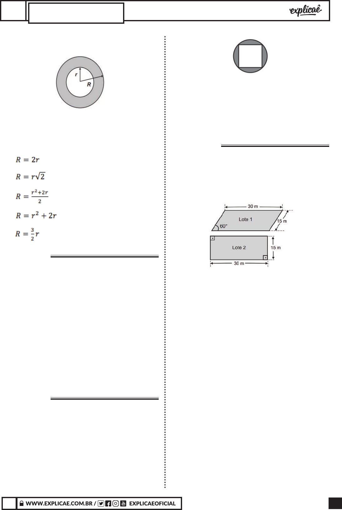 551X X MATEMÁTICA E SUAS TECNOLOGIASMATEMÁTICA canteiro será constituído de uma área central e de uma faixa circular ao seu redor, conforme ilustra a fi gura. Deseja-se que a área central seja igual à área da faixa circular sombreada. A relação entre os raios do canteiro R e da área central r deverá ser A B C D E QUESTÃO 49 (ENEM 2016 3ª APLICAÇÃO) Tradicionalmente uma pizza média de formato circular tem diâmetro de 30 cm e é dividida em 8 fatias iguais (mesma área). Uma família, ao se reunir para o jantar, fará uma pizza de formato circular e pretende dividi-Ia em 10 fatias também iguais. Entretanto, eles desejam que cada fatia dessa pizza tenha o mesmo tamanho (mesma área) de cada fatia da pizza média quando dividida em 8 fatias iguais. Qual o valor mais próximo do raio com que deve ser feita a pizza, em centímetro, para que eles consigam dividi-Ia da forma pretendida? Use 2,2 como aproximação para √5. A. 15,00 B. 16,50 C. 18,75 D. 33,00 E. 37,50 QUESTÃO 50 (ENEM 2016 3ª APLICAÇÃO) Um arquiteto deseja construir um jardim circular de 20 m de diâmetro. Nesse jardim, uma parte do terreno será reservada para pedras ornamentais. Essa parte terá a forma de um quadrado inscrito na circunferência, como mostrado na fi gura. Na parte compreendida entre o contorno da circunferência e a parte externa ao quadrado, será colocada terra vegetal. Nessa parte do jardim, serão usados 15 kg de terra para cada m2. A terra vegetal é comercializada em sacos com exatos 15 kg cada. Use 3 como valor aproximado para π. O número mínimo de sacos de terra vegetal necessários para cobrir a parte descrita do jardim é A. 100. B. 140. C. 200. D. 800. E. 1 000. QUESTÃO 51 (ENEM 2016 3ª APLICAÇÃO) Um casal e seus dois fi lhos saíram, com um corretor de imóveis, com a intenção de comprar um lote onde futuramente construiriam sua residência. No projeto da casa, que esta família tem em mente, irão necessitar de uma área de pelo menos 400 m2. Após algumas avaliações, fi caram de decidir entre os lotes 1 e 2 da fi gura, em forma de paralelogramos, cujos preços são R$ 100 000,00 e R$ 150 000,00, respectivamente. Use √3/2, 1/2 , e 1,7 como aproximações,respectivamente, para sen(60°), cos(60°) e √3 Para colaborarem na decisão, os envolvidos fi zeram as seguintes argumentações: • Pai: Devemos comprar o Lote 1, pois como uma de suas diagonais é maior do que as diagonais do Lote 2, o Lote 1 também terá maior área; • Mãe: Se desconsiderarmos os preços, poderemos comprar qualquer lote para executar nosso projeto, pois tendo ambos o mesmo perímetro, terão também a mesma área; • Filho 1: Devemos comprar o Lote 2, pois é o único que tem área sufi ciente para a execução do projeto; • Filho 2: Devemos comprar o Lote 1, pois como os dois lotes possuem lados de mesma medida, terão também a mesma área, porém o Lote 1 é mais barato; • Corretor: Vocês devem comprar o Lote 2, pois é o que tem menor custo por metro quadrado. A pessoa que argumentou corretamente para a compra do terreno foi o(a) A. pai. B. mãe. C. fi lho 1. D. fi lho 2. E. corretor. Importante: Esse arquivo digital pertence ao CPF: 706.034.921-93. Proibida a reprodução e o compartilhamento 552 X X MATEMÁTICA E SUAS TECNOLOGIASMATEMÁTICA QUESTÃO 52 (ENEM 2017 2ª APLICAÇÃO) A fi gura traz o esboço da planta baixa de uma residência. Algumas medidas internas dos cômodos estão indicadas. A espessura de cada parede externa da casa é 0,20 m e das paredes internas, 0,10 m. Sabe-se que, nas localidade onde se encontra esse imóvel, o Imposto Predial Territorial Urbano (IPTU) é calculado conforme a área construída da residência. Nesse cálculo, são cobradas R$ 4,00 por cada metro quadrado de área construída. O valor do IPTU desse imóvel, em real, é: A. 250,00. B. 250,80. C. 258,64. D. 276,48. E. 286,00. QUESTÃO 53 (ENEM 2017 2ª APLICAÇÃO)Um fabricante recomenda que,para cada m2 do ambiente a ser climatizado, são necessários 800 BTUh, desde que haja até duas pessoas no ambiente. A esse número devem ser acrescentados 600 BTUh para cada pessoa a mais, e também para cada aparelho eletrônico emissor de calor no ambiente. A seguir encontram-se as cinco opções de aparelhos desse fabricante e suas respectivas capacidades térmicas: • Tipo l: 10500 BTUh • Tipo ll: 11000 BTUh • Tipo lll: 11500 BTUh • Tipo lV: 12000 BTUh • Tipo V: 12500 BTUh O supervisor de um laboratório precisa comprar um aparelho para climatizar o ambiente. Nele fi carão duas pessoas mais uma centrífuga que emite calor. O laboratório tem forma de trapézio retângulo,com as medidas apresentadas na fi gura. Para economizar energia,o supervisor deverá escolher o aparelho de menor capacidade térmica que atenda às necessidades do laboratório e às recomendações do fabricante. A escolha do supervisor recairá sobre o aparelho do tipo A. l. B. ll. C. lll. D. lV. E. V. QUESTÃO 54 (ENEM 2017 LIBRAS) Uma empresa de manutenção de jardins foi contratada para plantar grama em um campo de futebol retangular cujas dimensões são 70 m x 100 m. A grama que será utilizada é vendida em tapetes retangulares de dimensões 40 cm x 125 cm. Quantos tapetes de grama, no mínimo, serão necessários para cobrir todo o campo de futebol? A. 103 B. 140 C. 7.000 D. 10.303 E. 14.000 QUESTÃO 55 (ENEM 2017 LIBRAS) Em uma plataforma de exploração de petróleo, localizada no mar, ocorreu um vazamento. A equipe técnica de operação dessa plataforma percebeu que a mancha de óleo espalhado na superfície do mar tinha formato circular e estimou, visualmente, que a área atingida era de aproximadamente 100 km2. Utilize 3 como aproximação para π. O valor inteiro mais próximo do raio da mancha de óleo formada, em km, é A. 4 B. 6 C. 10 D. 17 E. 33 QUESTÃO 56 (ENEM 2017 LIBRAS) Uma família possui um terreno retangular com 18 metros de largura e 24 metros de comprimento. Foi necessário demarca