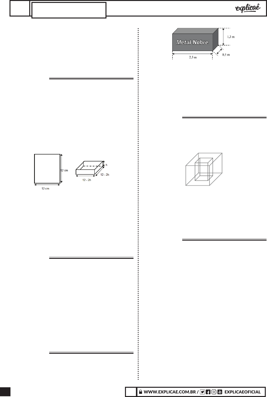 566 X X MATEMÁTICA E SUAS TECNOLOGIASMATEMÁTICA A fração que expressa a relação entre os volumes dos cubos maior e menor é A. 1/16 B. 1/2. C. 1/64. D. 1/8. E. 1/4. QUESTÃO 16 (ENEM 2009 2ª APLICAÇÃO) Muitas indústrias têm procurado modificar as embalagens de seus produtos de forma a economizar material, mas mantendo o mesmo volume. Considere que se tenha uma folha de papelão quadrada e se deseje encontrar a melhor altura (h) para fazer uma caixa sem tampa, cortando-se os quatro cantos da folha. As exigências são que as dimensões da caixa sejam números inteiros e que o volume seja o maior possível. No modelo apresentado na figura seguinte, a folha tem 12 cm de lado e, nesse caso, a caixa de maior volume terá altura 2 cm. Para encontrar esse número, é calculado o volume em função da altura e prossegue-se atribuindo valores a h e calculando o volume, enquanto o valor do volume aumentar. Se a folha quadrada tiver 20 cm de lado, qual deve ser a medida do lado do quadrado a ser cortado em cada um dos cantos, de modo a obter uma caixa sem tampa cujas dimensões sejam números inteiros e cujo volume seja o maior possível? A. 6 cm B. 4 cm C. 3 cm D. 5 cm E. 2 cm QUESTÃO 17 (ENEM 2010 1ª APLICAÇÃO) Uma fábrica produz barras de chocolates no formato de paralelepípedos e de cubos, com o mesmo volume. As arestas da barra de chocolate no formato de paralelepípedo medem 3 cm de largura, 18 cm de comprimento e 4 cm de espessura. Analisando as características das figuras geométricas descritas, a medida das arestas dos chocolates que têm o formato de cubo é igual a A. 5 cm. B. 24 cm. C. 12 cm. D. 6 cm. E. 25 cm. QUESTÃO 18 (ENEM 2010 1ª APLICAÇÃO) A siderúrgica “Metal Nobre” produz diversos objetos maciços utilizando o ferro. Um tipo especial de peça feita nessa companhia tem o formato de um paralelepípedo retangular, de acordo com O produto das três dimensões indicadas na peça resultaria na medida da grandeza A. volume. B. massa. C. superfície. D. capacidade. E. comprimento. QUESTÃO 19 (ENEM 2010 1ª APLICAÇÃO) Um porta-lápis de madeira foi construído no formato cúbico, seguindo o modelo ilustrado a seguir. O cubo de dentro é vazio. A aresta do cubo maior mede 12 cm e a do cubo menor, que é interno, mede 8 cm. O volume de madeira utilizado na confecção desse objeto foi A. 64 cm3. B. 1216 cm3. C. 12 cm3. D. 1728 cm3. E. 96 cm3. QUESTÃO 20 (ENEM 2012 1ª APLICAÇÃO) A cerâmica possui a propriedade da contração, que consiste na evaporação da água existente em um conjunto ou bloco cerâmico submetido a uma determinada temperatura elevada: em seu lugar aparecendo “espaços vazios” que tendem a se aproximar. No lugar antes ocupado pela água vão ficando lacunas e, consequentemente, o conjunto tende a retrair-se. Considere que no processo de cozimento a cerâmica de argila sofra uma contração, em dimensões lineares, de 20%. www.arq.ufsc.br. Levando em consideração o processo de cozimento e a contração sofrida, o volume V de uma travessa de argila, de forma cúbica de aresta a, diminui para um valor que é A. 48,8% menor que V, porque o volume diminui de a3 para (0,8a)3. B. 51,2% menor que V, porque cada lado diminui para 80% do comprimento original. C. 36% menor que V, porque a área da base diminui de a2 para [(1 − 0,2)a]2. D. 60% menor que V, porque cada lado diminui 20%. E. 20% menor que V, uma vez que o volume do cubo é diretamente proporcional ao comprimento de seu lado. 567X X MATEMÁTICA E SUAS TECNOLOGIASMATEMÁTICA QUESTÃO 21 (ENEM 2012 1ª APLICAÇÃO) Alguns objetos, durante a sua fabricação, necessitam passar por um processo de resfriamento. Para que isso ocorra, uma fábrica utiliza um tanque de resfriamento, como mostrado na fi gura. O que aconteceria com o nível da água se colocássemos no tanque um objeto cujo volume fosse de 2 400 cm3? A. O nível subiria 20 cm, fazendo a água transbordar. B. O nível subiria 0,2 cm, fazendo a água fi car com 20,2 cm de altura. C. O nível subiria 1 cm, fazendo a água fi car com 21 cm de altura. D. O nível subiria 2 cm, fazendo a água fi car com 22 cm de altura. E. O nível subiria 8 cm, fazendo a água transbordar. QUESTÃO 22 (ENEM 2014 1ª APLICAÇÃO) Na alimentação de gado de corte, o processo de cortar a forragem, colocá-la no solo, compactá-la e protegê-la com uma vedação denomina-se silagem. Os silos mais comuns são os horizontais, cuja forma é a de um prisma reto trapezoidal, conforme mostrado na fi gura. Considere um silo de 2 m de altura, 6 m de largura de topo e 20 m de comprimento. Para cada metro de altura do silo, a largura do topo tem 0,5 m a mais do que a largura do fundo. Após a silagem, 1 tonelada de forragem ocupa 2 m³ desse tipo de silo. EMBRAPA. Gado de corte. Disponível em: www.cnpgc.embrapa.br. Após a silagem, a quantidade máxima de forragem que cabe no silo, em toneladas, é A. 130. B. 125. C. 260. D. 110. E. 220. QUESTÃO 23 (ENEM 2014 1ª APLICAÇÃO) Uma lata de tinta, com a forma de um paralelepípedo retangular reto, tem as dimensões, em centímetros, mostradas na fi gura. Será produzida uma nova lata, com os mesmos formato e volume, de tal modo que as dimensões de sua base sejam 25% maiores que as da lata atual. Para obter a altura da nova lata, a altura da lata atual deve ser reduzida em A. 64,0% B. 36,0% C. 14,4% D. 20,0% E. 32,0% QUESTÃO 24 (ENEM 2014 1ª APLICAÇÃO) Um fazendeiro tem um depósito para armazenar leite formado por duas partes cúbicas que se comunicam, como indicado na fi gura. A aresta da parte cúbica de baixo tem medida igual ao dobro da medida da aresta da parte cúbica de cima. A torneira utilizada para encher o depósito tem vazão constante e levou 8 minutos para encher metade da parte de baixo. Quantos minutos essa torneira levará para encher completamente o restante do depósito? A. 16 B. 18 C. 24 D. 10 E. 8 QUESTÃO 25 (ENEM 2014 2ª APLICAÇÃO) Uma fábrica de rapadura vende seus produto