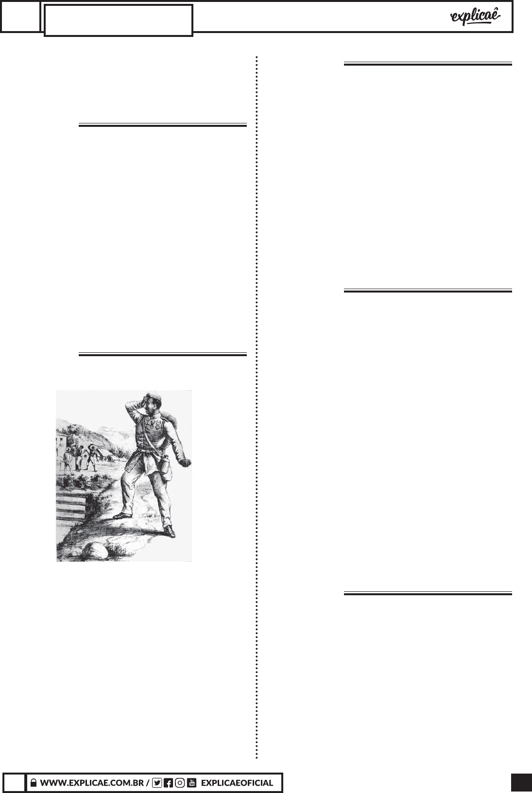 599X X CIÊNCIAS HUMANAS E SUAS TECNOLOGIASHISTÓRIA A. proteger o patrimônio privado. B. capturar os ativistas radicais. C. conservar o exercício do poder. D. salvaguardar o espaço público. E. sustentar o regime democrático. QUESTÃO 21 (ENEM 2014 1ª APLICAÇÃO) Respeitar a diversidade de circunstâncias entre as pequenas sociedades locais que constituem uma mesma nacionalidade, tal deve ser a regra suprema das leis internas de cada Estado. As leis municipais seriam as cartas de cada povoação doadas pela assembleia provincial, alargadas conforme o seu desenvolvimento, alteradas segundo os conselhos da experiência. Então, administrar-se-ia de perto, governar-se-ia de longe, alvo a que jamais se atingirá de outra sorte. BASTOS, T. A província (1870). São Paulo: Cia. Editora Nacional, 1937 (adaptado). O discurso do autor, no período do Segundo Reinado no Brasil, tinha como meta a implantação do: A. regime monárquico representativo. B. poder oligárquico regional. C. modelo territorial federalista. D. padrão político autoritário. E. sistema educacional democrático. QUESTÃO 22 (ENEM 2014 1ª APLICAÇÃO) De volta do Paraguai Cheio de glória, coberto de louros, depois de ter derramado seu sangue em defesa da pátria e libertado um povo da escravidão, o voluntário volta ao seu país natal para ver sua mãe amarrada a um tronco horrível de realidade!... AGOSTINI. A vida uminense, ano 3, n 128, 11 jun. 1870. In: LEMOS, R. (Org.) Uma história do Brasil através da caricatura (1840-2001). Rio de Janeiro: Letras & Expressões, 2001 (adaptado). Na charge, identifica-se uma contradição no retorno de parte dos “Voluntários da Pátria” que lutaram na Guerra do Paraguai (1864-1870), evidenciada na: A. perseguição dos escravistas aos soldados negros. B. suspensão das indenizações aos proprietários prejudicados. C. concessão de alforrias aos militares escravos. D. negação da cidadania aos familiares cativos. E. punição dos feitores aos recrutados compulsoriamente. QUESTÃO 23 (ENEM 2014 2ª APLICAÇÃO) Passada a festa da abolição, os ex-escravos procuraram distanciar-se do passado de escravidão, negando-se a se comportar como antigos cativos. Em diversos engenhos do Nordeste, negaram-se a receber a ração diária e a trabalhar sem remuneração. Quando decidiram ficar, isso não significou que concordassem em se submeter às mesmas condições de trabalho do regime anterior. FRAGA, W.; ALBUQUERQUE, W. R. Uma história da cultura afro-brasileira. São Paulo: Moderna, 2009 (adaptado). Segundo o texto, os primeiros anos após a abolição da escravidão no Brasil tiveram como característica o(a): A. busca pelo reconhecimento do exercício da cidadania. B. caráter organizativo do movimento negro. C. equiparação racial no mercado de trabalho. D. estabelecimento do salário mínimo por projeto legislativo. E. entusiasmo com a extinção das péssimas condições de trabalho. QUESTÃO 24 (ENEM 2014 2ª APLICAÇÃO) Enquanto as rebeliões agitavam o país, as tendências políticas no centro dirigente iam se definindo. Apareciam em germe os dois grandes partidos imperiais — o Conservador e o Liberal. Os conservadores reuniam magistrados, burocratas, uma parte dos proprietários rurais, especialmente do Rio de Janeiro, Bahia e Pernambuco, e os grandes comerciantes, entre os quais muitos portugueses. Os liberais agrupavam a pequena classe média urbana, alguns padres e proprietários rurais de áreas menos tradicionais, sobretudo de São Paulo, Minas e Rio Grande do Sul. FAUSTO, B. História do Brasil. São Paulo: Edusp, 1998 No texto, o autor compara a composição das forças políticas que atuaram no Segundo Reinado (1840-1889).Dois aspectos que caracterizam os partidos Conservador e Liberal estão indicados, respectivamente, em: A. Abolição da escravidão — Adoção do trabalho assalariado. B. Promoção do protecionismo — Remoção das barreiras alfandegárias. C. Preservação do unitarismo — Ampliação da descentralização provincial. D. Implementação do republicanismo — Continuação da monarquia constitucional. E. Difusão da industrialização —Conservação do latifúndio monocultor. QUESTÃO 25 (ENEM 2014 2ª APLICAÇÃO) Os escravos, obviamente, dispunham de poucos recursos políticos, mas não desconheciam o que se passava no mundo dos poderosos. Aproveitaram-se das divisões entre estes, selecionaram temas que lhes interessavam do ideário liberal e anticolonial, traduziram e emprestaram significados próprios às reformas operadas no escravismo brasileiro ao longo do século XIX. REIS, J. J. Nos achamos em campo a tratar da liberdade: a resistência negra no Brasil oitocentista. In: MOTA, C. G. (Org.). Viagem incompleta: a experiência brasileira (1500- 2000). São Paulo: Senac, 1999 Ao longo do século XIX, os negros escravizados construíram variadas formas para resistir à escravidão no Brasil. A estratégia de luta citada no texto baseava-se no aproveitamento das: Importante: Esse arquivo digital pertence ao CPF: 706.034.921-93. Proibida a reprodução e o compartilhamento 600 X X CIÊNCIAS HUMANAS E SUAS TECNOLOGIASHISTÓRIA A. estruturas urbanas como ambiente para escapar do cativeiro. B. ideologias originárias como artifício para resgatar as raízes africanas. C. limitações econômicas como pressão para o fi m do escravismo. D. contradições políticas como brecha para a conquista da liberdade. E. dimensões territoriais como elemento para facilitar as fugas. QUESTÃO 26 (ENEM 2014 3ª APLICAÇÃO) A imagem está relacionada a situação social dos negros no Brasil após a abolição da escravidão, em 13 de maio de 1888, é refl exo de: A. um ato da Princesa Isabel, que resultou no fi m de mais de três séculos de escravidão e possibilitou uma vida digna aos negros. B. uma lei que ratifi cou a libertação dos escravos, impedindo a difusão do preconceito e da discriminação aos libertos. C. uma lei que libert