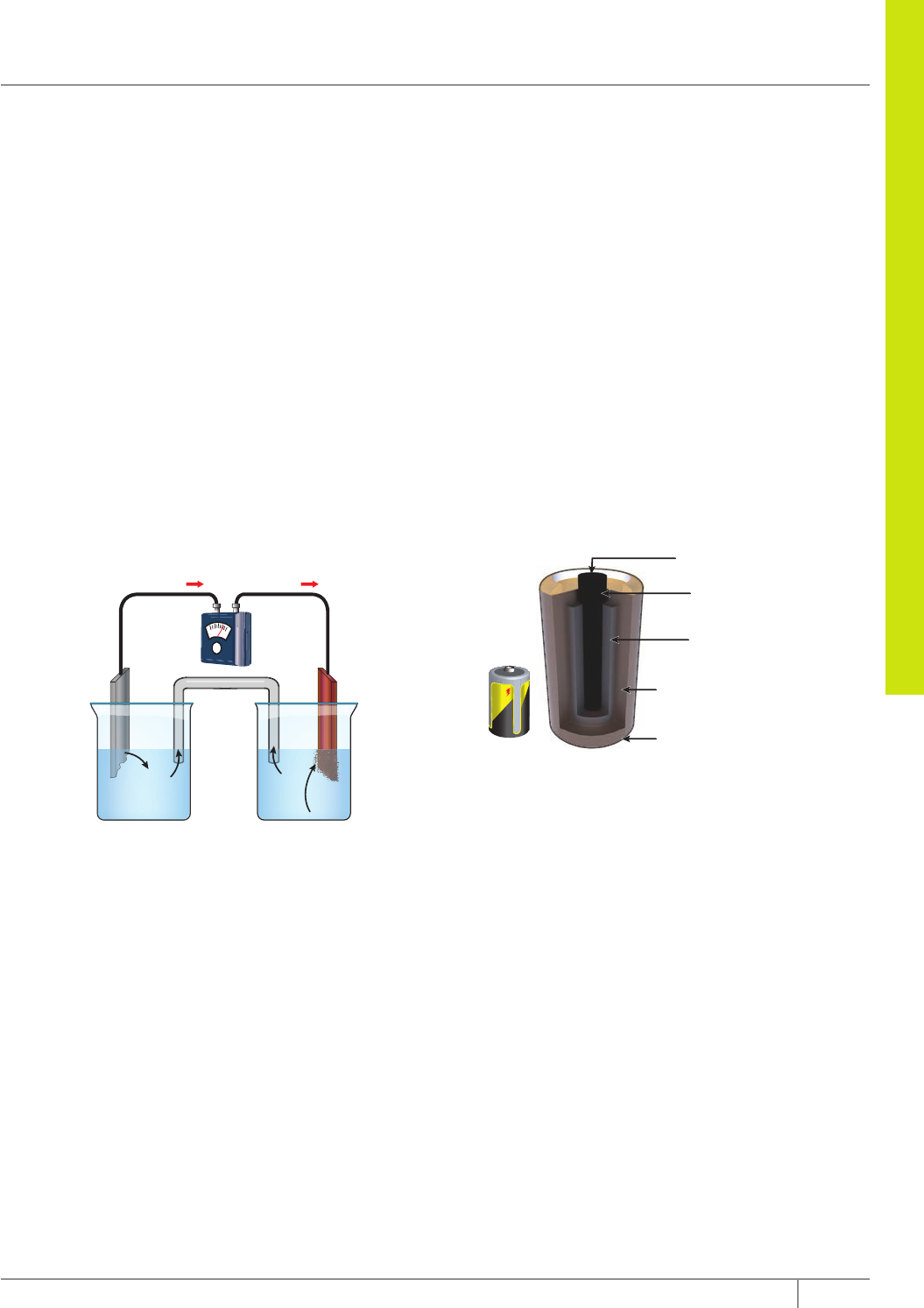 Pilhas 31Editora Bernoulli Q U ÍM IC A A. Descarga: Cu2+(aq) + Zn 0 (s) → Cu 0 (s) + Zn 2+ (aq) ∆Eº = +1,10 V ⇒ espontâneo B. Carga: Cu0(s) + Zn 2+ (aq) → Cu 2+ (aq) + Zn 0 (s) ∆Eº = –1,10 V ⇒ não espontâneo À medida que a pilha é carregada, a lâmina de zinco recompõe-se, enquanto a de cobre diminui, até voltarem ao normal. PILHA SECA Pilha seca é uma pilha cujas reações são irreversíveis, ou seja, não pode ser recarregada. Quando ocorre uma transformação total dos reagentes, a pilha para de funcionar. A sua constituição é mostrada no esquema a seguir: (Polo +) bastão central de grafita dióxido de manganês ZnC�2(s) + NH4C�(s) + H2O(�) zinco (Polo –) O sistema é formado por uma série de reações muito complexas, porém as mais importantes e que mais contribuem para d.d.p. são: Reação catódica: 2NH4 + (aq) + 2MnO2(s) + 2e – → Mn2O3(s) + 2NH3(aq) + H2O(l) Reação anódica: Zn(s) → Zn 2+ (aq) + 2e – Reação global: 2NH4 + (aq) + 2MnO2(s) + Zn(s) → Mn2O3(s) + 2NH3(aq) + H2O(l) + Zn 2+ (aq) Na verdade, essas pilhas não são totalmente secas, pois, em seu interior, sempre se obtém a pasta NH3 e H2O. Só será obtido um rendimento máximo intercalando-se intervalos de uso e “repouso”, o que favorece a dissolução de NH3(g) em água, diminuindo a resistência interna da pilha. Não agindo dessa forma, pode-se verificar, em alguns casos, vazamentos na pilha. Para evitá-los, deve-se retirá-la no período de “repouso”. Reação anódica: 2Al0(s) → 2Al 3+ (aq) + 6e – Eº = +1,67 V Reação catódica: 3Cu2+(aq) + 6e – → 3Cu0(s) Eº = +0,34 V Reação global: 2Al 0(s) + 3Cu 2+ (aq) → 2Al 3+ (aq) + 3Cu 0 (s) ∆Eº = +2,01 V OBSERVAÇÕES 1. Multiplica-se a equação anódica por 2 e a equação catódica por 3, para que o número de elétrons perdidos seja igual ao número de elétrons recebidos no processo. Apesar disso, o Eº permanece constante, pois não depende do número total de elétrons, mas sim do número de elétrons para um único íon, o que não foi alterado. 2. Essa pilha possui maior rendimento do que a pilha de Daniell, 2,01 V. semicela A semicela B elétrons elétrons Cu0A�0 A�3+ A�3+ A�3+SO4 2– Cu2+ SO4 2–SO4 2– SO4 2– Estabelecimento de equilíbrio durante o funcionamento da pilha entre cobre e alumínio. Representação: Al0 / Al3+ (1 mol.L–1) // Cu2+ (1 mol.L–1) / Cu0 (25 ºC) CARGA E DESCARGA EM UMA PILHA Com o passar do tempo, há um desgaste do ânodo da pilha, o que significa que ela está se descarregando. Quando as reações da pilha são reversíveis, pode-se recarregá-la. Isso é feito ligando-se um gerador ao circuito externo, com d.d.p. superior à da pilha. O gerador “força” os elétrons a retornarem ao ânodo, logo o processo é não espontâneo (∆Eº < 0). Para a pilha de Daniell, tem-se: 32 Coleção Estudo Frente B Módulo 10 PILHAS ALCALINAS São pilhas semelhantes às secas, alterando somente a substância que está impregnada na pasta externa, que, no caso da pilha alcalina, é o KOH e não NH4Cl. As pilhas alcalinas apresentam rendimento muito superior ao das pilhas secas comuns. A pilha alcalina mais comum é a de níquel-cádmio. Essas pilhas podem ser recarregadas até 4 000 vezes. A reação que ocorre é Cd(s) + 2Ni(OH)3(s) KOH solução CdO(s) + 2Ni(OH)2(s) + H2O(l) Outra pilha alcalina muito utilizada é a pilha de mercúrio-zinco que, normalmente, é produzida em pequeno tamanho e utilizada em relógios digitais, aparelhos para surdez, etc. Ela funciona segundo a reação Zn(s) + HgO(s) KOH pastoso ZnO(s) + Hg(l) BATERIA DE AUTOMÓVEL OU ACUMULADOR DE CHUMBO A bateria de automóvel é uma associação de pilhas em série. Normalmente, são associadas 6 pilhas de 2 V, logo a bateria fornecerá 12 V. As reações que ocorrem durante o processo são: Reação catódica: PbO2(s) + SO4 2– (aq) + 4H + (aq) + 2e – PbSO4(s) + 2H2O(l) Reação anódica: Pb(s) + SO4 2– (aq) PbSO4(s) + 2e – Reação global: PbO2(s) + 2H2SO4(aq) + Pb(s) 2PbSO4(s) + 2H2O(l) OBSERVAÇÕES 1. Pb, PbO2 e PbSO4 são sólidos e o ∆Eº do acumulador depende da concentração de H2SO4. Assim, é sempre bom manter constante o volume de água. 2. O ácido sulfúrico não deve ser substituído por outro ácido, senão o sal formado seria solúvel, além do fato de que outro ácido poderia corroer as placas. 3. O ácido sulfúrico vai sendo consumido e é por isso que, na prática, testa-se a carga da bateria medindo-se a densidade do ácido. Essas reações são reversíveis. Em um automóvel, o alternador ou dínamo é o responsável pela recarga contínua da bateria, o que prolonga muito a sua vida útil. EXERCÍCIOS DE FIXAÇÃO 01. (UFMG) Estes gráficos apresentam os potenciais de redução do zinco e do cobre, medidos em relação ao eletrodo padrão de hidrogênio, em função das concentrações dos íons metálicos presentes nas soluções: 0,0 0,1 0,2 0,3 0,4 0,5 0,6 0,7 0,8 0,9 1,0 –0,83 –0,84 –0,85 –0,86 –0,87 Concentração / mol.L–1 Po te n ci al d e re d u çã o / V o lt Po te n ci al d e re d u çã o / V o lt Zn2+ + 2e– → Zn –0,88 0,0 0,1 0,2 0,3 0,4 0,5 0,6 0,7 0,8 0,9 1,0 0,26 0,25 0,24 0,23 0,22 0,21 Concentração / mol.L–1 Cu2+ + 2e– → Cu Uma pilha eletroquímica foi montada com placas de cobre e zinco e soluções aquosas dos respectivos sulfatos. 1. Considerando as informações contidas nos gráficos, ESCREVA a equação balanceada da reação espontânea dessa pilha. 2. Neste desenho, estão representados a pilha e o fluxo de elétrons – da direita para a esquerda – no fio metálico: direção do fluxo de elétrons amperímetro fio metálico ponte salina B A D C Considerando as informações contidas nesse desenho, IDENTIFIQUE, no quadro, os metais e as soluções constituintes da pilha, indicados com as letras A, B, C e D. 3. Utilizando dados dos gráficos, CALCULE a força eletromotriz medida nessa pilha, caso as