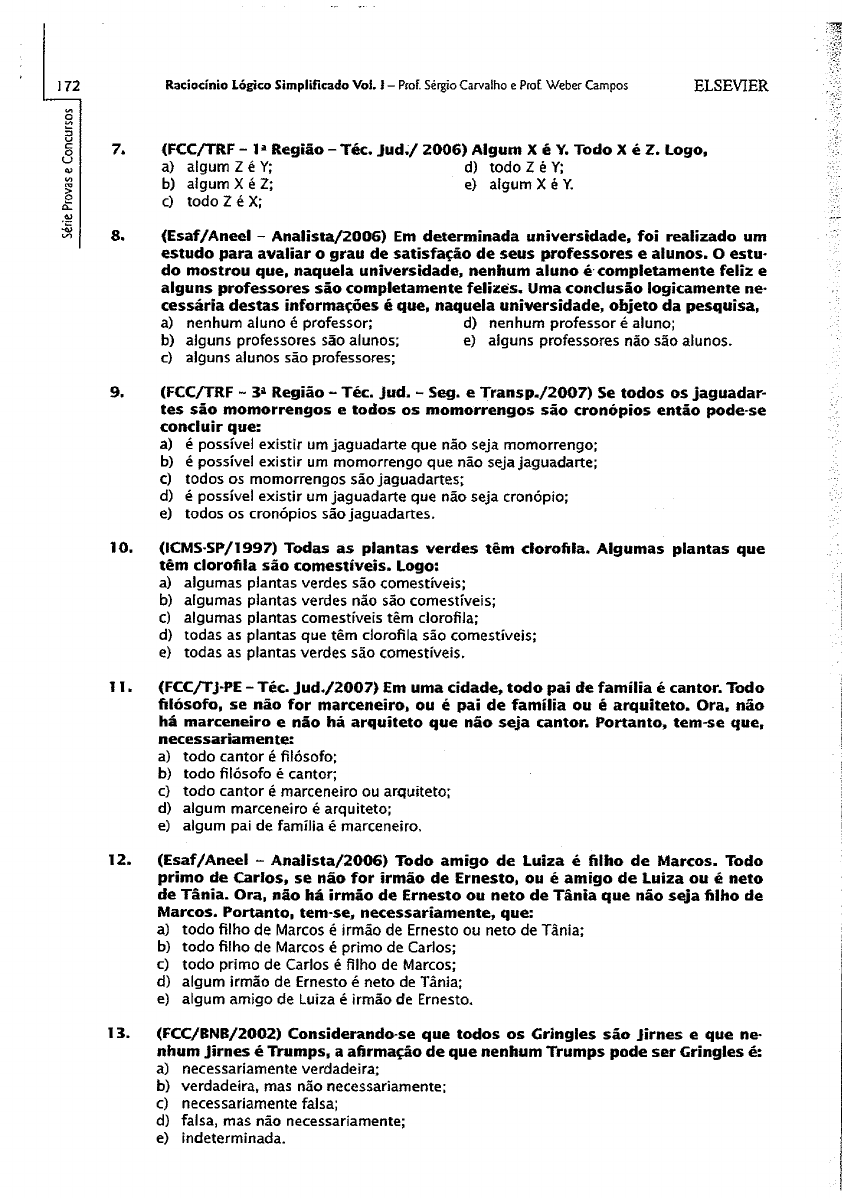 Sé rie Pr ov as e C on cu rs os 172 Raciocínio Lógico Simplificado Voi. I - Prof. Sérgio Carvalho e Prof. Weber Campos ELSEVIER 7. (FCC/TRF - I a Região - Téc, Jud./ 2006) Algum X é Y. Todo X é Z, Logo, a) algum Z é Y; d) todo Z é Y; b) algum X é Z; e) algum X é Y. c) todo Z é X; 8. (Esaf/Aneel - Analista/2006) Em determinada universidade, foi realizado um estudo para avaliar o grau de satisfação de seus professores e alunos. O estu do mostrou que, naquela universidade, nenhum aluno é completamente feliz e alguns professores são completamente felizes. Uma conclusão logicamente ne cessária destas informações é que, naquela universidade, objeto da pesquisa, a) nenhum aluno é professor; d) nenhum professor é aluno; b) alguns professores são alunos; e) aiguns professores não são alunos. c) alguns alunos são professores; 9. (FCC/TRF - 3a Região - Téc. Jud. - Seg. e Transp./2007) Se todos os jaguadar- tes são momorrengos e todos os momorrengos são cronópios então pode-se concluir que: a) é possível existir um jaguadarte que não seja momorrengo; b) é possível existir um momorrengo que não seja jaguadarte; c) todos os momorrengos são jaguadartes; d) é possível existir um jaguadarte que não seja cronópio; e) todos os cronópios são jaguadartes. 10. (ICMS-SP/1997) Todas as plantas verdes têm clorofila. Algum as plantas que têm clorofila são comestíveis. Logo: a) algumas plantas verdes são comestíveis; b) algumas plantas verdes não são comestíveis; c) algumas plantas comestíveis têm clorofila; d) todas as plantas que têm clorofila são comestíveis; e) todas as plantas verdes são comestíveis. 11. (FCC/Tj-PE - Téc. Jud./2007) Em uma cidade, todo pai de família é cantor. Todo filósofo, se não for marceneiro, ou é pai de família ou é arquiteto. Ora, não há marceneiro e não há arquiteto que não seja cantor. Portanto, tem-se que, necessariamente: a) todo cantor é filósofo; b) todo filósofo é cantor; c) todo cantor é marceneiro ou arquiteto; d) algum marceneiro é arquiteto; e) algum pai de família é marceneiro. 12. (Esaf/Aneel - Analista/2006) Todo amigo de Luiza é filho de Marcos. Todo primo de Carlos, se não for irmão de Ernesto, ou é am igo de Luiza ou é neto de Tânia. Ora, não há irmão de Ernesto ou neto de Tânia que não seja filho de Marcos. Portanto, tem-se, necessariamente, que: a) todo filho de Marcos é irmão de Ernesto ou neto de Tânia; b) todo filho de Marcos é primo de Carlos; c) todo primo de Carlos é filho de Marcos; d) algum irmão de Ernesto é neto de Tânia; e) algum amigo de Lui2a é irmão de Ernesto. 13. (FCC/BNB/2002) Considerando-se que todos os Gringles são Jirnes e que ne nhum Jirnes é Trumps, a afirmação de que nenhum Trumps pode ser Gringles é: a) necessariamente verdadeira; b) verdadeira, mas não necessariamente; c) necessariamente falsa; d) falsa, mas não necessariamente; e) indeterminada. CAMPUS Capítulo 3 - Diagramas Lógicos 173 14. (ipad/Agente Polícia Civil-PE/2006) Supondo que todos os cientistas são objeti vos e que alguns filósofos também o são, podemos logicamente concluir que: a) não pode haver cientista filósofo; b) nenhum filósofo é objetivo; c) algum filósofo é cientista; d) se algum filósofo é cientista, então ele é objetivo; e) alguns cientistas não são filósofos. 15. (FCC/TRF - I a Região - Téc. Jud./2007) Todos os macerontes são torminodo- ros. Aiguns macerontes são momorrengos. Logo: a) todos os momorrengos são torminodoros; b) alguns torminodoros são momorrengos; c) todos os torm inodoros são macerontes; d) aiguns momorrengos são pássaros; e) todos os momorrengos são macerontes. 16. (FCC/TRF - 3a Região - Téc. Jud./2007) Algum A é B. Todo A é C Logo: a) algum D é A; d) todo B é A; b) todo B é C; e) algum B é C. c) todo C é A; 17. (FCC/TRF - 1 a Região - Téc. Jud./2007) Partindo das premissas: I. Todo advogado é sagaz. II. Todo advogado é formado em Direito. III. Roberval é sagaz. IV. Sulamita é juíza. Pode-se concluir que: a) Há pessoas formadas em Direito que são sagazes; b) Roberval é advogado; c) Sulamita é sagaz; d) Roberval é promotor; e) Sulamita e Roberval são casados. 1 S. (FCC/Prefeitura Munícípal-SP/2008) Considere as seguintes premissas: i. Todo Físico é inteligente, il. Todo Físico sabe Matemática, lii. Perseu é inteligente. IV. Levi sabe Matemática. E as conclusões: I. Levi é inteligente. II. Perseu é Físico. lii. Existem pessoas que sabem Matemática e são inteligentes. Relativamente a essas conclusões, é correto afirmar que, com certeza, apenas: a) i é verdadeira; d) II é falsa; b) II é verdadeira; e) I é falsa. c) III é verdadeira; 19. (FCC/TRT-PE - Técnico/2006) A s afirmações seguintes são resultados de uma pesquisa feita entre os funcionários de certa empresa. ‘Todo indivíduo que fuma tem bronquite.” ‘Todo indivíduo que tem bronquite costuma faltar ao trabalho.” Relativamente a esses resultados, é correto concluir que: a) existem funcionários fumantes que não faltam ao trabaiho; b) todo funcionário que tem bronquite é fumante; c) todo funcionário fumante costuma faltar ao trabalho; d) é possível que exista algum funcionário que tenha bronquite e não falte habitualmente ao trabalho; e) é possível que exista algum funcionário que seja fumante e não tenha bronquite. Série Provas e C oncursos Sé íie Pr ov as e C on cu rs os 174 Raciocínio Lógico Simplificado Vol. I - Prof. Sérgio Carvalho e Prof. Weber Campos ELSEVIER 20. (FCC/TRE-MS ~ Téc. Jud./2007) Considere que as seguintes afirmações são verdadeiras: “Alguma mulher é vaidosa.” “Toda mulher é inteligente.” Assim sendo, qual das afirmações seguintes é certamente verdadeira? a) Alguma mulher inteligente é vaidosa; b) Alguma mulher vaidosa não é inteligente; c) Alguma mulher não vaidosa não é inteligente; d) Toda mulher inteligente é vaidosa; e) Toda mulher vaido