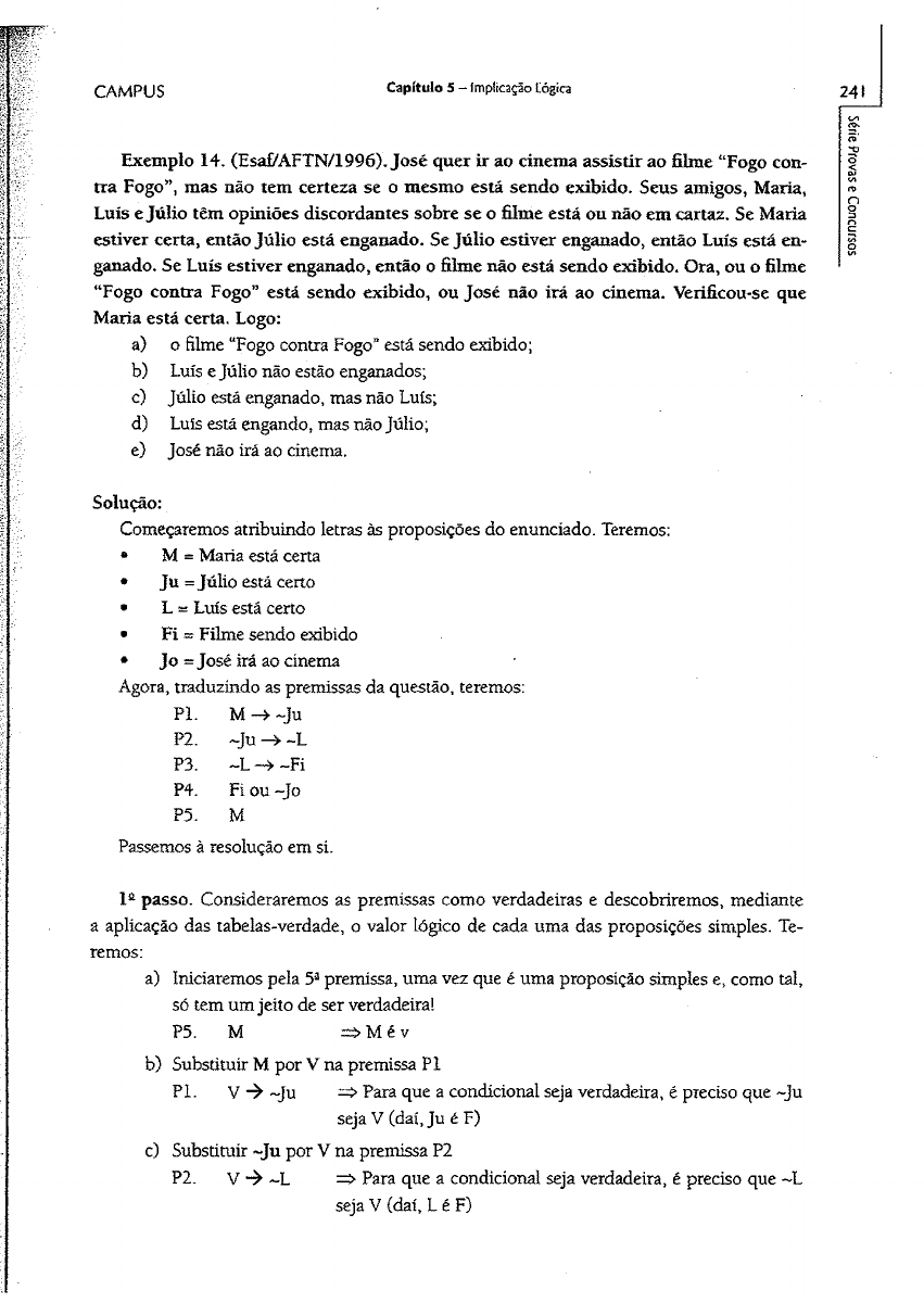 CAMPUS Capítulo 5 - implicação lógica Exemplo 14. (Esaf/AFTN/1996). José quer ir ao cinema assistir ao filme “Fogo con tra Fogo” , mas não tem certeza se o mesmo está sendo exibido. Seus amigos, Maria, Luís e Júlio têm opiniões discordantes sobre se o filme está ou não em cartaz. Se Maria estiver certa, então Júlio está enganado. Se Júlio estiver enganado, então Luís está en ganado. Se Luís estiver enganado, então o filme não está sendo exibido. Ora, ou o filme “Fogo contra Fogo” está sendo exibido, ou José não irá ao cinema. Verificou-se que Maria está certa. Logo: a) o filme “Fogo contra Fogo” está sendo exibido; b) Luís e Júlio não estão enganados; c) Júlio está enganado, mas não Luís; d) Luís está engando, mas não júlio; e) José não irá ao cinema. Solução: Começaremos atribuindo letras às proposições do enunciado. Teremos: * M = Maria está certa * Ju = Júlio está certo * L = Luís estã certo * Fi = Filme sendo exibido * Jo = José irá ao cinema Agora, traduzindo as premissas da questão, teremos: Pl. M - » ~Ju P2. ~Ju ->• ~L P3. ~L ~Fi P4. Fi ou ~Jo P5. M Passemos ã resolução em si. I a passo. Consideraremos as premissas como verdadeiras e descobriremos, mediante a aplicação das tabelas-verdade, o valor lógico de cada uma das proposições simples. Te remos: a) Iniciaremos pela 5a premissa, uma vez que é uma proposição simples e, como tal, só tem um jeito de ser verdadeira! P5. M =S>Mév b) Substituir M por V na premissa Pl Pl. V ~Ju => Para que a condicional seja verdadeira, é preciso que ~ju seja V (daí, Ju é F) c) Substituir -Ju por V na premissa P2 P2. V ~L => Para que a condicional seja verdadeira, é preciso que ~L seja V (daí, L é F) Raciocínio Lógico Simplificado Voi. I - Prof. Sérgio Carvalho e Prof. Weber Campos ELSEVffiR d) Substituir ~L por V na premissa P3 P3. V ~Fi => Para que a condicional seja verdadeira, é preciso que ~Fi seja V (daí, Fi é F) e) Substituir Fi por F na premissa P4 P4. F ou ~Jo => Para que a disjunção seja verdadeira, é preciso que ~jo seja V (daí, Jo é F) Compilando os resultados obtidos acima, teremos: M é V “Maria está certa!” Ju é F -> “Júlio está enganado!” L é F “Luís está enganado!” Fi é F “o filme não está sendo exibido!” Jo é F -> “José não irá ao cinema!” 22 passo. De posse das verdades obtidas acima, analisaremos as opções de resposta. Te remos: a) o filme “Fogo contra Fogo” está sendo exibido; F b) Luís não está enganado e Júlio não está enganado; *■> F c) Júlio estã enganado, e Luís não está enganado; F d) Luís está enganado, e Júlio não está enganado; F e) José não irá ao cinema. V Resposta: Alternativa E. Exemplo 15. (EsafrAFCE - TCU/1999) Se Flávia é filha de Fernanda, então Ana não é filha de Alice. Ou Ana é filha de Alice, ou Ênia é filha de Elisa. Se Paula não é filha de Paulete, então Flávia é filha de Fernanda. Ora, nem Ênia é filha de Elisa nem Inês é filha de Isa. a) Paula é filha de Paulete e Flávia é filha de Fernanda, b Paula é filha de Paulete e Ana é filha de Alice. c) Paula não é filha de Paulete e Ana é filha de Alice. d) Ênia é filha de Elisa ou Flávia é filha de Fernanda. e) Se Ana é filha de Alice, Flávia é filha de Fernanda. Solução: Traduziremos as proposições simples do enunciado para a linguagem simbólica: A: Flávia é filha de Fernanda. B: Ana é filha de Alice. C: Ênia é filha de Elisa. D: Paula é filha de Paulete. E: Inês é filha de Isa. CAMPUS Capítulo S - Implicação Lógica 243 Uma vez definidas tais proposições simples, as premissas do enunciado estarão assim traduzidas: Pl. A - » ~B P2. B ou C P3 _][) a P4. ~C e ~E A premissa P4 foi escrita como ~C e ~E, pois a sentença: “nem Ênia é filha de Elisa nem Inês é filha de Isa.” é equivalente a: “Ênia não é filha de Elisa e ínês nâo é filha de Isa.” Passemos aos passos efetivos de resolução. I a passo. Consideraremos as premissas como verdadeiras e descobriremos, median te a aplicação das tabelas-verdade, o valor lógico de cada uma das proposições simples. Teremos: a) Iniciaremos pela 4a premissa, uma vez que é uma conjunção e, como tal, só tem um jeito de ser verdadeira! P4. ~Ce~E => ~C é V e ~E é V (daí: C é F e E é F) b) Substituir C por F e E por F na premissa P2 P2. B ou F => Para que a disjunção seja verdadeira, é preciso que B seja V c) Substituir B por V (ou ~B por F) na premissa Pl Pl. A F Para que esta condicional seja verdadeira, é preciso que A seja E d) Substituir A por F na premissa P3 P3. -D F => Para que esta condicional seja verdadeira, é preciso que ~D seja F (logo: D é V!) Compilando os resultados obtidos acima, teremos: Bé V “Ana é filha de Alice! D é V => “Paula é filha de Paulete.” C é F —s “Ênia não é filha de Elisa.” Eé F “Inês não é filha de Isa.” A é F —s “Flávia não é filha de Fernanda.” 2a passo. De posse das verdades obtidas acima, analisaremos as opções de resposta. Te remos: V F a) Paula é filha de Paulete e Flávia é filha de Fernanda. F Série Provas e C oncursos