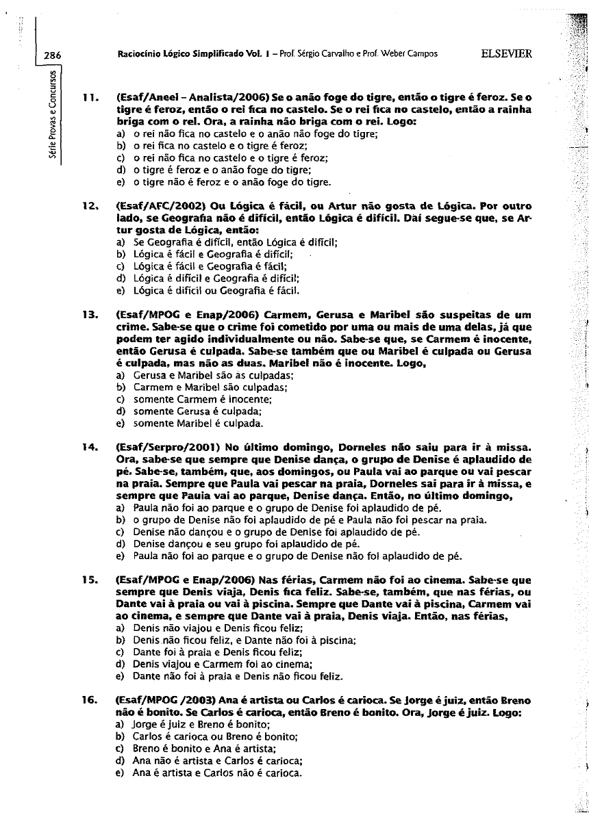 Sé rie Pr ov as e C on cu rs os 286 Raciocínio Lógico Simplificado Vol. f - Prof. Sérgio Carvalho e Prof. Weber Campos ELSEVEER 11. (Esaf/AneeI - Anaiista/2006) Se o anão foge do tigre, então o tigre é feroz. Se o tigre é feroz, então o rei fica no castelo. Se o rei fica no castelo, então a rainha briga com o rel. Ora, a rainha não briga com o rei. togo: a) o rei não fica no castelo e o anão não foge do tigre; b) o rei fica no castelo e o tigre é feroz; c) o rei não fica no castelo e o tigre é feroz; d) o tigre é feroz e o anão foge do tigre; e) o tigre não é feroz e o anão foge do tigre. 12. (Esaf/AFC/2002) Ou Lógica é fácil, ou Artur não gosta de Lógica. Por outro lado, se Geografia não é difícil, então Lógica é difícil. Dàí segue-se que, se Ar tur gosta de Lógica, então: a) Se Geografia é difícil, então Lógica é difícil; b) Lógica é fácil e Geografia é difícil; c) Lógica é fácil e Geografia é facii; d) Lógica é difícil e Geografia é difícil; e) Lógica é difícil ou Geografia é fãciS. 13. (Esaf/MPOG e Enap/2006) Carmem, Gerusa e Maribel são suspeitas de um crime. Sabe-se que o crime foi cometido por uma ou mais de uma delas, já que podem ter agido individualmente ou não. Sabe-se que, se Carmem é inocente, então Gerusa é culpada. Sabe-se também que ou Maribel é culpada ou Gerusa é culpada, mas não as duas. Maribel não é inocente. Logo, a) Gerusa e Maribel são às culpadas; b) Carmem e Maribel são culpadas; c) somente Carmem é inocente; d) somente Gerusa é culpada; e) somente Maribel é culpada. 14. (Esaf/Serpro/2001) No último domingo, Dorneles não saiu para ir à missa. Ora, sabe-se que sempre que Denise dança, o grupo de Denise é aplaudido de pé. Sabe-se, também, que, aos domingos, ou Paula vai ao parque ou vai pescar na praia. Sempre que Paula vai pescar na praia, Dorneles sai para Ir à missa, e sempre que Pauia vai ao parque, Oenise dança. Então, no último domingo, a) Paula não foi ao parque e o grupo de Denise foi aplaudido de pé. b) o grupo de Denise não foi aplaudido de pé e Pauia não fo i pescar na praia. c) Denise não dançou e o grupo de Denise foi aplaudido de pé. d) Denise dançou e seu grupo foi aplaudido de pé. e) Paula não foi ao parque e o grupo de Denise não fo i aplaudido de pé. 15. (Esaf/MPOG e Enap/2006) Nas férias, Carmem não foi ao cinema. Sabe-se que sempre que Denis viaja, Denls fica feliz. Sabe-se, também, que nas férias, ou Dante vai à praia ou vai à piscina. Sempre que Dante vai à piscina, Carmem vai ao cinema, e sempre que Dante vai à praia, Denis viaja. Então, nas férias, a) Denis não viajou e Denis ficou feliz; b) Denis não ficou feliz, e Dante não foi à piscina; c) Dante foi à prata e Denis ficou feliz; d) Denis viajou e Carmem foi ao cinema; e) Dante não fo i à praia e Denis não ficou feliz. 16. (Esaf/MPOG /2003) Ana é artista ou Carlos é carioca. Se Jorge é juiz, então Breno não é bonito. Se Carlos é carioca, então Breno é bonito. Ora, Jorge é juiz. Logo: a) Jorge é ju iz e Breno é bonito; b) Carlos é carioca ou Breno é bonito; c) Breno é bonito e Ana é artista; d) Ana não é artista e Carlos é carioca; e) Ana é artista e Carlos não é carioca. CAMPUS Capítulo 5 - Implicação Lógica 287 17. (Esaf/TCE-RN/2000) Maria é magra ou Bernardo é barrigudo. Se Lúcia é linda, então César não é careca. Se Bernardo é barrigudo, então César é careca. Ora, Lúcia é iinda. Logo: a) Maria é magra e Bernardo não é barrigudo; b) Bernardo é barrigudo ou César é careca; c) César é careca e Maria é magra; d) Maria não é magra e Bernardo é barrigudo; e) Lúcia é linda e César é careca. 18. (Esaf/AFC - CGU/2003-2004) Ana é prima de Bia, ou Carlos é filho de Pedro. Se Jorge é irmão de Maria, então Breno não é neto de Beto. Se Carlos é filho de Pedro, então Breno é neto de Beto. Ora, Jorge é irmão de Maria. Logo: a} Carlos é filho de Pedro ou Breno é neto de Beto; b) Breno é neto de Beto e Ana é prima de Bia; c) Ana não é prima de Bia e Carlos é filho de Pedro; d) Jorge é irmão de Maria e Breno é neto de Beto; e) Ana é prima de Bia e Carlos não é filho de Pedro. 19. (Esaf/AFTN/1998) Há três suspeitos de um crime: o cozinheiro, a governanta e o mordomo. Sabe-se que o crime foi efetivamente cometido por um ou por mais de um deies, já que podem ter agido individualmente ou não. Sabe-se, ainda, que: A) se o cozinheiro é inocente, então a governanta é culpada; B) ou o mordomo é culpado ou a governanta é culpada, mas não os dois; C) o mor domo não é inocente. Logo: a) a governanta e o mordomo são os culpados; b) o cozinheiro e o mordomo são os culpados; c) somente a governanta é culpada; d) somente o cozinheiro é inocente; e) somente o mordomo é culpado. 20. (Esaf/AFC - CGU/2006) Ana é artista ou Carlos é compositor. Se Mauro gosta de música, então Flávia não é fotógrafa. Se Flávia não é fotógrafa, então Car los não é compositor. Ana não é artista e Daniela não fuma. Pode-se, então, concluir corretamente que: a) Ana não é artista e Cartos não é compositor; b) Carlos é compositor e Flávia é fotógrafa; c) Mauro gosta de música e Daniela não fuma; d) Ana não é artista e Mauro gosta de música; e) Mauro não gosta de música e Flávia não é fotógrafa. 21. (Esaf/Serpro/2001) Cícero quer ir ao circo, mas não tem certeza se o circo ainda está na cidade. Suas amigas, Cecília, Célia e Cleusa, têm opiniões discor dantes sobre se o circo está na cidade. Se Cecília estiver certa, então Cleusa está enganada. Se Cleusa estiver enganada, então Célia está enganada. Se Cé lia estiver enganada, então o circo não está na cidade. Ora, ou o circo está na cidade, ou Cícero não irá ao circo. Verificou-se que Cecília está certa. Logo: a) o circo está na cidade; b) Célia e Cleusa não estão enganadas; c) Cleusa está enganada, mas não Célia; 