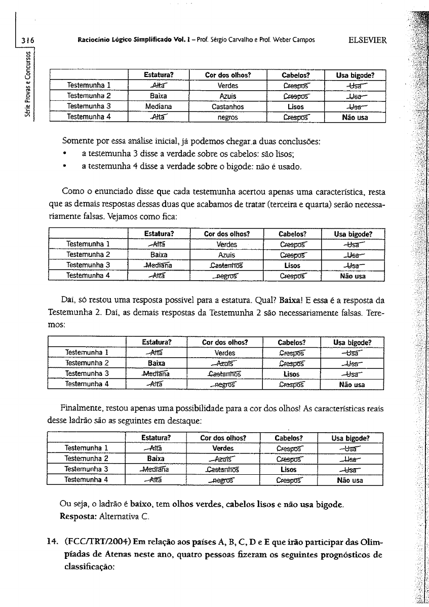 Sé rie Pr ov as e C on cu rs os 316 Raciocínio Lógico Simplificado Vol. I - Prof. Sérgio Carvalho e Prof. Weber Campos ELSEVIER Estatura? Cor dos olhos? Cabelos? Usa bigode? Testemunha 1 .Alter Verdes CíespoT -Usa— Testemunha 2 Baixa Azuis Crespos" JJssr~ Testemunha 3 Mediana Castanhos Usos Testemunha 4 -ART negros CfespOs' Não usa Somente por essa análise inicial, jã podemos chegar.a duas conclusões: • a testemunha 3 disse a verdade sobre os cabelos: são lisos; • a testemunha 4 disse a verdade sobre o bigode: não é usado. Como o enunciado disse que cada testemunha acertou apenas uma característica, resta que as demais respostas dessas duas que acabamos de tratar (terceira e quarta) serão necessa riamente falsas. Vejamos como fica: Estatura? Cor dos olhos? Cabelos? Usa bigode? Testemunha 1 -AttS Verdes C te sp o f 't fs a " Testemunha 2 Baixa Azuis CísspaS' M ea" Testemunha 3 -MedtSna -Cãsteriíiõs Lisos -itea— Testemunha 4 -Alta jaegraS' Cfespcfs' Não usa Daí, só restou uma resposta possível para a estatura. Qual? Baixa! E essa é a resposta da Testemunha 2. Daí, as demais respostas da Testemunha 2 são necessariamente falsas. Tere mos: Estatura? Cor dos olhos? Cabelos? Usa bigode? Testemunha 1 -VHtS Verdes £fespj£í Testemunha 2 Baixa Cfesper - tís a r Testemunha 3 -M«díSnã -CaeÊarffiõs Lisos Testemunha 4 -Regrtsg" jOaspSÍ Não usa Finalmente, restou apenas uma possibilidade para a cor dos olhos! As características reais desse ladrão são as seguintes em destaque: Estatura? Cor dos olhos? Cabelos? Usa bigode? Testemunha 1 -A IS Verdes C^espS?' Testemunha 2 Baixa CrespoS" -JUSS" Testemunha 3 -Merfiãna -Csstenffôs Lisos —Usa" Testemunha 4 -AitS --R-egroS" CrespoS" Não usa Ou seja, o ladrão é baixo, tem olhos verdes, cabelos lisos e não usa bigode. Resposta: Alternativa C. 14. (FCC/TRT/2004) Em relação aos países A, B, C, D e E que irão participar das Olim píadas de Atenas neste ano, quatro pessoas fizeram os seguintes prognósticos de classificação: CAMPUS Capítulo 6 - Verdades e Mentiras 317 João 0 país melhor colocado será B Luís 0 país melhor colocado será B ou D Teresa 0 país melhor coiocado não será D e nem C Céüa 0 país E não será o melhor coiocado Se após as Olimpíadas for verificado que apenas duas pessoas acertaram seu próprio prognóstico, conclui-se que o melhor colocado, entre os cinco países, foi a) A; d) D; b) B; e) E. c) C; Solução: A solução mais indicada para esta questão é considerar cada um dos países como vence dor, e verificar quantos acertaram e quantos erraram o prognóstico. Vamos iniciar pelo país A. * Se o vencedor foi o país A, quem acertou e quem errou? De acordo com os prognósticos que cada um fez, temos os seguintes resultados: João errou Luís errou Teresa acertou Célia acertou Houve duas pessoas que acertaram e duas pessoas que erraram o prognóstico. Isso está de acordo com o enunciado da questão. Portanto, já descobrimos que é o vencedor das Olim píadas é o país A. (Resposta). Porém, essa questão tinha duas respostas, pois a alternativa D também está correta. Vamos verificá-la. • Se o vencedor foi o país D, quem acertou e quem errou? De acordo com os prognósticos que cada um fez, temos os seguintes resultados: João errou Luís acertou Teresa errou Célia acertou Novamente obtemos duas pessoas acertando e duas errando o prognóstico. Logo, a opção D também está correta. Série Provas e C oncursos Sé rie Pr ov as e C on cu rs os 318 Raciocínio Lógico Simplificado Vol. 1 - Prof. Sérgio Carvalho e Prof. Weber Campos ELSEVIER 15. (FCC/TRT/2004) Ura número de 1 a 10 foi mostrado para três pessoas. Cada pessoa fez a seguinte afirmação sobre o número: Pessoa I: o número é divisível apenas por 1 e por ele mesmo. Pessoa II: o número é ímpar. Pessoa III: o número é múltiplo de 5. Considerando que apenas duas pessoas dizem a verdade, o total de números dis tintos que podem ter sido mostrados às três pessoas é: Somente um dos números de 1 a 10 foi mostrado as três pessoas, mas não sabemos qual. Testaremos um por um para encontrarmos os possíveis números mostrados. A cada teste ana lisaremos se as pessoas dizem a verdade ou mentem. Se no teste houver duas pessoas dizendo a verdade e uma mentindo, então o teste é váüdo, ou seja, o número pode ter sido mostrado às três pessoas, caso contrário, descartaremos o número testado. • Considere que o número mostrado é o 1. A pessoa 1 estará dizendo a verdade. A pessoa II estará dizendo a verdade. A pessoa III estará mentindo. Teste válido! • Considere que o número mostrado é o 2. A pessoa I estará dizendo a verdade. A pessoa II estará mentindo. A pessoa III estará mentindo. Teste inválido! • Considere que o número mostrado é o 3. A pessoa I estará dizendo a verdade. A pessoa II estará dizendo a verdade. A pessoa III estará mentindo. Teste válido! • Considere que o número mostrado é o 4. a) 2; b) 3; c) 4; d) 5; e) 6. Solução: A pessoa I estará mentindo. A pessoa II estará mentindo. A pessoa III estará mentindo. Teste inválido!
