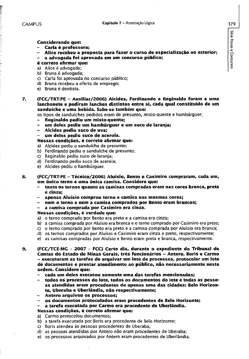 CAMPUS C ap ítu lo 7 - Associação lógica 379 Considerando que: - Carla é professora; - Alice recebeu a proposta para fazer o curso de especialização no exterior; - a advogada foi aprovada em um concurso público; é correto afirmar que: a) Alice é advogada; b) Bruna é advogada; c) Carla fo i aprovada no concurso público; d) Bruna recebeu a oferta de emprego; e) Bruna é dentista. 7. (FCC/TRT PE - Auxiliar/2006) Alcides, Ferdinando e Reginaldo foram a uma lanchonete e pediram lanches distintos entre si, cada qual constituído de um sanduíche e uma bebida. Sabe-se também que: os tipos de sanduíches pedidos eram de presunto, misto-quente e hambúrguer; - Reginaldo pediu um misto-quente; - um deles pediu um hambúrguer e um suco de laranja; - Alcides pediu suco de uva; - um deles pediu suco de acerola. Nessas condições, é correto afirmar que: a) Aícides pediu o sanduíche de presunto; b) Ferdinando pediu o sanduíche de presunto; c) Reginaldo pediu suco de laranja; d) Ferdinando pediu suco de acerola; e) Alcides pediu o hambúrguer. 8. <FCC/TRT-PE - Técnico/2006) Aluísío, Bento e Casimiro compraram, cada um, um único terno e uma única camisa. Considere que: - tanto os ternos quanto as camisas compradas eram nas cores branca, preta e cinza; - apenas Aluísio comprou terno e camisa nas mesmas cores; - nem o terno e nem a camisa comprados por Bento eram brancos; - a camisa comprada por Casimiro era cinza. Nessas condições, é verdade que: a) o terno comprado por Bento era preto e a camisa era cinza; b) a camisa comprada por Aluísio era branca e o terno comprado por Casimiro era preto; c) o terno comprado por Bento era preto e a camisa comprada por Aluísio era branca; d) os ternos comprados por Aluísio e Casimiro eram cinza e preto, respectivamente; e) as camisas compradas por Aluísio e Bento eram preta e branca, respectivamente. 9. (FCC/TCE-MG - 2007 - FCC) Certo dia, durante o expediente do Tribunal de Contas do Estado de Minas Gerais, três funcionários - Antero, Boris e Carmo - executaram as tarefas de arquivar um lote de processos, protocolar um lote de documentos e prestar atendimento ao público, não necessariamente nesta ordem. Considere que: - cada um deles executou somente uma das tarefas mencionadas; - todos os processos do iote, todos os documentos do iote e todas as pesso as atendidas eram procedentes de apenas uma das cidades: Belo Horizon te, Uberaba e Uberlândia, não respectivamente; - Antero arquivou os processos; - os documentos protocolados eram procedentes de Belo Horizonte; - a tarefa executada por Carmo era procedente de Uberlândia. Nessas condições, é correto afirmar que: a) Carmo protocolou documentos; b) a tarefa executada por Boris era procedente de Belo Horizonte; c) Boris atendeu às pessoas procedentes de Uberaba; d) as pessoas atendidas por Antero não eram procedentes de Uberaba; e) os processos arquivados por Antero eram procedentes de Uberlândia. Série Provas e C oncursos Sé rie Pr ov as e C on cu rs os 380 Raciocínio Lógico Simplificado Voi. 1 - Prof. Sérgio Carvalho e Prof. Weber Campos ELSEVIER 10. (FCC/TCE-MG/2007) Certo dia, três funcionários do Tribunal de Contas - Xa vier, Yolanda e Zenilda - cujas idades são 24, 32 e 44 anos, não necessariamen te nesta ordem, foram incumbidos da execução das seguintes tarefas: digita ção de um texto, arquivamento de processos e expedição de correspondências. Considerando que: - cada um deles executou apenas uma das tarefas e, dois a dois, eles execu taram tarefas distintas; - Zenilda tem 44 anos; - coube a Xavier cuidar da expedição de correspondências; - ao funcionário que tem 24 anos coube a digitação do texto. É correto afirmar que: a) Xavier tem 24 anos; b) Yolanda tem 32 anos; c) Yolanda tem 24 anos; d) Yolanda fo i encarregada de arquivar os processos; e) Zenilda fo i incumbida de d ig itar o texto. 11. (FCC/MPU - Técnico/2007) Nas prateleiras de uma farmácia há apenas três tipos de frascos, nos tamanhos grande, médio e pequeno, e nas cores rosa, branca e azul, não respectivamente. Sabe-se também que: cada frasco contém somente com primidos de uma mesma cor - rosa, branca ou azui entretanto, apenas os frascos grandes têm a mesma cor dos comprimidos que contêm; nem os frascos médios e nem os comprimidos que eles contêm são azuis; os frascos pequenos contêm apenas comprimidos na cor rosa. Nessas condições, é correto afirmar que os: a) frascos médios contêm comprimidos rosa e os grandes contêm comprimidos brancos; b) frascos brancos têm tamanho médio e contêm comprim idos azuis; c) comprim idos dos frascos médios são brancos e os dos frascos grandes são azuis; d) comprim idos dos frascos grandes são brancos e os dos frascos pequenos são azuis; e) frascos grandes são brancos e os médios são azuis. 12. (FCC/TCE-PB - Agente/2006) Amarildo, Bento e Clodoaido são motoristas do Tribunal de Contas e, certo mês, ao viajarem a serviço peto Estado da Paraíba, observou-se que: - um deles fez 5 viagens, enquanto que outro fez 8 e outro 10; - em suas viagens, cada um percorreu distâncias diferentes: 90,150 e 280km; - Clodoaido percorreu 280km; - aquele que percorreu 1 SOkm fez 10 viagens; - Amarildo fez S viagens. Com base nas informações dadas, é correto afirmar que: a) Bento fez 8 viagens; b) Clodoaido não fez 8 viagens; c) Amarildo percorreu 1 SOkm; d) Bento percorreu 1 SOkm; e) Amarildo não percorreu SOkm. 13. (FCC/TCE-PB - Agente/2006) Três pessoas - Alcebíades, Bonifácio e Corifeu - usam, cada qual, um único meio de transporte para se dirigir ao trabalho. Considere as seguintes Informações: - os meios de transporte que eles usam são: automóvel, ônibus e motocicleta; - as idades dos três são: 28, 30 e 35 anos; - Alcebíades vai para o trabalho de ônibus; - a pessoa que tem 28 anos usa uma motocicleta para ir ao trabalho; - Corifeu tem 35 anos. Com base nas informações dadas, é correto afirmar que: a) Bonifácio t