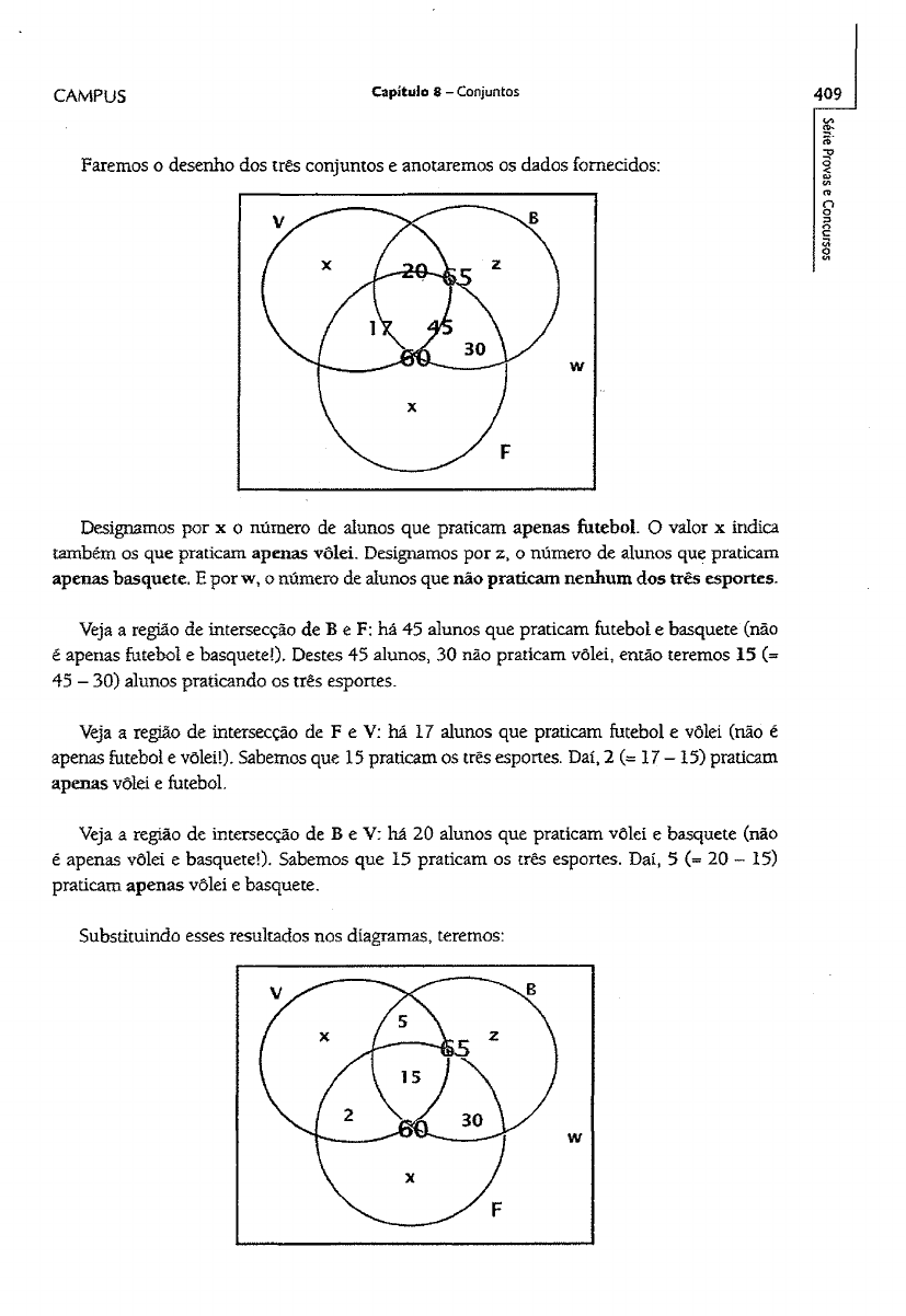 CAMPUS C ap ítu lo 8 - Conjuntos Faremos o desenho dos três conjuntos e anotaremos os dados fornecidos: Designamos por x o número de alunos que praticam apenas futebol. O valor x indica também os que praticam apenas vôlei. Designamos por z, o número de alunos que praticam apenas basquete. E por w, o número de alunos que não praticam nenhum dos três esportes. Veja a região de intersecção de B e F: há 45 alunos que praticam futebol e basquete (não é apenas futebol e basquete!). Destes 45 alunos, 30 não praticam vôlei, então teremos 15 (= 45 - 30) alunos praticando os três esportes. Veja a região de intersecção de F e V: há 17 alunos que praticam futebol e vôlei (não é apenas futebol e vôlei!). Sabemos que 15 praticam os três esportes. Daí, 2 (= 17 -1 5 ) praticam apenas vôlei e futebol. Veja a região de intersecção de B e V: há 20 alunos que praticam vôlei e basquete (não é apenas vôlei e basquete!). Sabemos que 15 praticam os três esportes. Daí, 5 (= 20 - 15) praticam apenas vôlei e basquete. Substituindo esses resultados nos diagramas, teremos: 409 Série Provas e C oncursos Sé rie Pr ov as e C on cu rs os 410 Raciocínio Lógico Simplificado Vol. 1 - Prof. Sérgio Carvalho e Prof. Weber Campos ELSEVIER Se somarmos cada uma das pequenas regiões do círculo F e igualarmos essa soma à quan tidade de elementos de F (60), teremos a seguinte igualdade: • 2 + 15 + 30 + x = 60 Resolvendo, vem: x = 13. Se somarmos cada uma das pequenas regiões do círculo B e igualarmos essa soma à quantidade de elementos de B (65), teremos a seguinte igualdade: • 5 + 15 + 30 + z = 65 Resolvendo, vem: z = 15. Ainda não usamos a informação: “ 2 1 alunos não praticam nem futebol nem vôlei” . Quem são esses alunos? São todos aqueles que estão fora dos círculos do futebol e do vôlei, ou seja, são os que praticam apenas basquete ou que não praticam nenhum dos três esportes. Igualaremos a quantidade de 21 alunos à soma das regiçoes que estão fora dos círculos do futebol e do vôlei, teremos: • z + w - 2 1 Já sabemos que z é 15. O valor de w é, então: • 15 + w = 2 1 —> w = 6 Vamos atualizar o desenho: O número total de alunos do colégio pode ser obtido pela soma de todas as regiões que aparecem no último desenho. Em vez de somar cada pequena região do desenho, é melhor escolhermos um dos círculos e somar a quantidade que está dentro dele com a que está fora dele. Escolhamos o círculo vermelho (que é o maior): CAMPUS C ap ítu lo 8 - Conjuntos • Dentro do círculo vermelho = 65 • Fora do círculo vermelho = 13 + 2 + 13 + 6 - 3 4 Portanto, o total de alunos no colégio é: • 65 + 34 = 99 Resposta: Alternativa D. 13. (FCC/ICMS-SP/2006) Numa sala de 30 alunos, 17 foram aprovados em Matemática, 10 em História, 9 em Desenho, 7 em Matemática e em História, 5 em Matemática e Desenho, 3 em História e Desenho e 2 em Matemática, História e Desenho. Sejam: v o número de aprovados em pelo menos uma das três disciplinas; w o número de aprovados em pelo menos duas das três disciplinas; x o número de aprovados em uma e uma só das três disciplinas; y o número de aprovados em duas e somente duas das três disciplinas; z o número dos que não foram aprovados era qualquer uma das três disciplinas. Os valores de v, w, x, y, z são, respectivamente: a) 30,17, 9, 7, 2; b) 30,12, 23, 3, 2; c) 23,12,11,9,7; d) 23,11,12,9,7; e) 23,11,9,7,2. Solução: De acordo com o enunciado, temos: • 30 alunos na sala; • 2 aíunos foram aprovados em Matemática, História e Desenho; • 7 em Matemática e em História; • 5 em Matemática e Desenho; • 3 em História e Desenho; • 17 em Matemática; • 10 em História; • 9 em Desenho. Definiremos os seguintes conjuntos: M = conjunto dos alunos aprovados em Matemática. H = conjunto dos alunos aprovados em História. D = conjunto dos alunos aprovados em Desenho. Representaremos por um retângulo o conjunto universo da questão, que é formado pelos 30 alunos que estão na sala. E dentro dele, desenharemos os conjuntos M ,H eD .