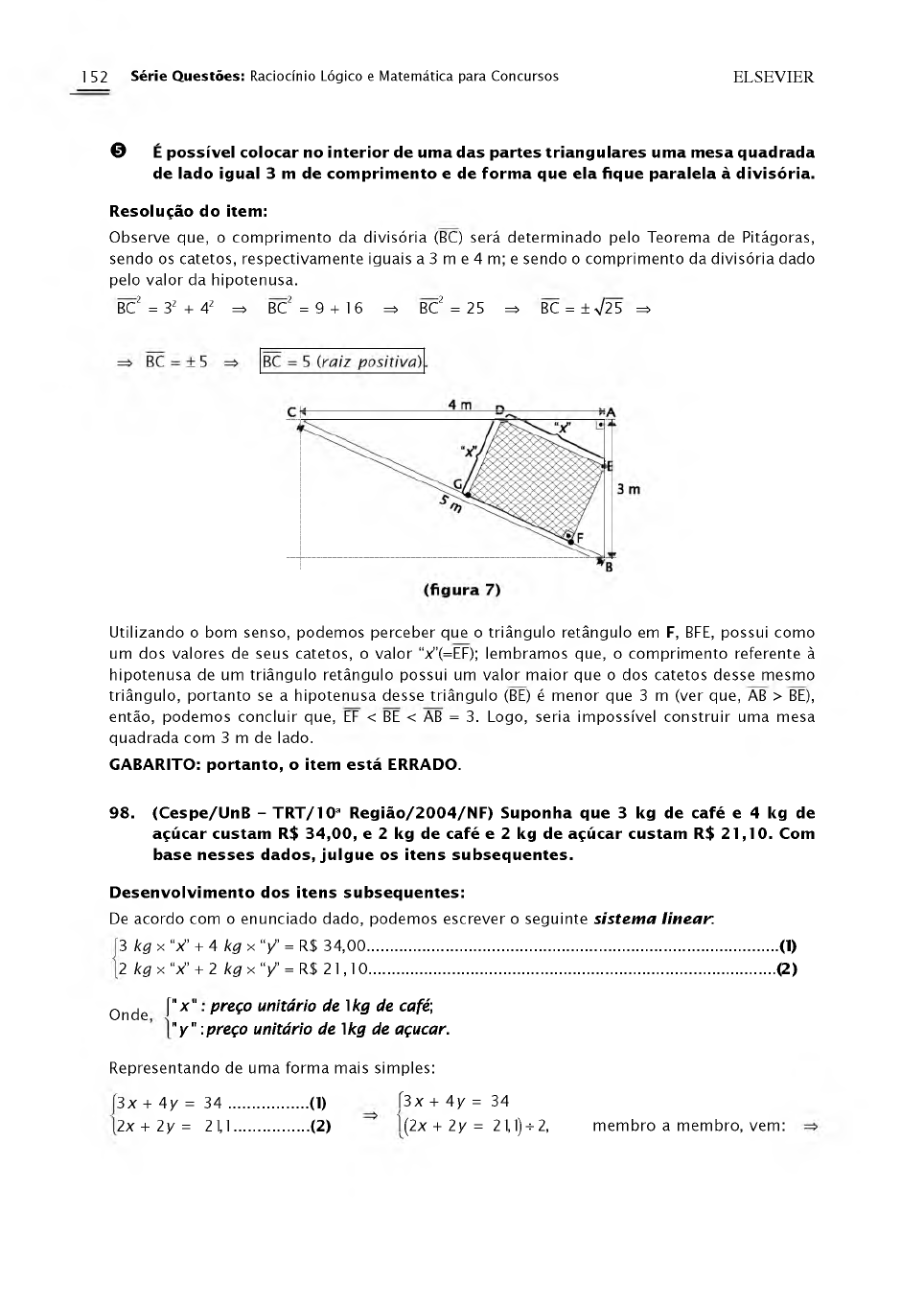 152 Série Questões: Raciocínio Lógico e Matemática para Concursos E L S E V IE R G É possível colocar no interior de uma das partes triangulares uma mesa quadrada de lado igual 3 m de com prim ento e de form a que ela fique paralela à d ivisória . Resolução do item: Observe que, o comprimento da divisória (BC) será determinado pelo Teorema de Pitágoras, sendo os catetos, respectivamente iguais a 3 m e 4 m; e sendo o comprimento da divisória dado pelo valor da hipotenusa. BC2 = 32 + 42 ^ BC2 = 9 + 16 ^ BC2 = 25 ^ BC = ±V25 ^ Utilizando o bom senso, podemos perceber que o triângulo retângulo em F, BFE, possui como um dos valores de seus catetos, o valor “x”(=EF); lembramos que, o comprimento referente à hipotenusa de um triângulo retângulo possui um valor maior que o dos catetos desse mesmo triângulo, portanto se a hipotenusa desse triângulo (BE) é menor que 3 m (ver que, AB > BE), então, podemos concluir que, EF < BE < AB = 3. Logo, seria impossível construir uma mesa quadrada com 3 m de lado. GABARITO: portanto, o item está ERRADO. 98. (Cespe/UnB - TRT/10" Região/2004/NF) Suponha que 3 kg de café e 4 kg de açúcar custam R$ 34,00, e 2 kg de café e 2 kg de açúcar custam R$ 21,10. Com base nesses dados, ju lgue os itens subsequentes. Desenvolvim ento dos itens subsequentes: De acordo com o enunciado dado, podemos escrever o seguinte sistem a linear. 3 kg x “x” + 4 kg x “y” = R$ 34,00............................................................................................. (1) 2 kg x "x” + 2 kg x "y” = R$ 21,10............................................................................................ (2) Onde í" x " ■ P reÇ ° unitário de }kg de café\ "y"-.preço unitário de ^kg de açucar. Representando de uma forma mais simples. 3 x + 4y = 3 4 ................ (1) Í3 x + 4y = 34 2x + 2y = 21,1............... (2) l ( 2x + 2y = 21,1) + 2, membro a membro, ve m : CAM PUS Capítulo 1 — Provas de Concursos Anteriores 153 x = R$ 8,20 preço unitário de 1 kg de café Substituindo esse valor encontrado para “x = R$ 8,20”, na equação, teremos: x + K = 10,55 ^ 8 , 2 0 + ^ = 10,55 ^ jt = 10,55-8,20 ^ y = R$ 2,35 preço unitario de 1 kg de açúcar O O preço de 1 kg de café é 3 vezes superior ao preço de 1 kg de açúcar. Resolução do item: 0 preço de 1 kg de café é 3 vezes superior ao preço de 1 kg de açúcar, afirmação que está CERTA, senão, vejamos: 1 kg de café custa R$ 8,20 e 1 kg de açúcar custa R$ 2,35. Se dividirmos o valor do preço de 1 kg café pelo valor do preço de 1 kg de açúcar, obteremos a seguinte relação: « ÍA 20 9 RS 2,35 “ ’ Isto significa dizer que o preço unitário de 1 kg de café é, aproximadamente, 3 vezes superior ao preço unitário de 1 kg de açúcar. Como o item afirma que é 3 vezes superior (3,49 > 3). GABARITO: este item está CERTO. e O preço de 1 kg de açúcar é in ferio r a R$ 2,20. Resolução do item: O preço de 1 kg de açúcar é inferior a R$ 2,20. GABARITO: este item está ERRADO, pois 1 kg de açúcar, calculado anteriormente, custa R$ 2,35, portanto, superior a R$ 2,20. 99. (Cespe/UnB - TRT/10" Região/2004/NF) Ju lgue os seguintes itens, que contêm situações hipotéticas acerca do número de documentos protocolados na segunda- fe ira em determ inada repartição. O Considere que o número de docum entos protocolados somado a 25 é menor que 3 vezes o número de docum entos protocolados subtraído de 21. Nesse caso, o número de docum entos protocolados é superio r a 23. Resolução do item: De acordo com o enunciado dado, podemos escrever: Seja “x” o número de documentos protocolados. Assim, teremos: “o número de documentos protocolados somado a 25 é menor que 3 vezes o número de docu mentos protocolados subtraído de 21” x + 25 < 3x - 21 154 Série Questões: Raciocínio Lógico e Matemática para Concursos E L S E V IE R Resolvendo a inequação do 1o g rau anterior: x + 25<3x-21 ^ x - 3 x < - 2 1 - 2 5 ^ (-2x < - 46) x(-l) ^ 46^ 2x >46 ^ x> — ^ |x > 23 documentos protocolados|. GABARITO: o item está CERTO, pois afirma que este número de documentos protocolados é superior a 23 (x > 23: “x” maior que 23). e Considere que 2 vezes o número de docum entos protocolados, subtraído de 70, satisfaça às seguintes condições: ■ é superior ao número de docum entos protocolados, subtraído de 29; ■ é in ferio r a 59, subtraído do número de docum entos protocolados. Então o número de docum entos protocolados é igual a 42. Resolução do item: Pelo enunciado: “x” número de documentos protocolados, logo: 2x - 70 : duas vezes o no de documentos protocolados subtraído de 70 Satisfaça as seguintes condições: 1g condição : 2x - 70 > x - 29 é superior ao n ° de documentos protocolados „ subtraído de 29 2x - 70 « <! . 2- condição : 2x - 70 <___59 - x é inferior a 59 subtraído do r>° de documentos protocolados Resolvendo as duas inequações do 1o grau, teremos: 2x - 70 > x - 29 ^ 2x - x > 70 - 29 ^ [x > 41], e 1 2x - 70 < 59 - x ^ 2x + x < 70 + 59 ^ 3x < 129 ^ x < — ^ [ x <43 ] Como o número de documentos protocolados é um número natural (inteiro positivo) e deve estar situado entre 41 e 43 (excetuando-se estes), teremos: -----O « O-------►IN 41 42 43 “x” e (41 ; 43) e “x” e IN. O único número natural situado entre os extremos “41” e “43”, vale 42. GABARITO: tornando o item CERTO. 100. (Cespe/UnB - TRT/10 '3 Região/2004/NF) Uma resm a (500 fo lhas) de papel ofício tem as seguintes dim ensões: 300 mm de comprimento, 2 dm de largura e 5 cm de altura. A respeito dessa resma, ju lgue os itens que se seguem. O Uma fo lha dessa resma, considerada como uma figura plana, tem perím etro in ferio r 7 dm.