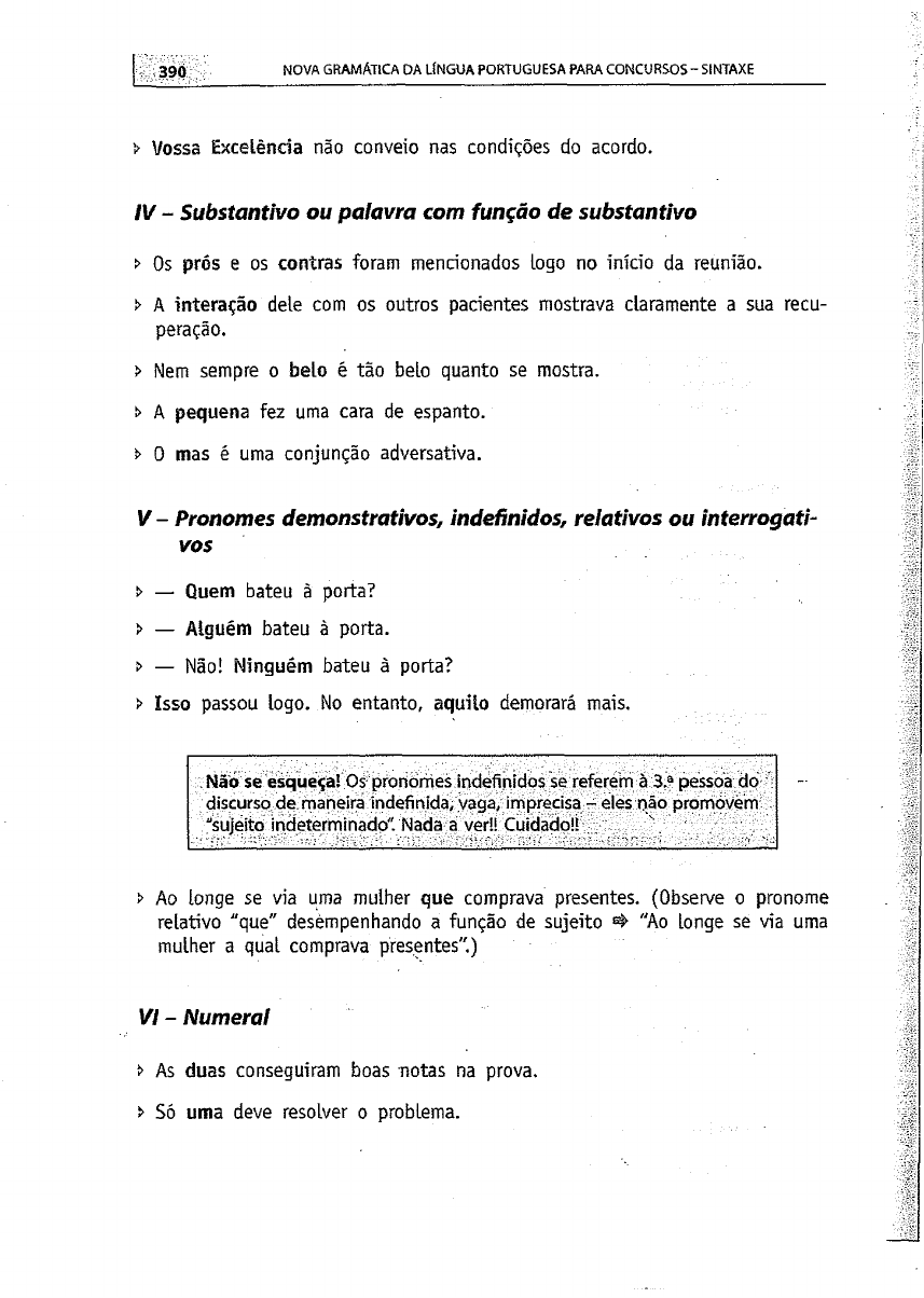 > Vossa Excelência não conveio nas condições do acordo. IV - Substantivo ou palavra com função de substantivo > Os prós e os coníras foram mencionados logo no inicio da reunião. > A interação dele com os outros pacientes mostrava claramente a sua recu peração. > Nem sempre o belo é tão belo quanto se mostra. !> A pequena fez uma cara de espanto. í> 0 mas é uma conjunção adversativa. V - Pronomes demonstrativos, indefinidos, relativos ou interrogati vos > — Quem bateu à porta? > — Alguém bateu à porta. > — Não! Ninguém bateu à porta? > Isso passou logo. No entanto, aquilo demorará mais. J .390 NOVA GRAMÁTICA DA LÍNGUA PORTUGUESA PARA CONCURSOS - SINTAXE . Nãó se esqueça! Os pronomes indefinidos se referem à 3.a pessoa do - discurso de maneira indefinida, vaga, imprecisa - eles não promovem . "sujeito indeterminado" Nada a ver!! Cuidado!! \ > Ao longe se via uma mulher que comprava presentes. (Observe o pronome relativo "que" desempenhando a função de sujeito ^ "Ao longe se via uma mulher a qual comprava presentes") VI - Numeral í> As duas conseguiram boas notas na prova. > Só uma deve resolver o problema. Capítulo 1 - SINTAXE DE ORAÇÃO-TERMOS ESSENCIAIS DA ORAÇÃO 391 1.2.1.2 CÍ Existem vários critérios para se classificar o sujeito; 1. Um desses critérios leva em conta a quantidade de núcleos do sujeito. Daí dizer-se sujeito "simples" (apenas um núcleo aparece na oração) ou "composto" (mais de um núcleo). 2. Outro considera a possibilidade de o sujeito encontrar-se expresso ou implícito. Nesse caso, classifica-se. o sujeito em determinado ou inde terminado. 3. Há também o critério que considera a prática da ação pelo sujeito: quando o sujeito é praticante da ação, denomina-se agente ou ativo; ao contrário, quando o sujeito passa a receber a ação expressa pelo verbo, é denominado sujeito passivo ou paciente. 4. Por último, existem orações que não possuem sujeito. Para elas, dassifica- -se o sujeito como inexistente (expressão condenada por alguns gramá ticos) ou, o que nos parece meihor, oração sem sujeito. Passemos agora ao estudo detalhado dos principais tipos: / - Sujeito simples Como já dissemos, é aquele em que apenas um núcleo aparece com a função de sujeito. Este núcleo pode ser exercido por um substantivo ou por qualquer palavra substantivada. Observe os exemplos extraídos de provas de concursos: > Os terrenos novos nos quais deve se aventurar o jovem de hoje são seu grande desafio. (Observe bem que as palavras em negrito funcionam como núcleos dos sujeitos dos seus respectivos verbos.) > Quando não são valorizadas, num jovem, as qualidades naturais da mocidade, ele sai prejudicado. > Quanto aos adolescentes, nenhuma, época lhes parece tão injusta quanto a nossa. // - Sujeito composto É aquele que apresenta mais de um núcleo para o sujeito. Veja: > No prato ainda constavam, após o almoço, um bocado de arroz e um pu nhado de farofa. 392 NOVA GRAMÁTICA DA LÍNGUA PORTUGUESA PARA CONCURSOS - SINTAXE > Têm existido muita família e muitos outros grupamentos sociais indignados com a atuação do governo. > 0 bolsa-escola e o programa de renda mínima, instituídos nos últimos anos pelo Governo Federal, devem garantir bons resultados sociais para o Brasil nos próximos anos. Observação: O sujeito dito composto apresenta-se, como já se disse, com mais de um núcleo. Não se trata de mais de um sujeito - é um único sujeito, que é formado com dois ou mais núcleos. Vale a pena: Dê uma "olhadinha" na forma .como se faz a concordância com o sujeito.composta . rt , . . . . , /// - Sujeito oculto / elíptico / desinencial É aquele sujeito que não se encontra expresso na oração, mas que é facilmente subentendido pela desinência verbal. > Precisamos comprar um novo carro. (Sujeito = nós) > Hoje estou aqui para conversarmos um pouco sobre política monetária. (Su jeitos = eu para o verbo "estar" e nós para o verbo conversar). > Retira-te agora, criatura miserável! (Sujeito oculto = tu). & Cuidado neste exemplo: observe qúe o verbo se encontra no imperativo afirmativo. > "Adestrai-vos, e conquistai força física e moral" (Olavo Bilac) (Sujeito = vós) IV - Sujeito indeterminado No bom jargão dos professores: a partir de agora a atenção precisa ser redobrada. Muitas bancas de concursos exploram o sujeito indeterminado em suas questões de concordância verbal. Conselho de amigo / Dica de estudo: Sie 6 amigó éstüdantecriãò tiver segürança ou não se iembrar direito do assunto "transitividade verbal'rsúgiro quê: primeiro f̂áçà. unna r̂evisão desse.̂ assunto para;' depois aderitrar o conteúdo abaixo. Você precisa ter uma boa noção de transitividade para poder identificar o sujeito. ' :
