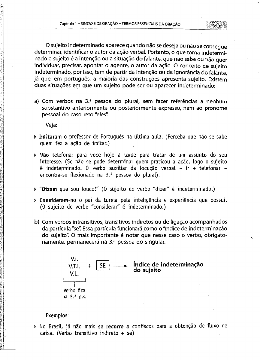 Capítulo 1 - SINTAXE DE ORAÇÃO - TERMOS ESSENCiAIS DA ORAÇÃO •393\ O sujeito indeterminado aparece quando não se deseja ou não se consegue determinar, identificar o autor da ação verbal. Portanto, o que torna indetermi nado o sujeito é a intenção ou a situação do falante, que não sabe ou não quer individuar, precisar, apontar o agente, o autor da ação. O conceito de sujeito indeterminado, por isso, tem de partir da intenção ou da ignorância do falante, já que, em português, a maioria das construções apresenta sujeito. Existem duas situações em que um sujeito pode ser ou aparecer indeterminado: a) Com verbos na 3.a pessoa do plural, sem fazer referências a nenhum substantivo anteriormente ou posteriormente expresso, nem ao pronome pessoal do caso reto "eles" Veja: > imitaram o professor de Português na última aula. (Perceba que não se sabe quem fez a ação de imitar.) > Vão telefonar para você hoje à tarde para tratar de um assunto do seu interesse. (Se não se pode determinar quem praticou a ação, logo o sujeito é indeterminado. 0 verbo auxiliar da locução verbal -' ir + telefonar - encontra-se flexionado na 3.a pessoa do plural). > "Dizem que sou loucoí" (0 sujeito do verbo "dizer" é indeterminado.) > Consideram-no o pai da turma pela inteligência e experiência que possui. (0 sujeito do verbo "considerar" é indeterminado.) b) Com verbos intransitivos, transitivos indiretos ou de ligação acompanhados da partícula "se". Essa partícula funcionará como o "índice de indeterminação do sujeito" O mais importante é notar que nesse caso o verbo, obrigato riamente, permanecerá na 3.a pessoa do singular. V.I. V.T.l. + V.L SE _► índice de indeterminação do sujeito Verbo fica na 3.a p.s. Exemplos: > No Brasil, já não mais se recorre a confiscos para a obtenção de fluxo de caixa. (Verbo transitivo indireto + se) 394 NOVA GRAMÁTICA DA LÍNGUA PORTUGUESA PARA CONCURSOS - SINTAXE » Na apresentação dele, desconfiava-se dos acordos que eLe propunha. (Verbo transitivo indireto + se) > Os Livros dos quais se precisava foram doados para uma "instituição de ca ridade. (Cuidado para não dizer dos quais se precisavam..." ^ 0 verbo é transitivo indireto e está acompanhado do pronome "se") > Cria-se mais nas palavras do membro do que nas palavras do Líder espiritual da igreja. (Verbo transitivo indireto + se) > Tratava-se de problemas de difícil resolução. (Verbo transitivo indireto + se) > Era-se mais feliz noutros tempos. (Verbo de ligação + se) > Come-se muito bem em diversas regiões do Brasil. (Verbo intransitivo + se) > "Escorrega-se no sangue, tropeça-se sobre cadáveres, mas a luta continua ardentemente acesa." (Visconde de Ouro Preto). (Verbos intransitivos + se) * Observações: a) Atente para os termos "a confiscos", "dos acordos", "dos quais" "nas palavras" e "de problemas" dos cinco primeiros exemplos acima. Eles funcionam como objetos indiretos para os seus respectivos verbos. b) Quem literalmente promove a indeterminação do sujeito é a partícula "se". Se ela for retirada, passa-se a ter sujeitos ocultos, elípticos. c) Procure imediatamente correlacionar o estudo do sujeito indetermi nado com o estudo do sujeito passivo ou paciente. Muitas questões exploram essa distinção. É básico para um candidato diferenciar um índice de indeterminação do sujeito de uma pa*$ícula ou pronome apassivador. V - Sujeito passivo ou paciente (a partícula ou pronome apassivador) Dica; Procure correlacionar o conteúdo do sujeito passivo ou paciente com o assunto "a voz passiva". Um dos casos mais explorados em concursos públicos e vestibulares é a concordância com o sujeito passivo ou paciente. Para qüe se faça a perfeita harmonização entre o verbo e o seu sujeito, convém primeiro saber identificar esse tipo de sujeito e diferenciá-lo de outros tipos, notadamente do sujeito indeterminado. Capítulo 1 - SiNTAXE DE ORAÇÃO -TERMOS ESSENCIAIS DA ORAÇÃO S3Í j Í | | Compare: > Come-se bem no interior de muitas capitais brasileiras. (Sujeito indetermi nado ^ VI + SE) > Come-se bem, no interior de muitas capitais brasileiras, pratos bastante requintados. (Erro comum!!!) (Sujeito passivo ou paciente = pratos). Perceba que no primeiro exempio não se diz o que se come - o verbo, portanto, está empregado comó intransitivo. A estrutura apenas faz referências à ação de comer de forma genérica. Logo, indeterminou-se o sujeito. Já no segundo caso, o que se está comendo são "pratos bastante requintados", termo que representa o sujeito da oração. No caso acima, estamos diante de uma voz passiva sintética, formada de um VTD + SE. Logo, o verbo deve obrigatoriamente concordar com este sujeito. A frase correta será: > Comem-se bem, no interior de muitas capitais brasileiras, pratos bastante requintados. Outros exemplos de sujeitos passivos ou pacientes: » Estão sendo avaliadas pela banca todas as monografias entregues no dia 30. (Sujeito passivo « as monografias. Estamos diante de uma voz passiva analítica.) > Eleger-se-ão os novos diretores do clube no próximo domingo. (Sujeito passivo «■ os novos diretores. Aqui a voz passiva é sintética.) >. Seria ‘de se esperar que se associassem à moderna tecnologia apenas os be nefícios reais, que a ela se tributassem tão somente vantagens inequívocas. (Sujeitos passivos * os benefícios reais; vantagens inequívocas.) > Não se delegue às escolas a missão exclusiva de preparar os jovens para sua inserção no mercado de trabalho. (Núcleo do sujeito passivo = missão.) > Não se impute aos adolescentes de hoje a exclusiva responsabilidade pelo fato, lastimável, de aspirarem a tão pouco. (Sujeito passivo = aexclusiva responsabilidade.) > Ê muito difícil que se cumpram os propósitos que se formulam a cada início de ano. (Sujeitos passivos = os propósitos; que - pronome relativo.)