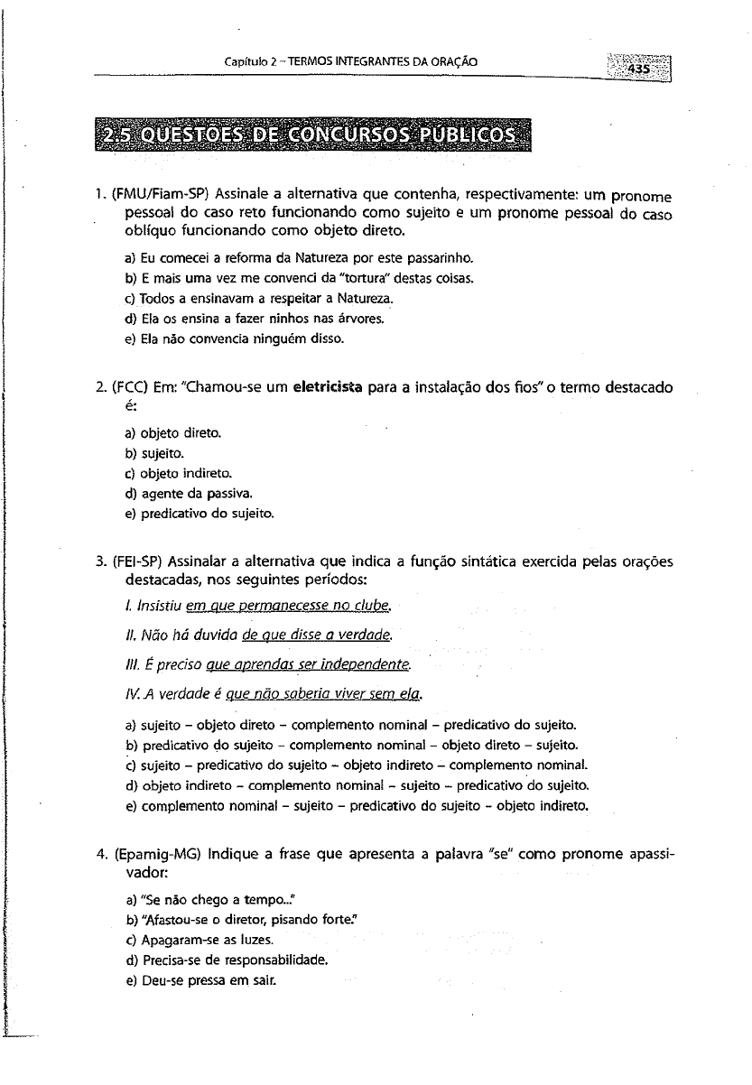 Capítulo 2 -TERMOS INTEGRANTES DA ORAÇÃO l # | § p Í 3 1. (FMU/Fiam-SP) Assinale a alternativa que contenha, respectivamente: um pronome pessoal do caso reto funcionando como sujeito e um pronome pessoa! do caso oblíquo funcionando como objeto direto. a) Eu comecei a reforma da Natureza por este passarinho. b) E mais uma vez me convenci da "tortura" destas coisas, ç) Todos a ensinavam a respeitar a Natureza. d) Ela os ensina a fazer ninhos nas árvores, e} Eia não convencia ninguém disso. 2. (FCC) Em: "Chamou-se um eletricista para a instalação dos fios" o termo destacado é: a) objeto direto. b) sujeito. c) objeto indireto. d) agente da passiva. e) predicativo do sujeito. 3. (FEl-SP) Assinalar a alternativa que indica a função sintática exercida pelas orações destacadas, nos seguintes períodos: I. Insistiu em que permanecesse no clube. II. Não há duvida de que disse a verdade. III. é preciso aue aprendas ser independente. IV A verdade é que não saberia viver sem ela. a) sujeito - objeto direto - complemento nominal - predicativo do sujeito. b) predicativo do sujeito - complemento nominal - objeto direto - sujeito. c) sujeito - predicativo do sujeito - objeto indireto - complemento nominal, d} objeto indireto - complemento nominal - sujeito - predicativo do sujeito, e) complemento nominal - sujeito - predicativo do sujeito - objeto indireto. 4. (Epamig-MG) Indique a frase que apresenta a palavra "se" como pronome apassi vador: a) "Se não chego a tempo..." b) "Afastou-se o diretor, pisando forte." c) Apagaram-se as luzes. d) Precisa-se de responsabilidade. e) Deu-se pressa em sair. |” ' 436 NOVA GRAMÁTICA DA LÍNGUA PORTUGUESA PARA CONCURSOS - SINTAXE 5. (FOC-SP) No período:"Falsos conceitos, meia ciência por parte de professores, compli cação e pedantismo de nomenclatura vazia, tudo isso produziu e produz nos alunos uma sadia aversão pela 'análise lógica'". A expressão pela analise lógica é: a) adjunto adnominai. b) agente da passiva. c) complemento nominal. d) objeto indireto. 6. (UEL-PR) Assinale a alternativa correspondente ao período em que há agente da passiva. a) O rapaz foi preso por um investigador, compadre do Bertoião. b) O coração não resistiu à prova. c) Não o sabíamos doente. d) Tão grande e forte, não era resistente à bebida. e) Seu apartamento fora interditado poucas horas depois do crime. 7. {Febasp) "E agora, José? A festa acabou A luz apagou O povo sumiu A noite esfriou..." (Carlos Drummond de Andrade) Em relação aos verbos destacados, pode-se afirmar que: a) os verbos são todos transitivos diretos e estão no pretérito imperfeito. b) os verbos são todos transitivos diretos, embora o objeto direto não esteja expresso; e os verbos estão no pretérito perfeito. c) o primeiro e o segundo verbos são transitivos diretos e os últimos são transitivos indiretos e estão no pretérito mais-que-perfeito. d) todos os verbos destacados são intransitivos e estão no pretérito perfeito. 8. (UFU-MG) No período "Quando enxotada por mim foi pousar na vidraça", qual a função sintática de por mim? a) objeto direto. b) sujeito. c) objeto indireto. d) complemento nominal. e) agente da passiva. 9. (ESPM-SP) Não me preocupa o futuro. Julgo-me capaz de enfrentar qualquer dificul dade. Os termos destacados são, respectivamente: a) sujeito - objeto direto - objeto direto - objeto indireto. b) objeto indireto - objeto direto - objeto indireto - complemento' nominal. Capítulo 2 - TERMOS INTEGRANTES DA ORAÇÃO :437 c) objeto direto - objeto direto ~ predicativo do objeto - adjunto adnominal. d) objeto indireto - sujeito - sujeito - objeto direto. e) objeto direto - sujeito - predicativo do objeto - objeto direto. 10. (FMU-SP) Observe os termos destacados: Alugam-se vagas. Precisa-se de faxineiros. Paraibana expansiva machucou-se. Eles exercem, respectivamente; a função sintática de: a) objeto direto, objeto indireto, objeto direto, b} sujeito, sujeito, sujeito. c) sujeito, objeto indireto, objeto direto. d) sujeito, objeto indireto, sujeito. e) sujeito, sujeito, objeto direto. 1 -D 2 — B 3-D 4-C 5-C 6 - A 7-D 8-E 9-E 10-D Acesse o portal de material complementar do GEN - o GEN-io - para ter acesso a diversas questões de concurso público sobre este assunto: <http://gen-io.grupogen.com.br>. http://gen-io.grupogen.com.br