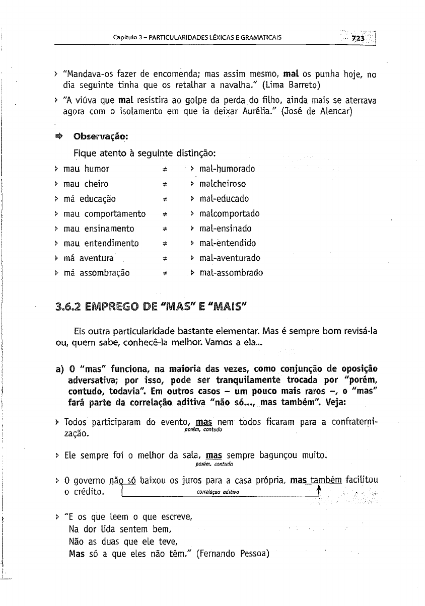 Capítulo 3 - PARTICULARIDADES LÉXICAS E GRAMATICAIS 723 > "Mandava-os fazer de encomenda; mas assim mesmo, mal os punha hoje, no dia seguinte tinha que os retalhar a navalha." (Lima Barreto) > "A viúva que mal resistira ao golpe da perda do filho, ainda mais se aterrava agora com o isolamento em que ia deixar Aurélia/' (José de Alencar) Observação: Fique atento à seguinte distinção: > mau humor * > mal-humorado > mau cheiro * > malcheiroso s> má educação * > mal-educado > mau comportamento * > matcom portado ̂ mau ensinamento * > mal-ensinado > mau entendimento * > mal-entendido má aventura . ' * í> maL-aventurado > má assombração * > mal-assombrado 3.6.2 EMPREGO DE "M A S " E "M A IS " Eis outra particularidade bastante elementar. Mas é sempre bom revisá-la ou, quem sabe, conhecê-la melhor. Vamos a ela». a) 0 "mas" funciona, na maioria das vezes, como conjunção de oposição adversativa; por isso, pode ser tranquilamente trocada por "porém, contudo, todavia". Em outros casos - um pouco mais raros -, o "mas" fará parte da correlação aditiva "não só..., mas também" Veja: > Todos participaram do evento, mas nem todos ficaram para a confraterni- - porém, contudo ZdÇdO. > Ele sempre foi o melhor da sala, mas sempre bagunçou muito. porém, contudo > 0 governo não só baixou os juros para a casa própria, mas também facilitou O C ré d itO . ___________________ correlação aditivo____________________ ^ r'E os que leem o que escreve, Na dor lida sentem bem, Não as duas que ele teve, Mas só a que eles não têm." (Fernando Pessoa) 724; NOVA GRAMÁTICA DA LÍNGUA PORTUGUESA PARA CONCURSOS - PARTE ESPECIAL » "Lembrou-se da mulher, mas repeliu logo esta ideia com escrupulosa repug nância. Continuava a odiá-la." (Aluísio Azevedo) > "Fique então sabendo de que não é só a ela que você fez o obséquio, mas também ao marido." (Aluísio Azevedo) ^ Observação: Em algumas situações, o "mas" funciona tão somente como uma palavra denotativa de ênfase ou de situação. Não transmite o sentido de oposição adversativa, por isso não poderá ser substituída por "porém, contudo, todavia "Veja: > Mas quem afinal chegou à nossa festa? > Mas que "belos" políticos nós temos hoje em dia! b) 3á o "mais" funciona ora como advérbio de intensidade, quando modi fica verbos, adjetivos ou outros advérbios, ora funciona como pronome indefinido, quando se refere a substantivos. Observe: > Os Silvas sempre dispuseram de mais recursos e mais informações. pronomes indefinidos > Aqueles alunos precisavam estudar mais para poder ingressar em um con curso advérbio de intensidade > Eles agora sentiram mais vontade de estudar do que antes. pronome indefinido > Ele sempre quis trabalhar mais para melhorar a situação financeira da fa- advérbio de intensidade > "Desde o palácio até a taberna e o prostíbulo, desde o mais esplêndido viver até o vegetar do vulgacho mais rude, todos os lugares e todas as condições têm tido o seu romancista." (A. Herculano) > "Não ficara ela incólume da ferida que fizera no coração do vizinho: amou-o também, e com mais seriedade 'que a usual nos seus anos." (Camilo C. Branco) 3.7.1 EMfPTOGO DE "A FBM" E "AFIM" \ Eis, mais uma vez, um conhecimento básico, elementar. Vamos a ele... Capítulo 3 - PARTICULARIDADES LÉXICAS E GRAMATICAIS 725 a) Emprega-se "a fim", separado (na maioria das vezes você usará esta forma), quando este fizer parte da locução prepositiva "a fim de" ou da locução conjuntiva "a fim de que" Em ambos os casos, as locuções denotarão "finalidade, objetivo, meta". Veja: s> Na sala, ninguém estava a fim de fazer nada. > A fim de que ela passasse no concurso, comprei novos livros. > "Não. tardam os cavaleiros zenetas que vêm ajuntar-se nas atalaias convosco, a fim de que nenhum infiel possa escapar." (A. Herculano) > "De feito, a boa velha tentou por diversas vezes escrever seu testamento a fim de garantir o futuro de sua escravinha." (Bernardo Guimarães) ^ Observação: A locução prepositiva "a fim de" eqüivale a "para" Portanto, se tiver alguma dúvida, faça a substituição. b) Por outro lado, a forma "afim" (junto) é morfologicamente um adjetivo e significa "algo que é semelhante, que é próximo, que possui afinidade" > Na grade escolar, Biologia e Química são matérias afins. > João e Pedro tinham temperamentos afins. » Eles são parentes afins. 3,7.2 BM m &m DE "SE QUER" g "SEQUER" Eis outra particularidade simples da nossa língua, mas que merece toda a nossa atenção, pois de vez em quando aparece aqui e acolá nas provas de alguns certames. Vamos a ela... a) Â forma separada "se quer" é representada pela conjunção condicional "se" seguida do verbo "querer" flexionado na 3„a pessoa do singular do futuro do subjuntivo. Nesse caso, a expressão "se quer" eqüivalerá a "se desejar" e ocorrerá em orações hipotéticas, condicionais. Veja: > Se quer passar em um concurso, estude muito. > "Diga ao cocheiro que pare; ou, se quer, pode apear-se no largo da Carioca." (Machado de Assis) > Em porção, o senhor sabe que... É isso... Enfim, se quer, mande-os..." (Lima Barreto)