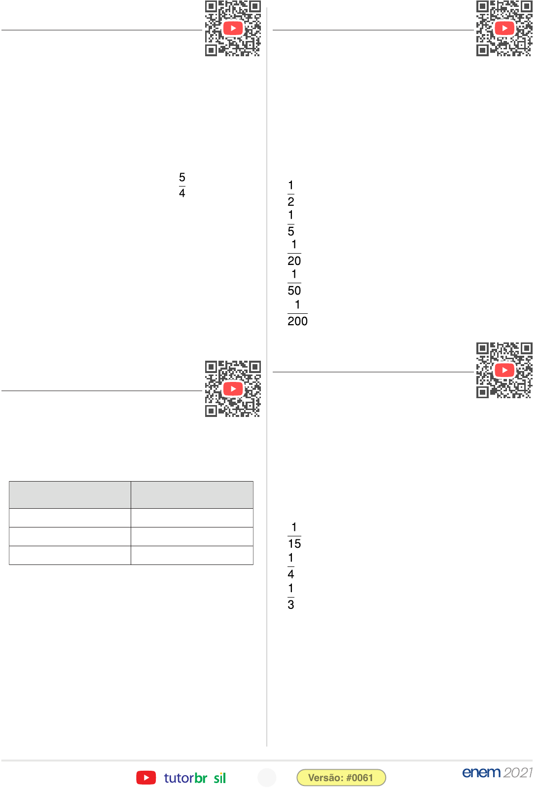 ENEM 2017.3 - Lib 163 Versão: #0061 Extensivocurso.profcaju.com.bra/ Questão 164 http://ttb.me/enem2017libras164 Um reservatório de água com capacidade para 20 mil litros encontra-se com 5 mil litros de água num instante inicial (t ) igual a zero, em que são abertas duas torneiras. A primeira delas é a única maneira pela qual a água entra no reservatório, e ela despeja 10 L de água por minuto; a segunda é a única maneira de a água sair do reservatório. A razão entre a quantidade de água que entra e a que sai, nessa ordem, é igual a . Considere que Q(t ) seja a expressão que indica o volume de água, em litro, contido no reservatório no instante t, dado em minuto, com t variando de 0 a 7 500. A expressão algébrica para Q(t ) é A 5 000 + 2t B 5 000 − 8t C 5000 − 2t D 5000 + 10t E 5000 − 2,5t Questão 165 http://ttb.me/enem2017libras165 Um projeto para incentivar a reciclagem de lixo de um condomínio conta com a participação de um grupo de moradores, entre crianças, adolescentes e adultos, conforme dados do quadro. Participantes Número de pessoas xsaçnairC Adolescentes 5 01sotludA Uma pessoa desse grupo foi escolhida aleatoriamente para falar do projeto. Sabe-se que a probabilidade de a pessoa escolhida ser uma criança é igual a dois terços. Diante disso, o número de crianças que participa desse projeto é A 6. B 9. C 10. D 30. E 45. Questão 166 http://ttb.me/enem2017libras166 Um estudante elaborou uma planta baixa de sua sala de aula. A sala, com forma de retângulo, tem lados medindo 9 m e 5,5 m. No desenho feito pelo estudante, os lados da figura mediam 18 cm e 11 cm. A fração que representa a razão entre as medidas dos lados da figura desenhada e as medidas dos lados do retângulo que representa a sala original é A . B . C . D . E . Questão 167 http://ttb.me/enem2017libras167 Um andarilho subiu uma montanha por uma trilha sinuosa. Essa trilha possui 100 metros de trechos íngremes e 1 400 metros de trechos suaves. Um escalador subiu essa mesma montanha por uma via de escalada vertical de 400 metros e uma trilha de trecho suave de 100 metros. A razão entre a distância de subida da montanha do escalador em relação à do andarilho é A . B . C . D 3. E 14. http://curso.profcaju.com.br https://www.youtube.com/tutorbrasil http://ttb.me/enem2017libras164 http://ttb.me/enem2017libras164 http://ttb.me/enem2017libras165 http://ttb.me/enem2017libras165 http://ttb.me/enem2017libras166 http://ttb.me/enem2017libras166 http://ttb.me/enem2017libras167 http://ttb.me/enem2017libras167 ENEM 2017.3 - Lib 164 Versão: #0061 Extensivocurso.profcaju.com.bra/ Questão 168 http://ttb.me/enem2017libras168 Com o objetivo de reformar os tambores cilíndricos de uma escola de samba, um alegorista decidiu colar adereços plásticos na forma de losango, como ilustrado na Figura 1, nas faces laterais dos tambores. Nesta colagem, os vértices opostos P e Q do adereço deverão pertencer às circunferências do topo e da base do tambor cilíndrico, respectivamente, e os vértices opostos R e S deverão coincidir após a colagem do adereço no tambor, conforme ilustra a Figura 2. Considere que o diâmetro do cilindro correspondente ao tambor meça 0,4 metro. Utilize 3,1 como aproximação para π. P P R S Q Q S R Figura 1 Figura 2 A diagonal RS do adereço a ser confeccionado pelo alegorista deve medir, em metro, A 0,124. B 0,400. C 0,496. D 1,240. E 2,480. Questão 169 http://ttb.me/enem2017libras169 Atualmente, a massa de uma mulher é 100 kg. Ela deseja diminuir, a cada mês, 3% da massa que possuía no mês anterior. Suponha que ela cumpra sua meta. A sua massa, em quilograma, daqui a dois meses será A 91,00. B 94,00. C 94,09. D 94,33. E 96,91. Questão 170 http://ttb.me/enem2017libras170 Medir distâncias sempre foi uma necessidade da humanidade. Ao longo do tempo fez-se necessária a criação de unidades de medidas que pudessem representar tais distâncias, como, por exemplo, o metro. Uma unidade de comprimento pouco conhecida é a Unidade Astronômica (UA), utilizada para descrever, por exemplo, distâncias entre corpos celestes. Por definição, 1 UA equivale à distância entre a Terra e o Sol, que em notação científica é dada por 1,496 × 102 milhões de quilômetros. Na mesma forma de representação, 1 UA, em metro, equivale a A 1,496 × 105 m. B 1,496 × 106 m. C 1,496 × 108 m. D 1,496 × 1010 m. E 1,496 × 1011 m. Questão 171 http://ttb.me/enem2017libras171 Foi utilizado o plano cartesiano para a representação de um pavimento de lojas. A loja A está localizada no ponto A(1; 2). No ponto médio entre a loja A e a loja B está o sanitário S, localizado no ponto S(5; 10). Determine as coordenadas do ponto de localização da loja B. A (− 3; − 6). B (− 6; − 3). C (3; 6). D (9; 18). E (18; 9). http://curso.profcaju.com.br https://www.youtube.com/tutorbrasil http://ttb.me/enem2017libras168 http://ttb.me/enem2017libras168 http://ttb.me/enem2017libras169 http://ttb.me/enem2017libras169 http://ttb.me/enem2017libras170 http://ttb.me/enem2017libras170 http://ttb.me/enem2017libras171 http://ttb.me/enem2017libras171 ENEM 2017.3 - Lib 165 Versão: #0061 Extensivocurso.profcaju.com.bra/ Questão 172 http://ttb.me/enem2017libras172 Um modelo de automóvel tem seu valor depreciado em função do tempo de uso segundo a função f (t ) = b · at, com t em ano. Essa função está representada no gráfico. 60 000 54 000 43 740 39 366 0 1 2 3 4 5 6 Tempo de uso (ano) V al o r d o a u to m ó ve l ( R $) Qual será o valor desse automóvel, em real, ao completar dois anos de uso? A 48 000,00. B 48 114,00. C 48 600,00. D 48 870,00. E 49 683,00. Questão 173 http://ttb.me/enem2017libras173 Na bula de um analgésico, encontra- se o quadro com a dosagem desse remédio, de acordo com a massa corporal do paciente. Massa corporal Quantidade de gotas por dose Dosagem máxima diária 16 a 23 5 a 15 60 24 a 30 8 a 20 80 31 a 45 10 a 30 90 46 a 53 15 a 35 100 Acima de 5